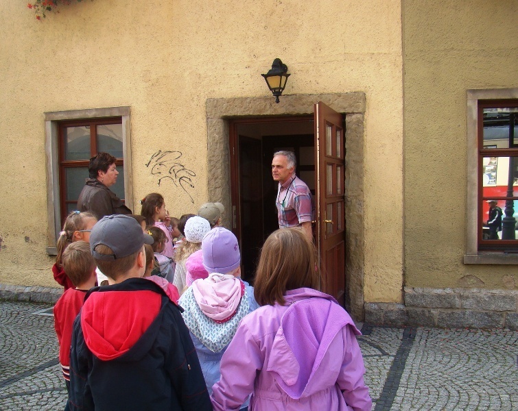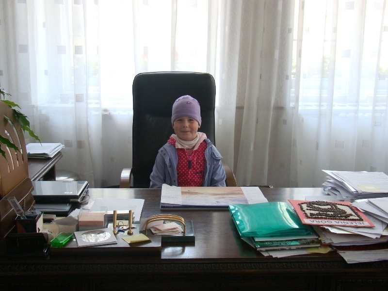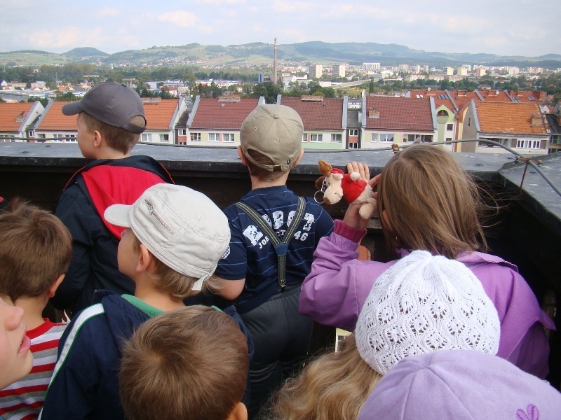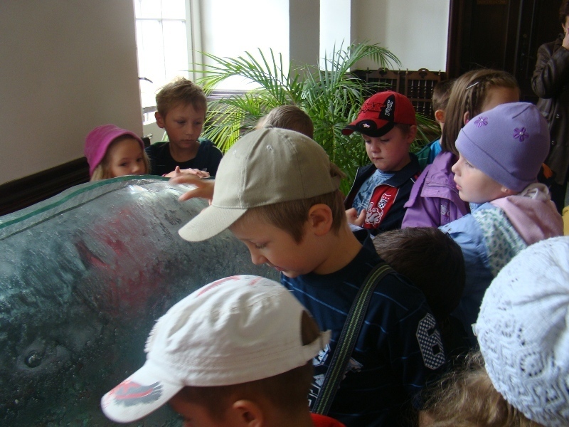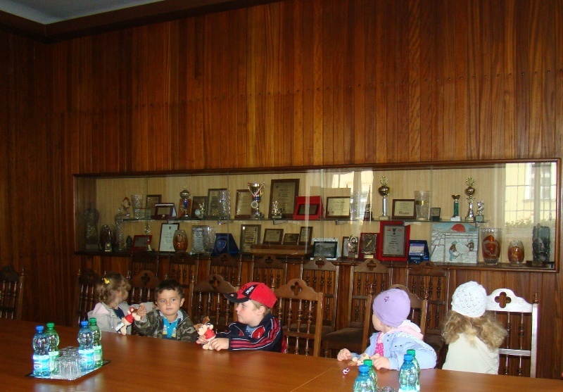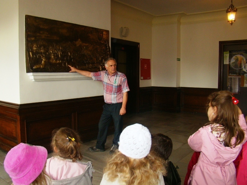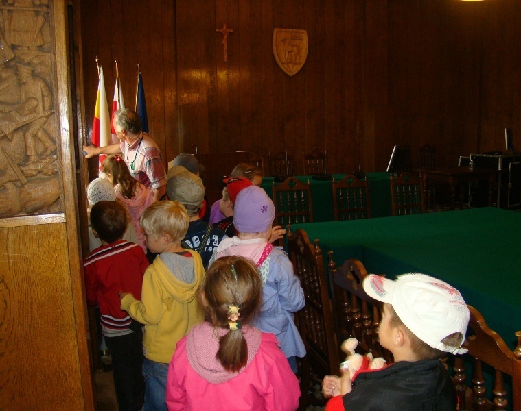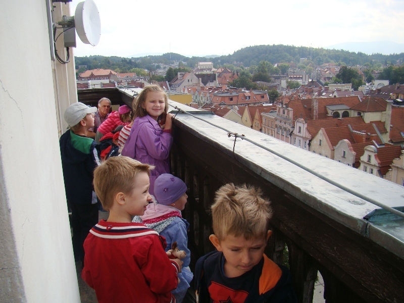 Na samym początku oglądaliśmy eksponaty wystawione w korytarzach urzędu, min.: stary dzwon, replikę lodowego niedźwiedzia i wspaniałego jelenia z porożem, który jest herbem miasta. W dalszej części naszej wycieczki widzieliśmy salę obrad, w której odbywają się spotkania radnych, gabinet pana Prezydenta Miasta z rzeźbioną szafą z zabytkowym zegarem oraz salę, gdzie wystawione są puchary i nagrody zdobyte przez jeleniogórzan. Jednak największa niespodzianka czekała nas na końcu wycieczki. Po przebyciu około stu schodów, znaleźliśmy się na wieży samego Ratusza, tuż pod tarczą zegara. Wejście na szczyt wymagało od nas nie lada odwagi a rozciągający się przed nami widok panoramy miasta Jeleniej Góry, zaparł nam dech w piersiach. Uwieńczeniem naszej wycieczki, stał się hejnał Jeleniej Góry, odegrany na cztery strony świata. Wrażeniom nie było końca.