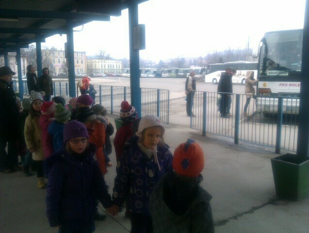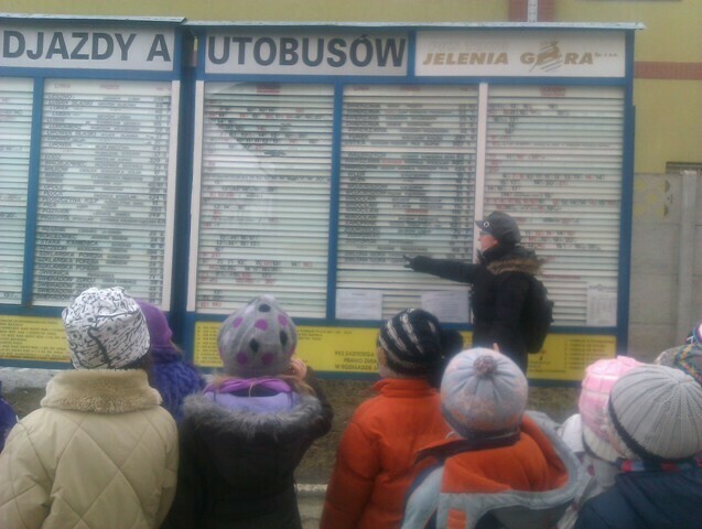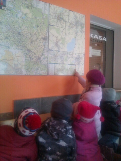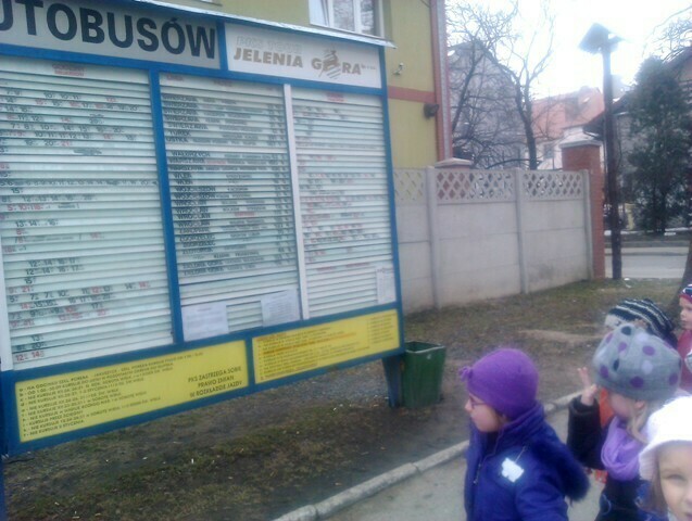 W drodze do przedszkola zajrzeliśmy na pobliski dworzec autobusowy. Zapoznaliśmy się z rozkładem jazdy, wyglądem poczekalni oraz kasą biletową. Następnie odwiedziliśmy perony, z których odjeżdżają autobusy pełne pasażerów. My też chcieliśmy się wybrać w podróż, ale pani wytłumaczyła nam, że nie zdążymy wrócić na obiad. Tego dnia były naleśniki, więc wyjazd odłożyliśmy na później.
