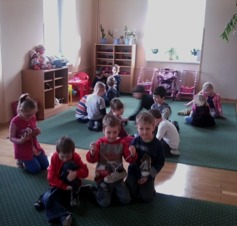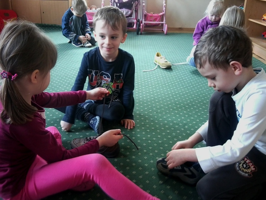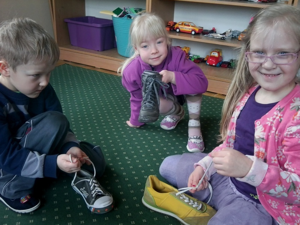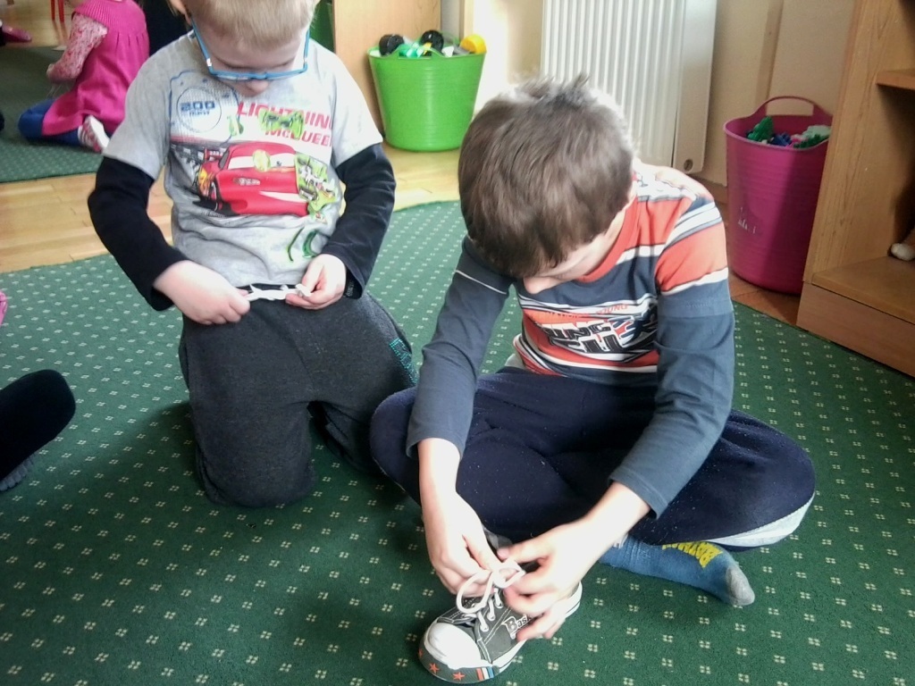 W ostatnim tygodniu dzieci z najstarszej grupy starały się opanować pewną bardzo trudną umiejętność - wiązanie sznurowadeł. Niektórzy z nas już to potrafili, więc w tym dniu pełnili rolę pomocników pani nauczycielki. Natomiast pozostałe dzieci w pełnym skupieniu obserwowały jak należy wykonywać tą czynność. Na samym początku układaliśmy uszy zająca, które po złączeniu razem tworzyły dziurkę przez która przewlekaliśmy jedno ucho. Niby wydaję się to proste, ale nam Chochlikom przysporzyło to trochę trudności. Na szczęście mieliśmy więcej czasu na ćwiczenie tej czynności więc większość z nas mogła się pochwalić rodzicom nową umiejętnością. Teraz każdego dnia ćwiczymy wiązanie sznurowadeł i wychodzi to nam coraz lepiej.