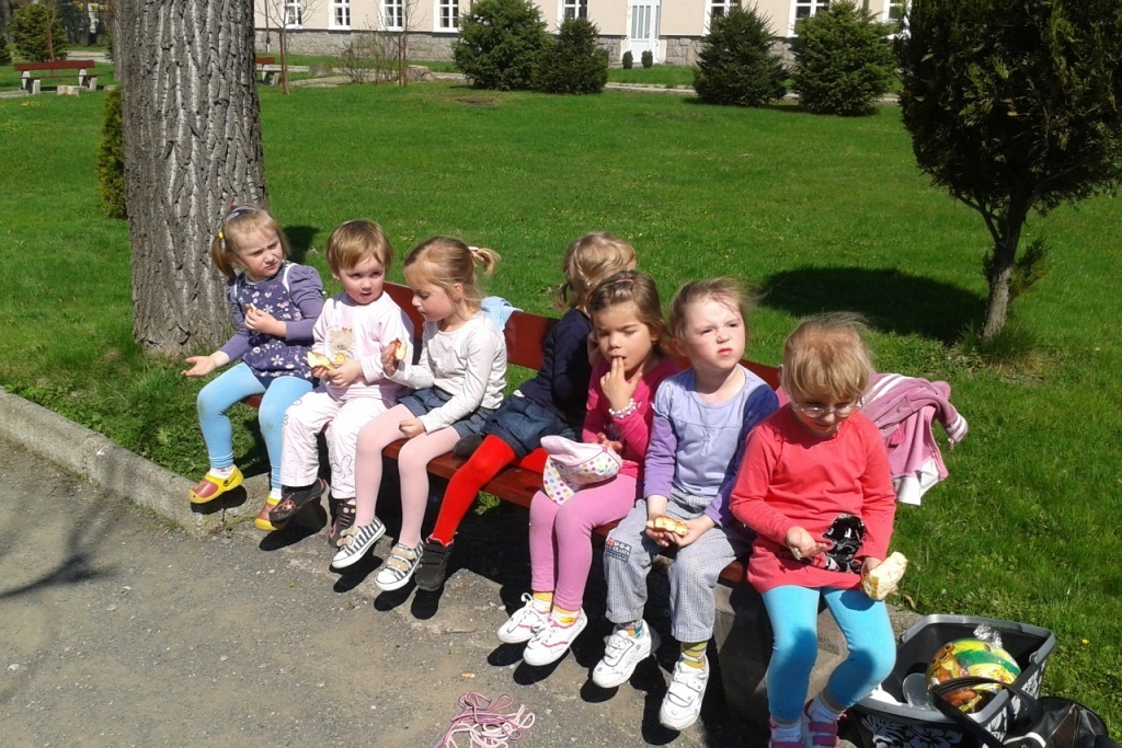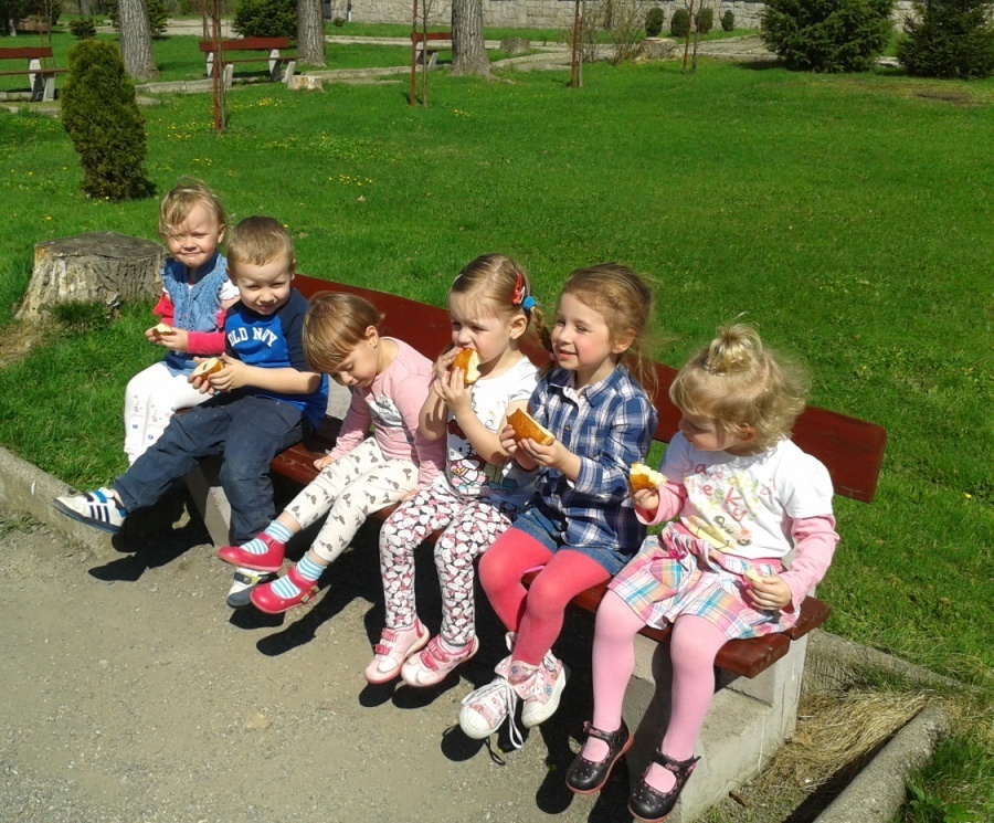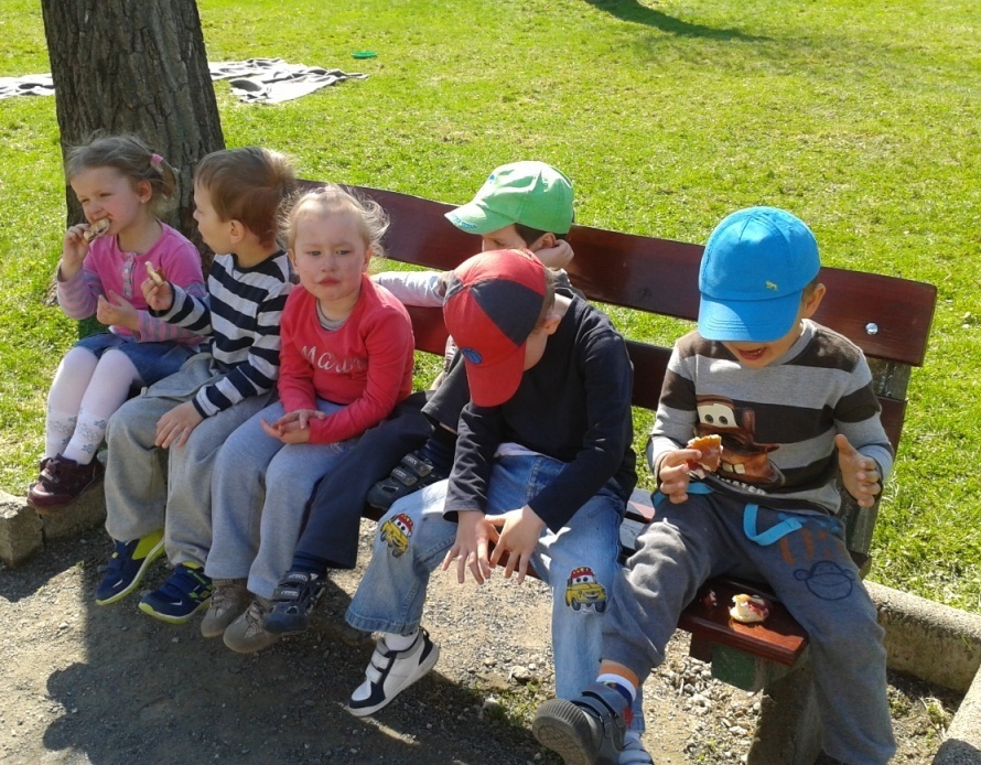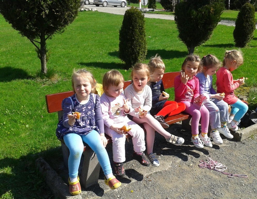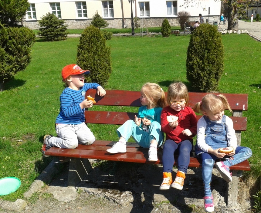 Punktualnie o godzinie 11.00 przedszkolaki dostały ich pierwsze na świeżym powietrzu drugie śniadanie. Była to dla nich nie lada atrakcja, z utęsknieniem wyczekiwana od momentu wyjścia z przedszkola.