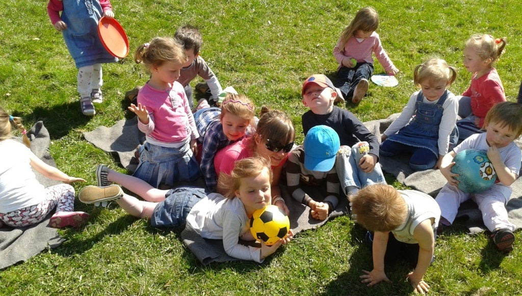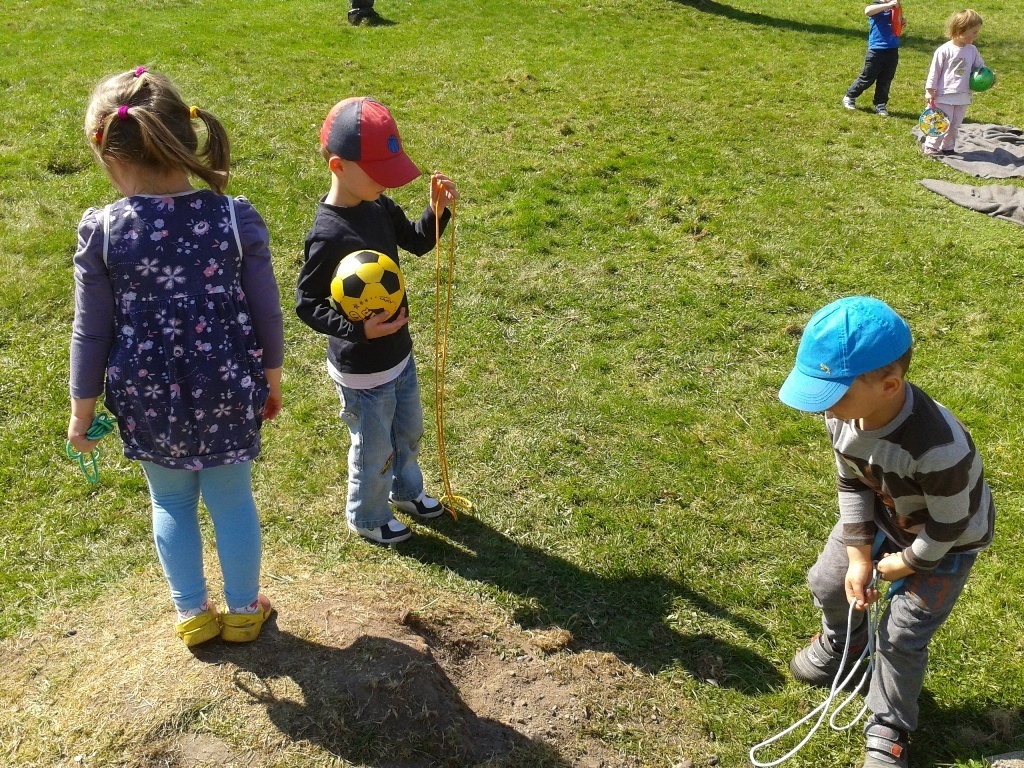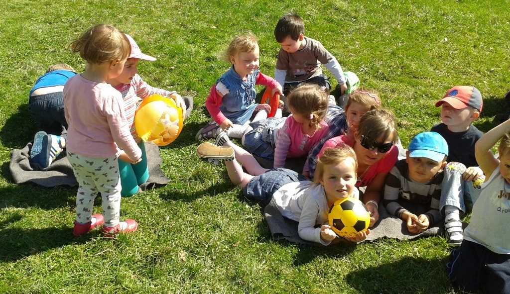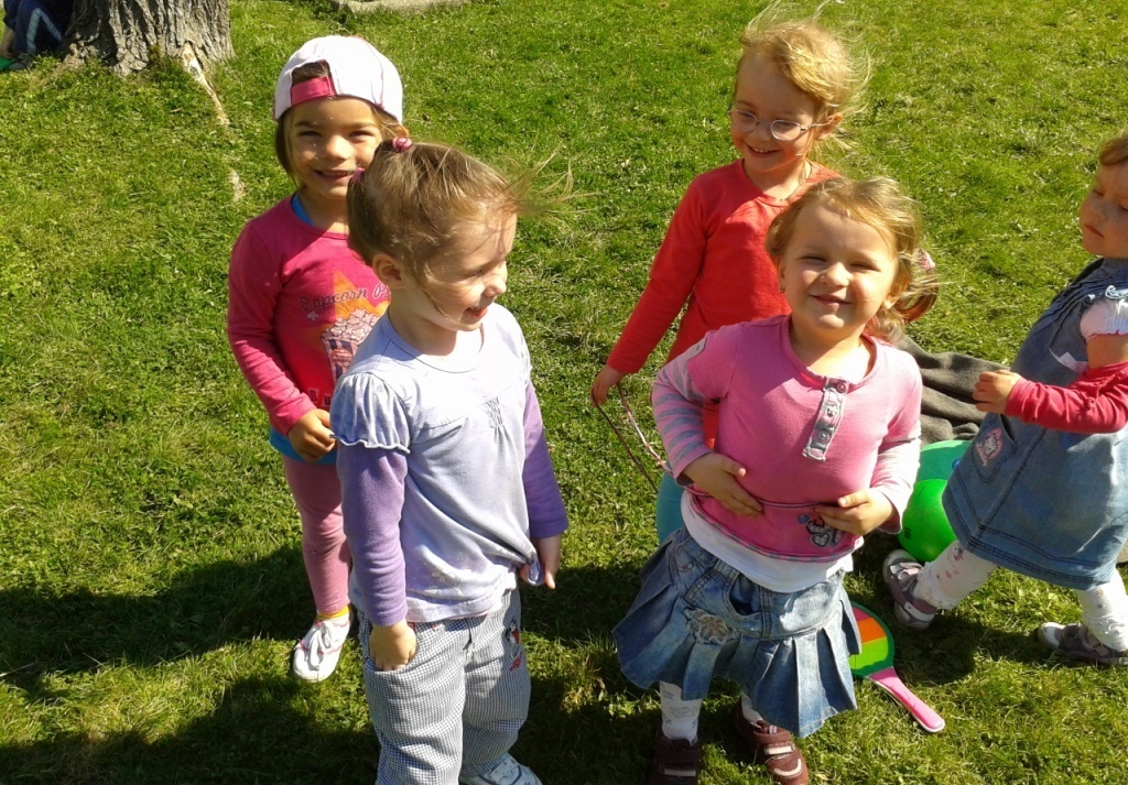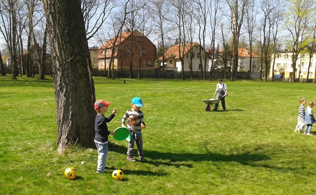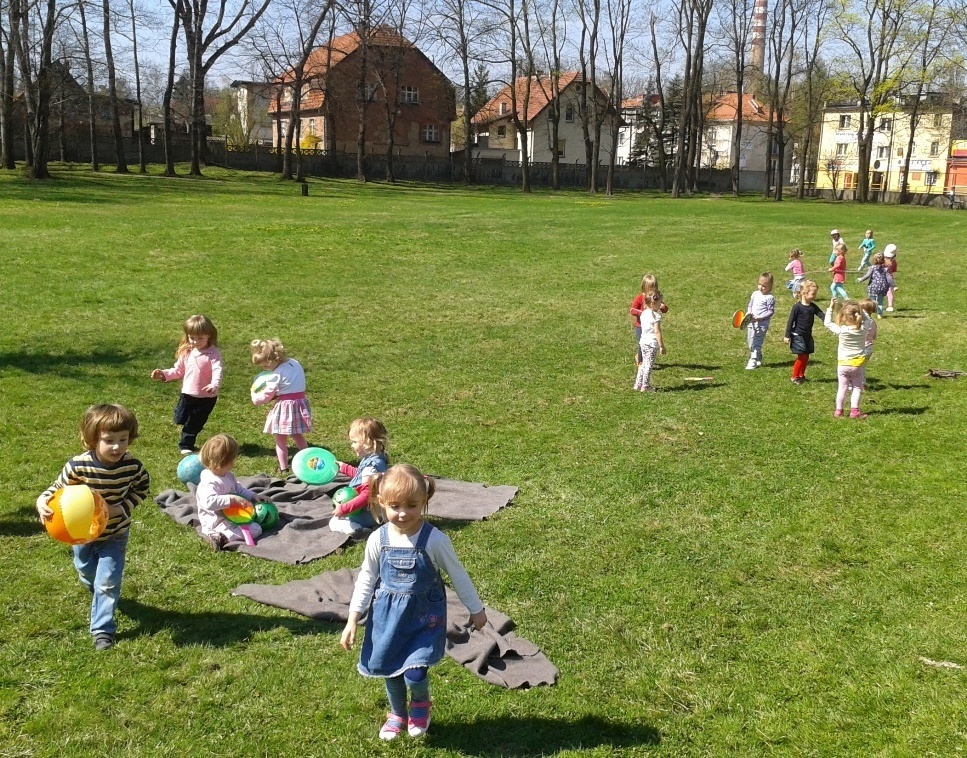 Korzystając z przepięknej słonecznej pogody dwie najmłodsze grupy: Żabki i Słoneczka już o godzinie 10.00 rano zapakowały do koszyków koce, piłki, skakanki, ringo, paletki i drugie śniadanie i radosnym korowodem powędrowały do parku przy Zakładzie Opiekuńczo - Leczniczym na ulicy Żeromskiego.