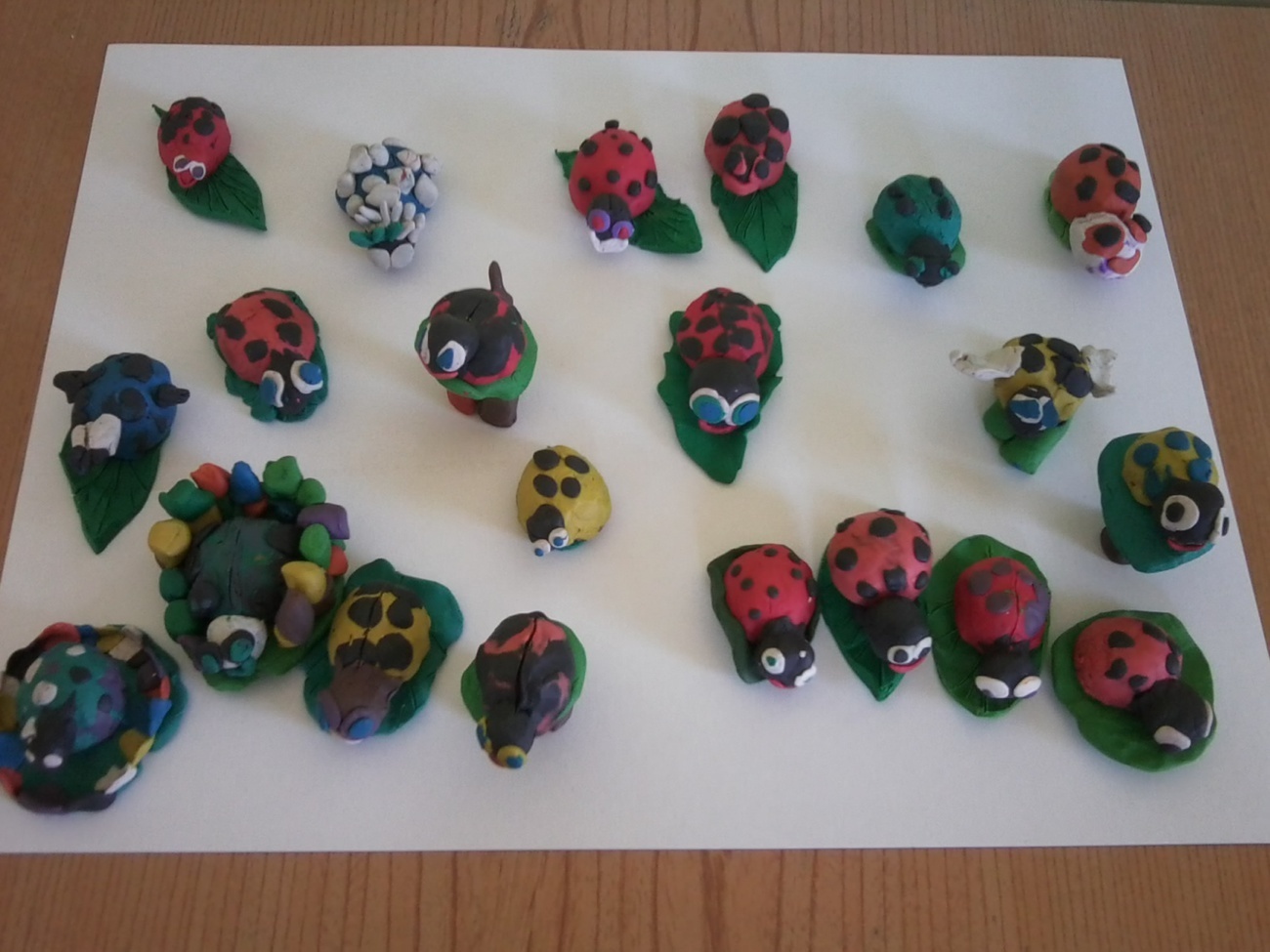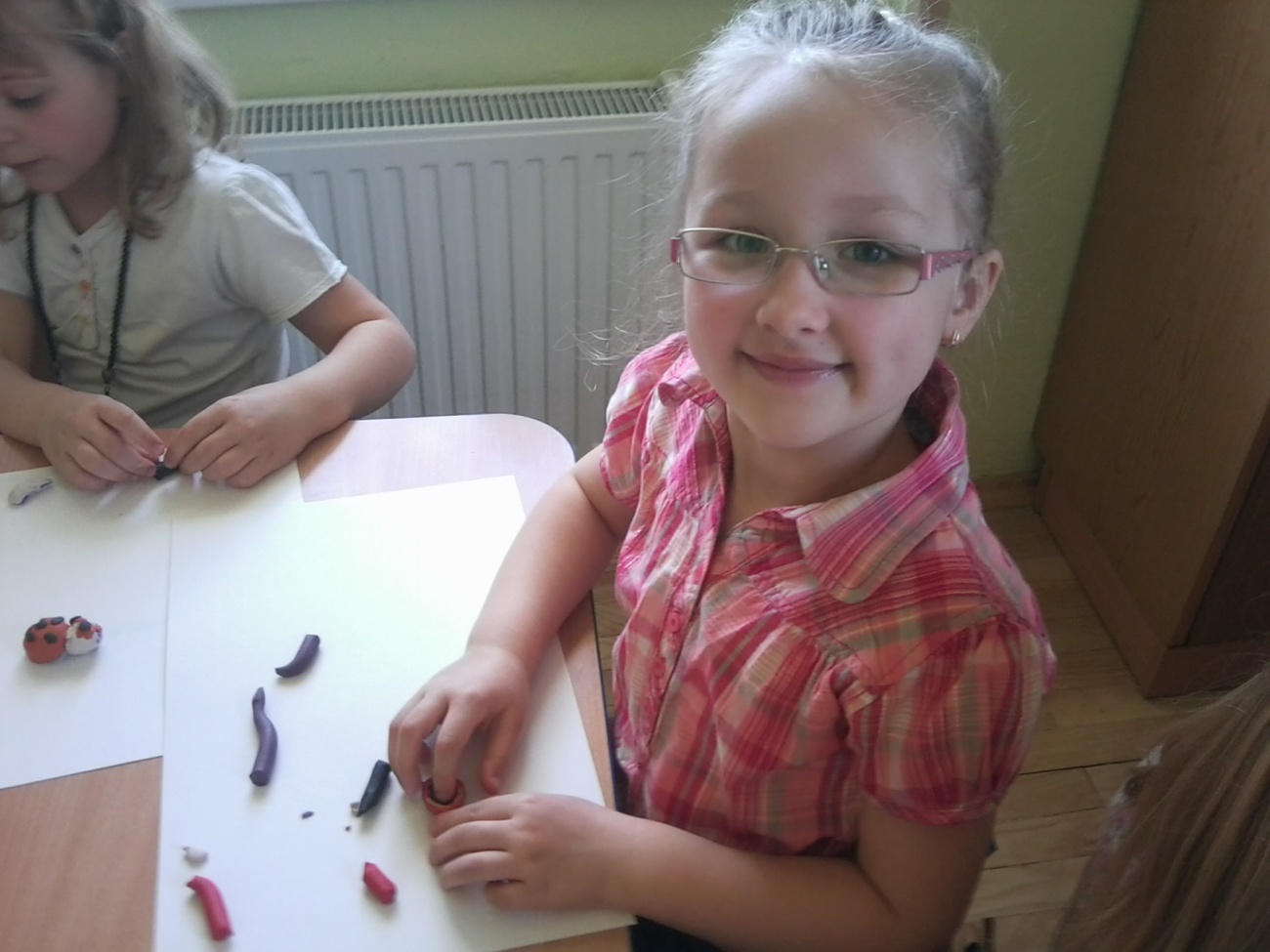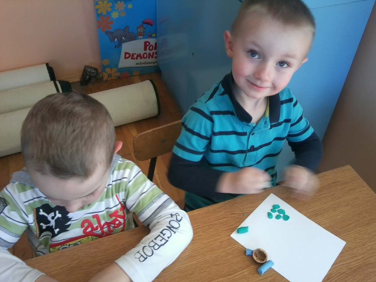 Każdy z nas otrzymał pół łupinki orzecha włoskiego i kolorową plastelinę i mógł zabrać się do pracy. Łupinkę orzecha oblepialiśmy plasteliną, przyklejaliśmy naszym biedronkom czarne kropki, lepiliśmy główki i oczka. Kolory biedronek wybieraliśmy według własnych pomysłów stąd też ich fantazyjne barwy. Prace wyglądają kolorowo i wiosennie, teraz z niecierpliwością czekamy na kolejne warsztaty z panią Wiktorią.
