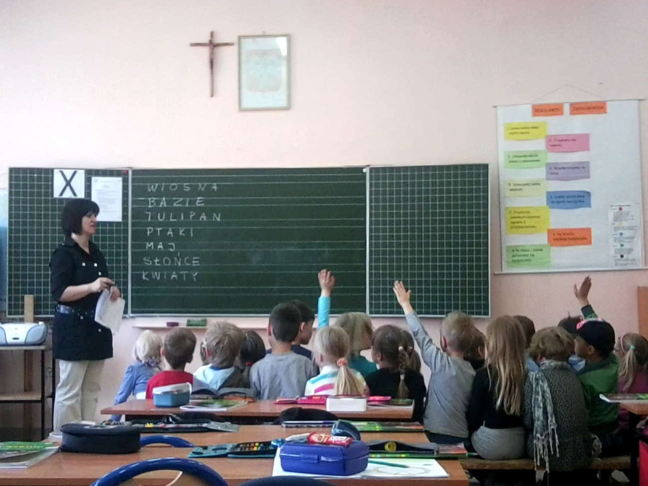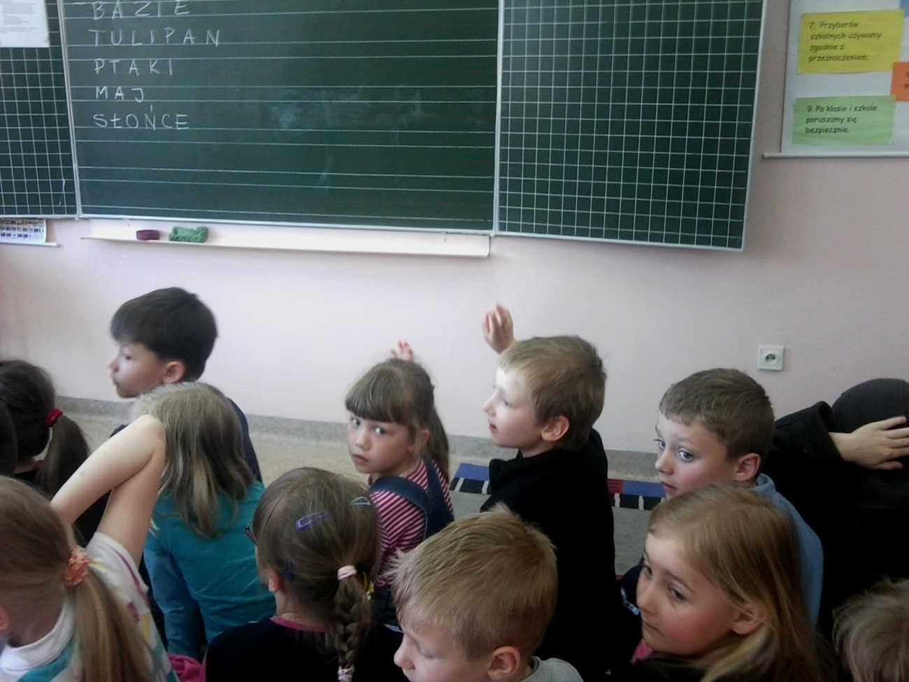 Na początku spotkania zostaliśmy bardzo mile przywitani przez uczniów, a także przez panią Wychowawczynię. Po zajęciu odpowiednich miejsc czekało na nas pierwsze zadania, w trakcie którego odgadywaliśmy wiosenne zagadki i zapisywaliśmy ich rozwiązanie na tablicy.
