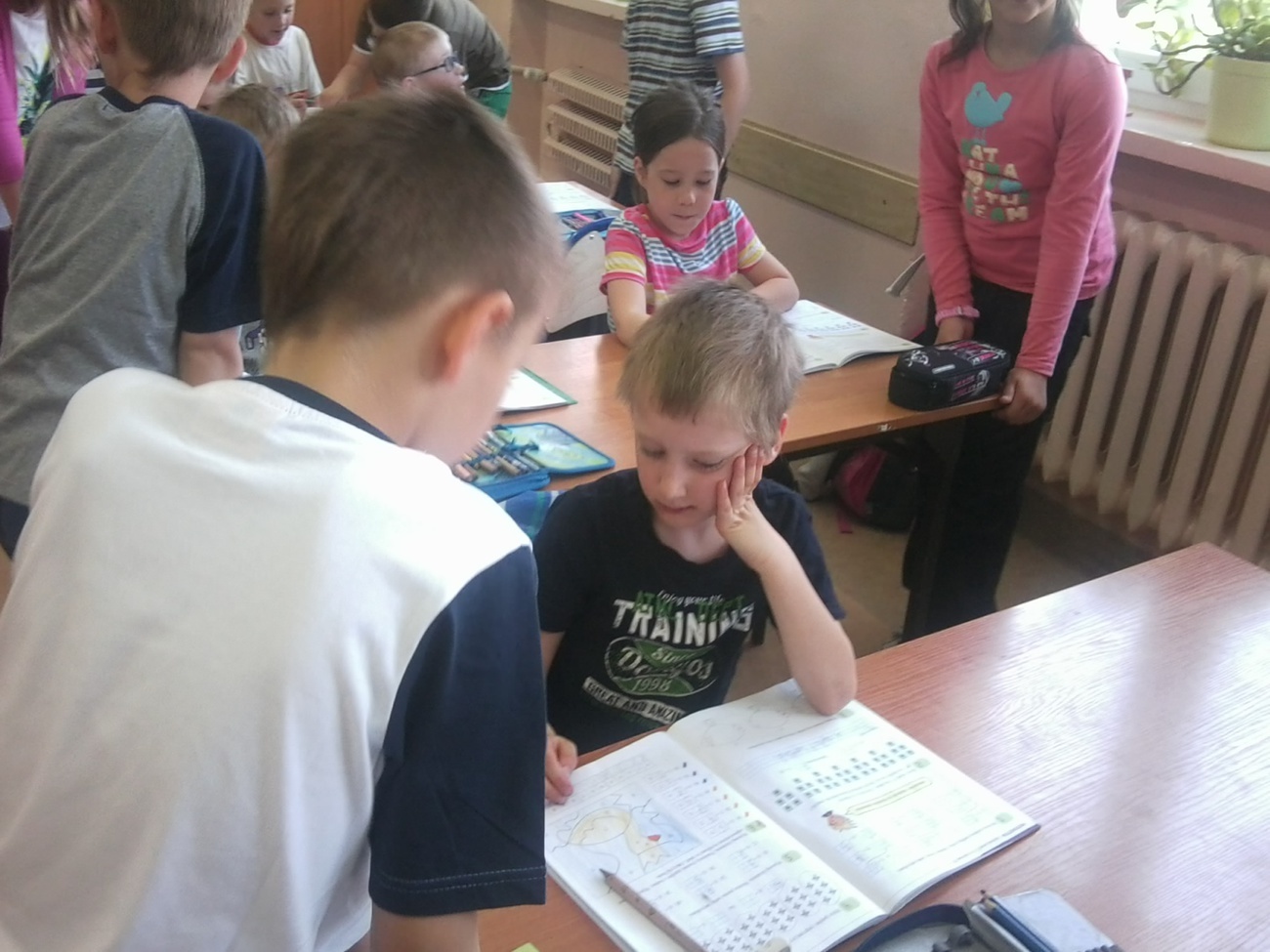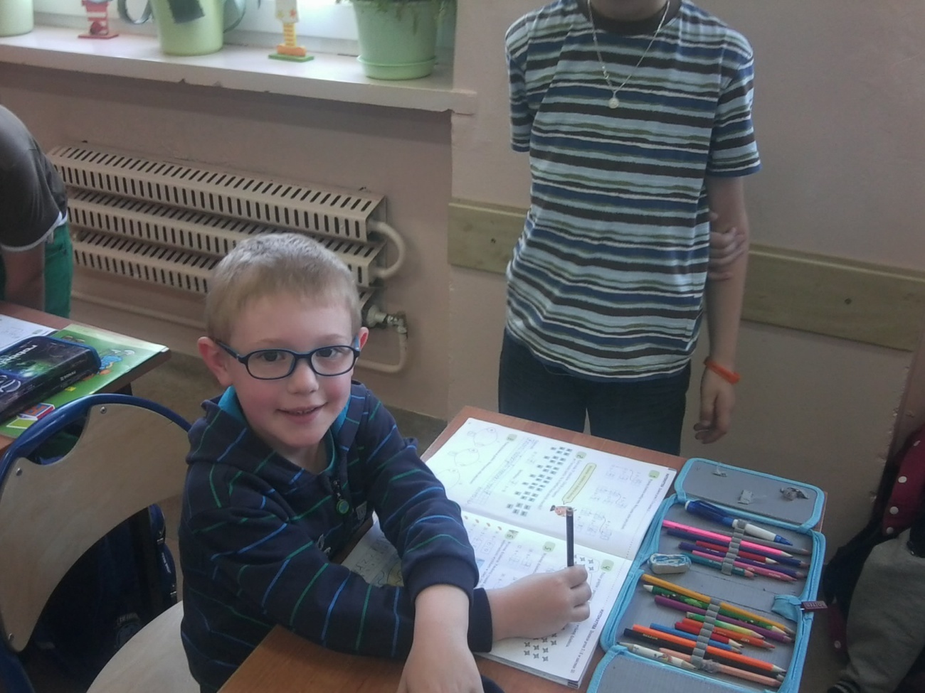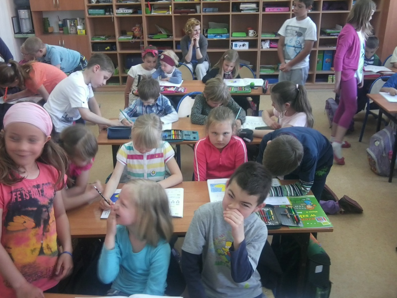Następnie przez uczniów II a zostaliśmy zaproszeni do ławek, gdzie wspólnie rozwiązywaliśmy zadania w zeszytach ćwiczeń – jak na prawdziwej lekcji.