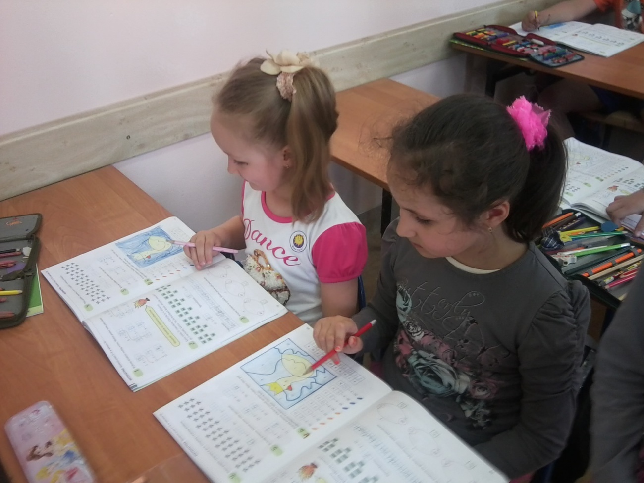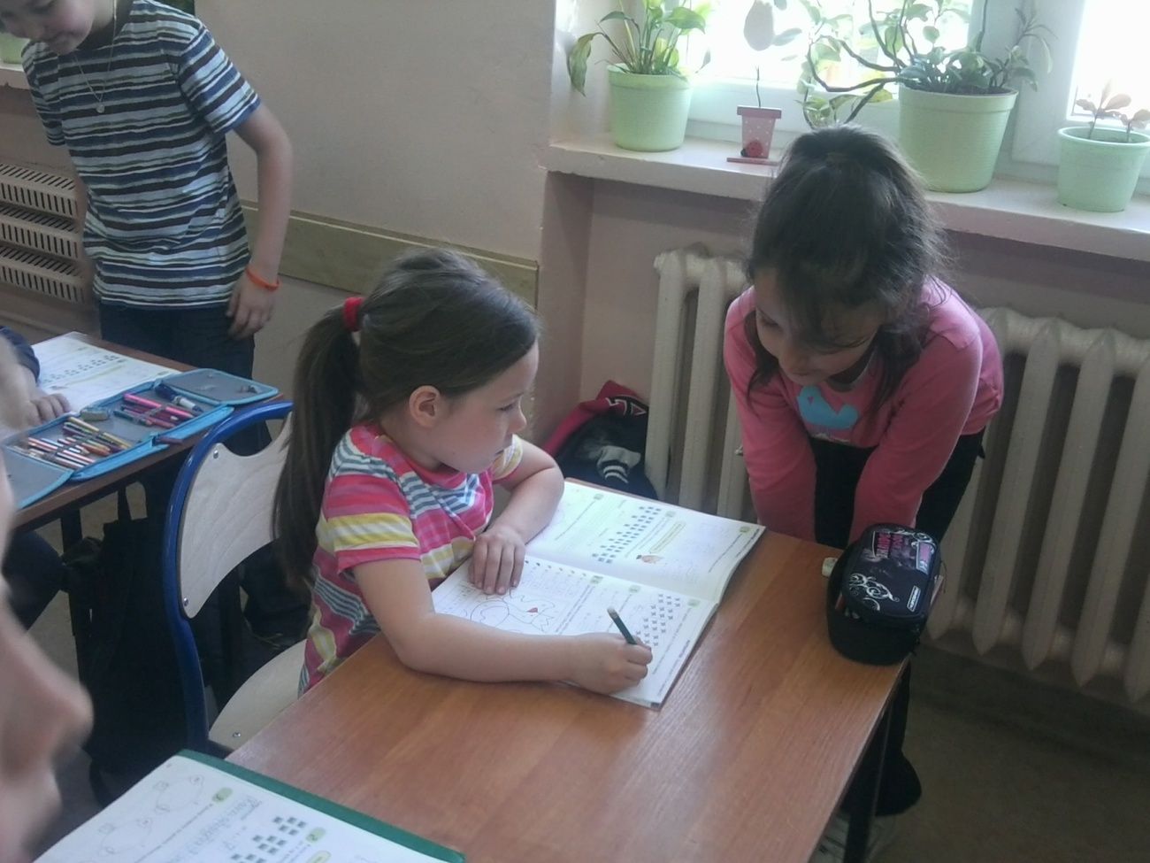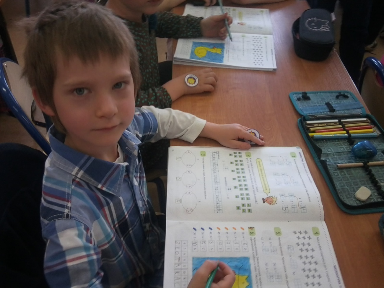 Następnie przez uczniów II a zostaliśmy zaproszeni do ławek, gdzie wspólnie rozwiązywaliśmy zadania w zeszytach ćwiczeń – jak na prawdziwej lekcji.