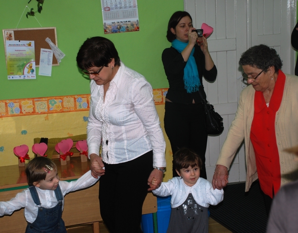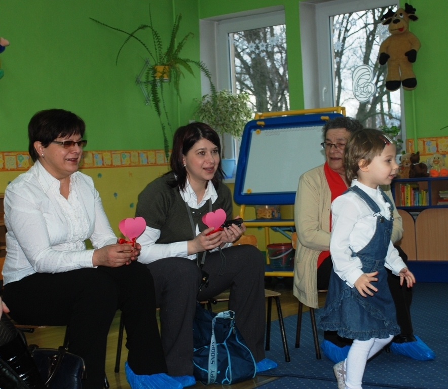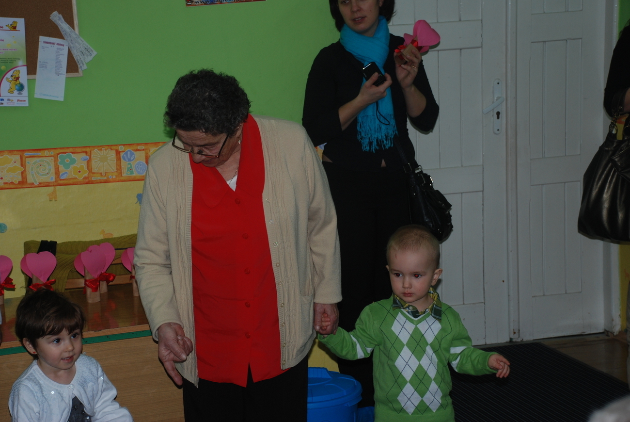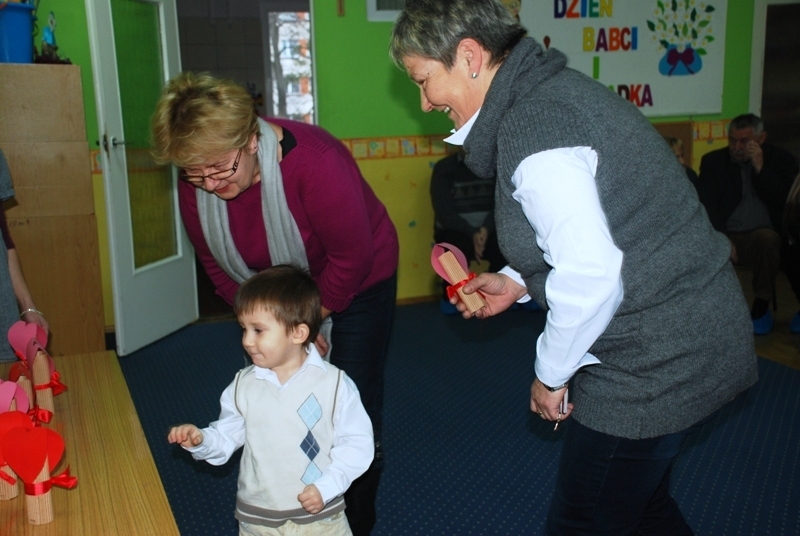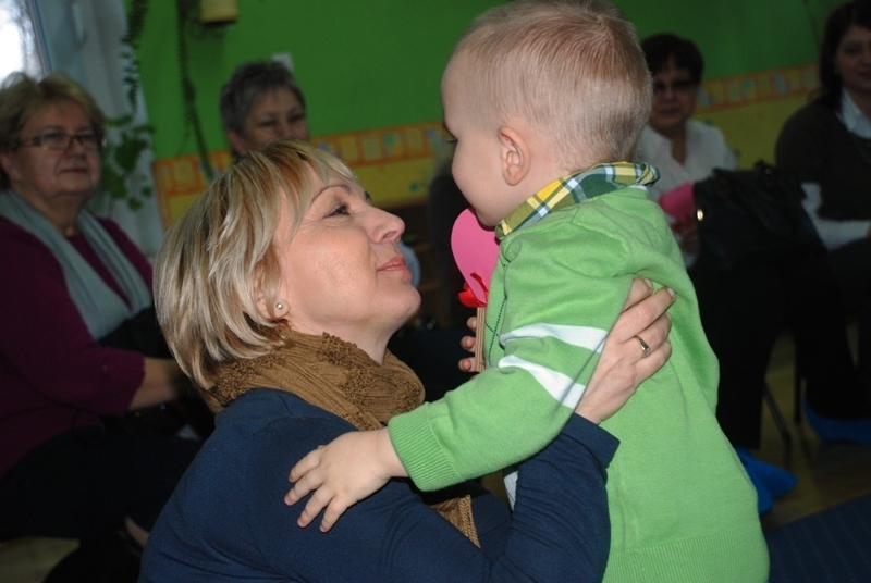 Całe zdenerwowanie i niecierpliwość naszych najmłodszych wyparowały jak sen – szeroko uśmiechnięte i niezwykle głośno jak na tak małe grono (dziś jest nas tylko siódemka) maluchy śpiewają piosenkę i pięknie deklamują życzenia dla ukochanych Babć i Dziadków. Pani Kasia pęka z dumy – maluszki pokazały klasę!