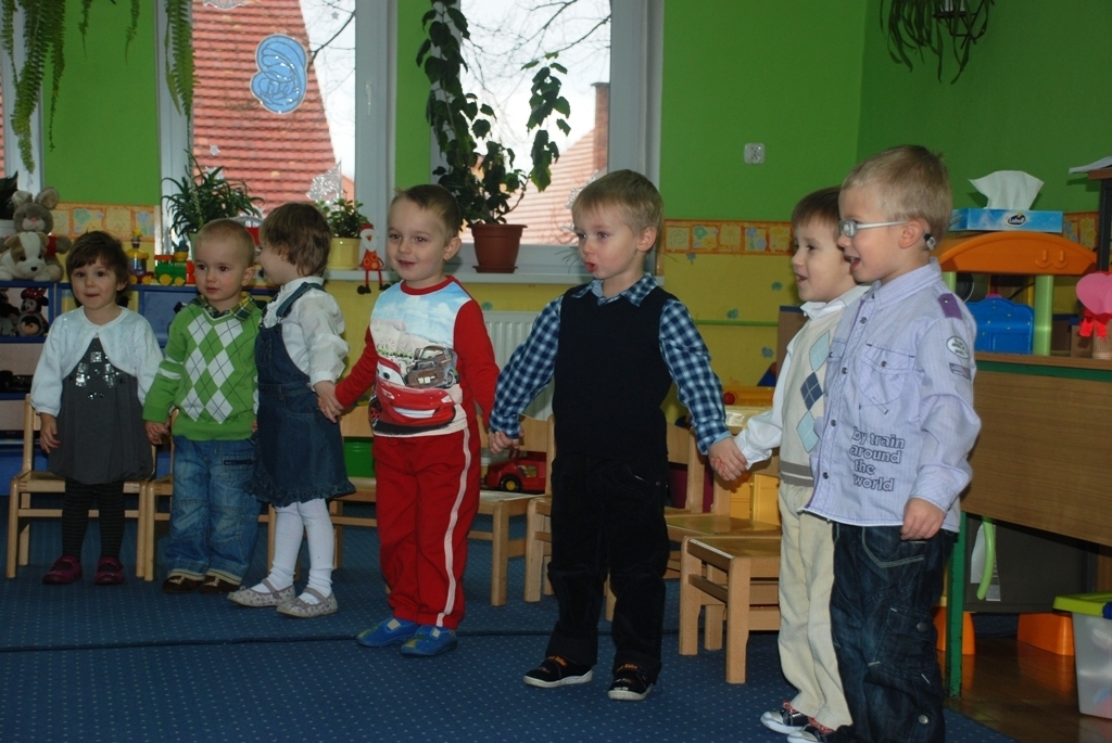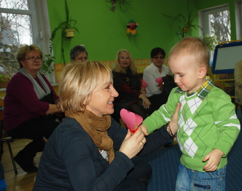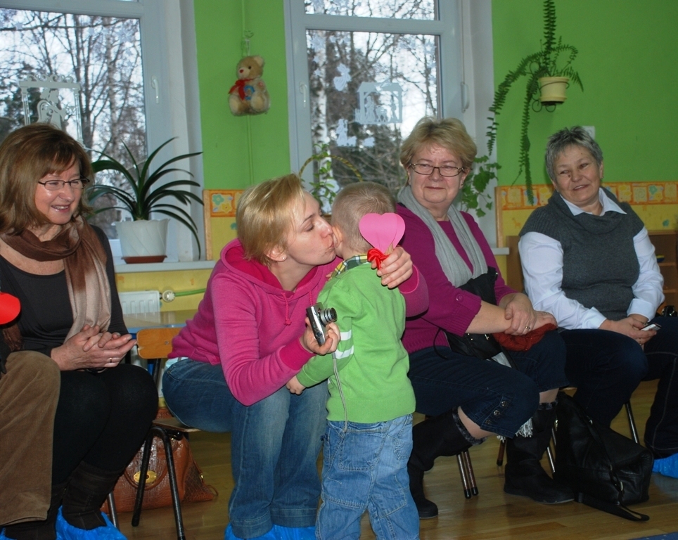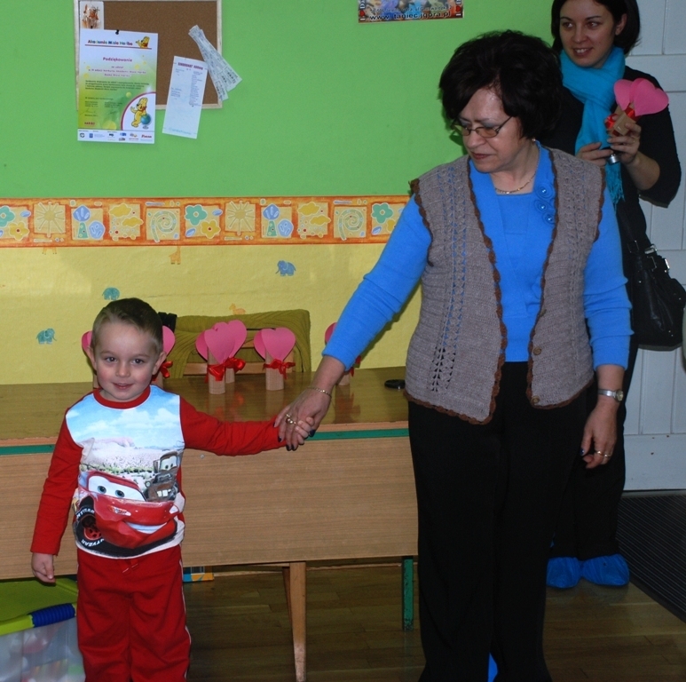 Całe zdenerwowanie i niecierpliwość naszych najmłodszych wyparowały jak sen – szeroko uśmiechnięte i niezwykle głośno jak na tak małe grono (dziś jest nas tylko siódemka) maluchy śpiewają piosenkę i pięknie deklamują życzenia dla ukochanych Babć i Dziadków. Pani Kasia pęka z dumy – maluszki pokazały klasę!