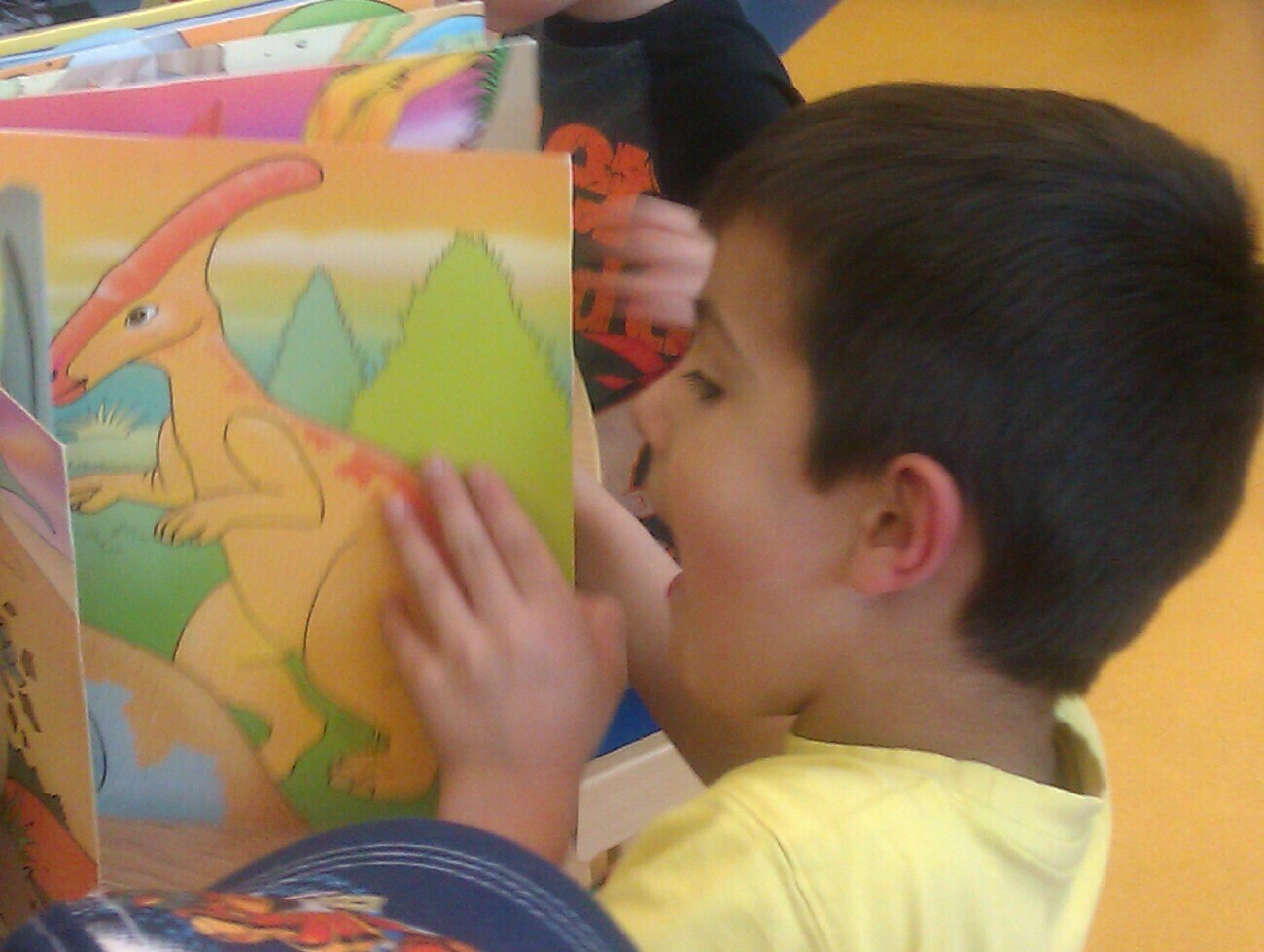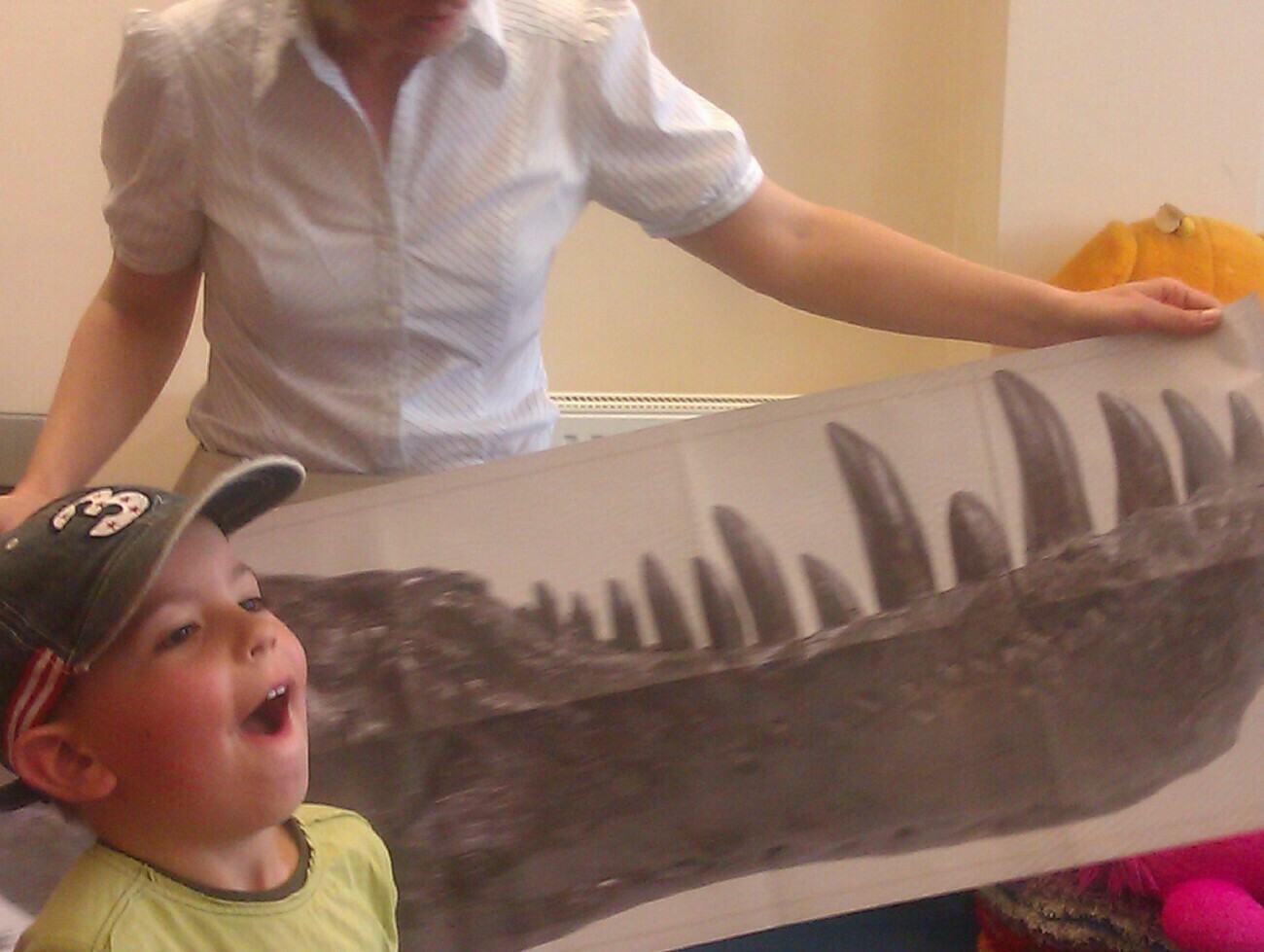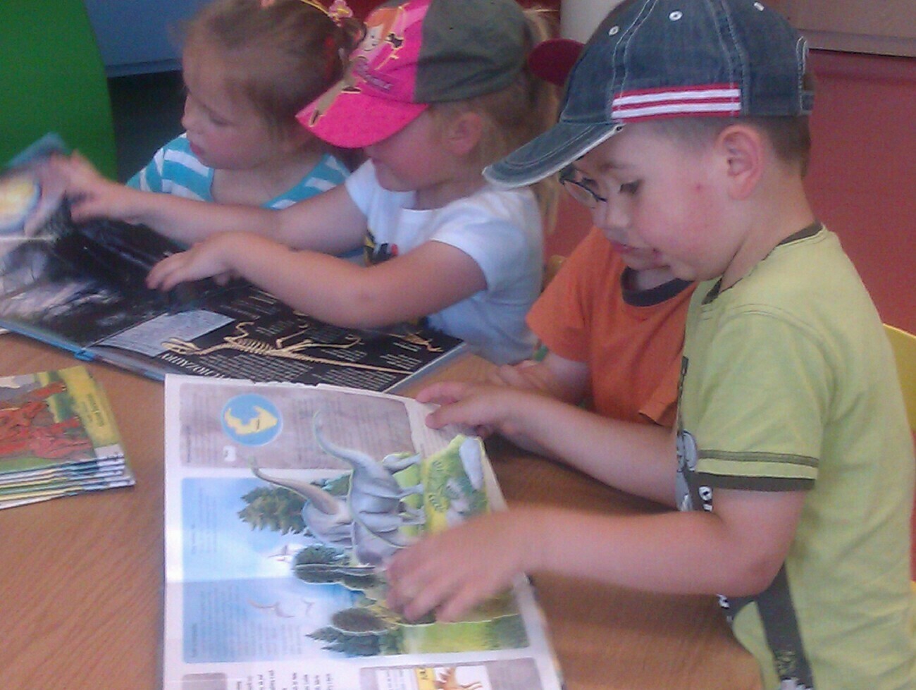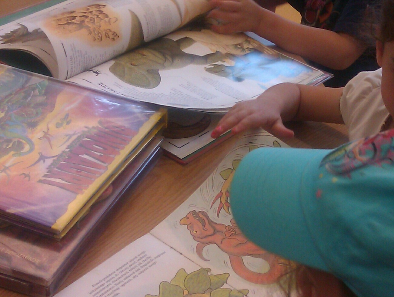 Zakończenie sezonu czytelniczego upłynęło pod znakiem dinozaurów. Ponad godzinę zajmowaliśmy się czytaniem i oglądaniem ilustracji przedstawiających te prehistoryczne stworzenia. Bawiliśmy się świetnie i chętnie zostalibyśmy tam dłużej. Na szczęście po wakacjach znów odwiedzimy Książnicę Karkonoską.