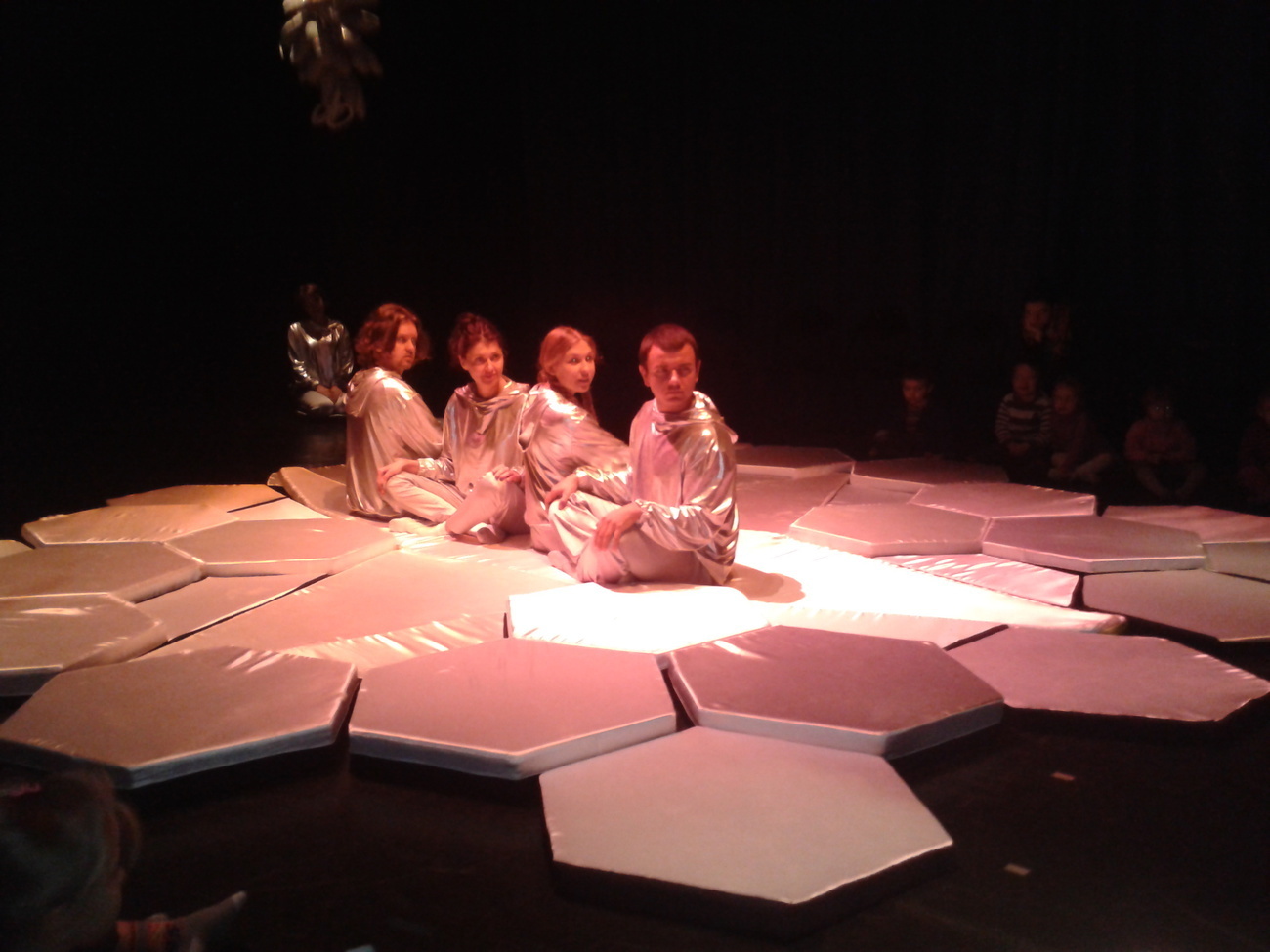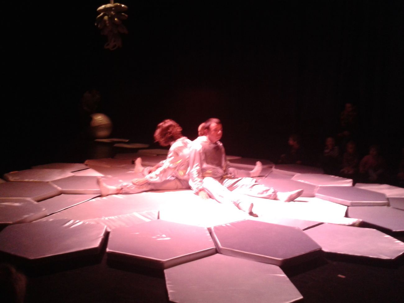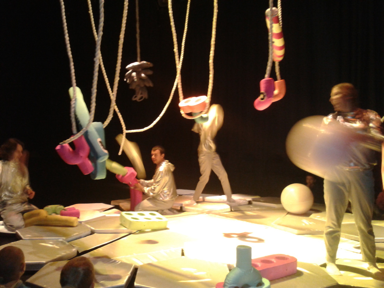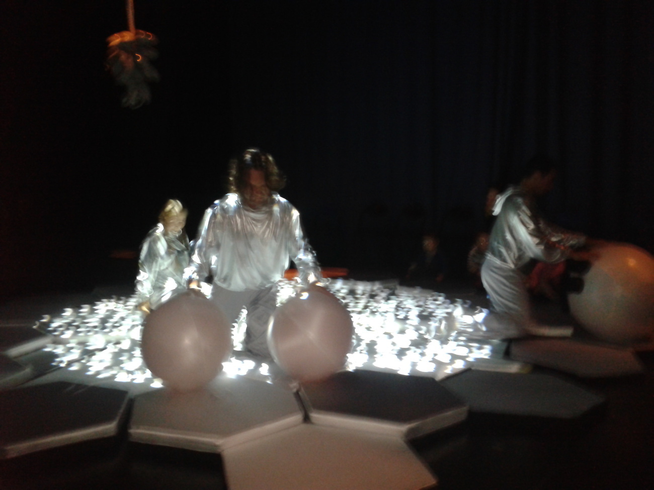 Uczestnicy spektaklu musieli przed wejściem ściągnąć buty, otrzymali także śmieszne poduszki, na których musieli usiąść. Wielka sala z ogromną ilością srebrnych poduszek tworzyła zarazem scenę oraz widownię.
