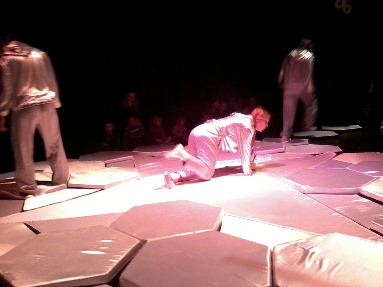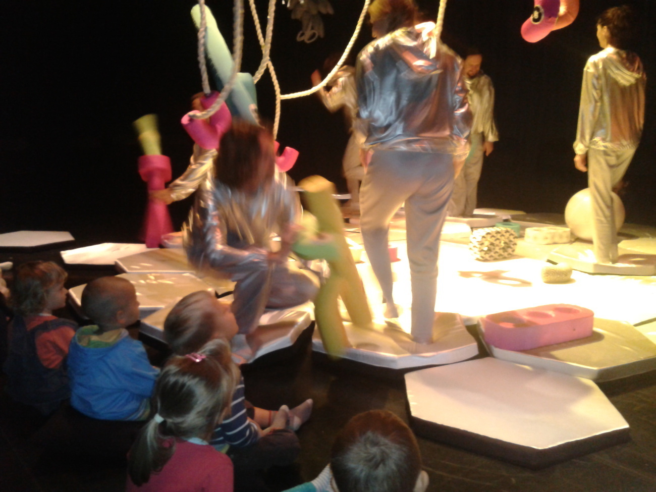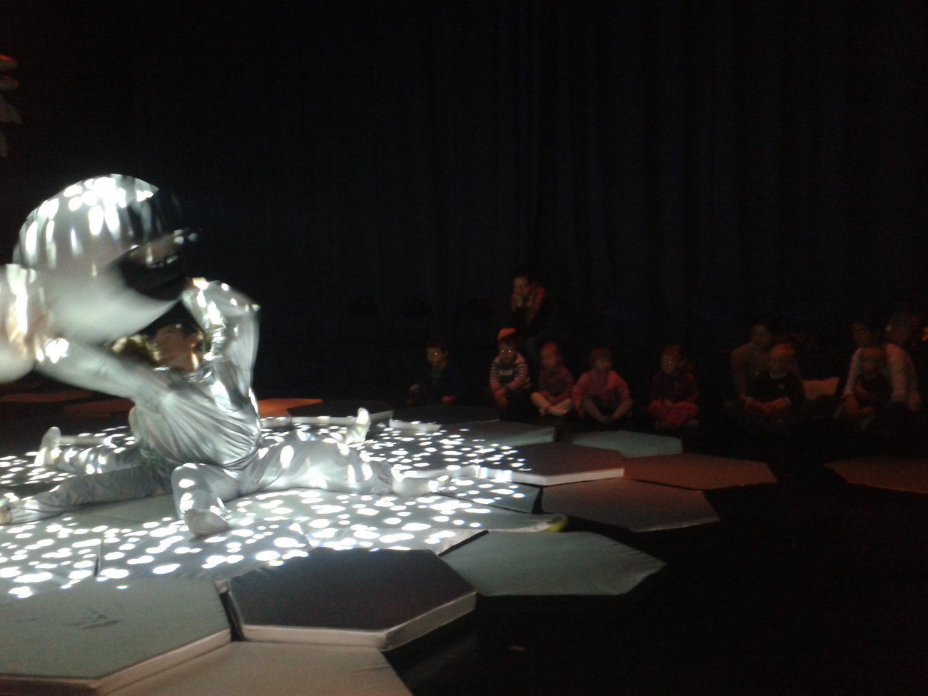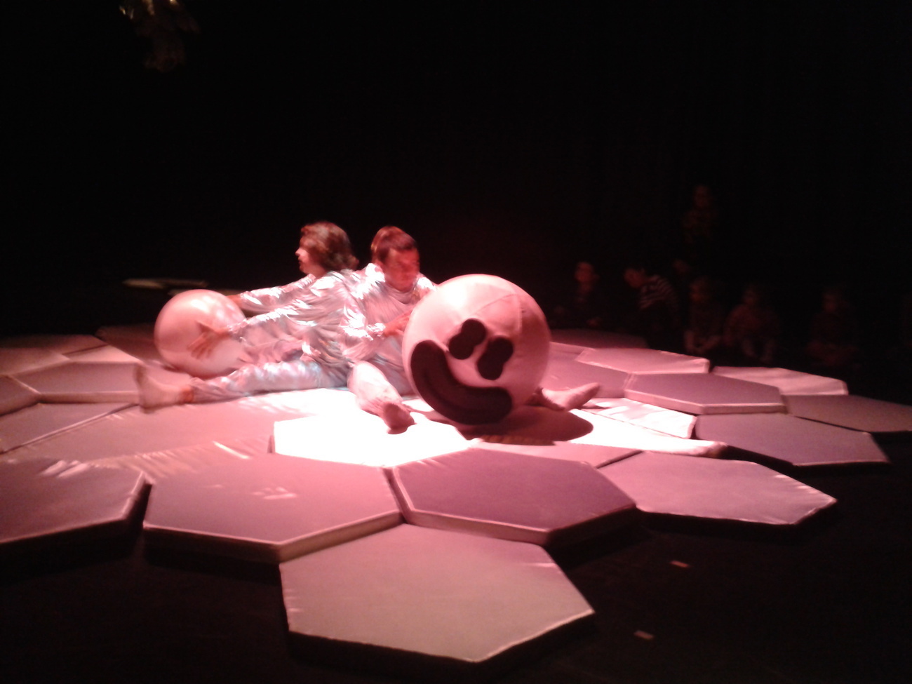 Uczestnicy spektaklu musieli przed wejściem ściągnąć buty, otrzymali także śmieszne poduszki, na których musieli usiąść. Wielka sala z ogromną ilością srebrnych poduszek tworzyła zarazem scenę oraz widownię.