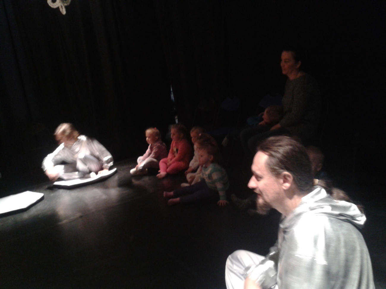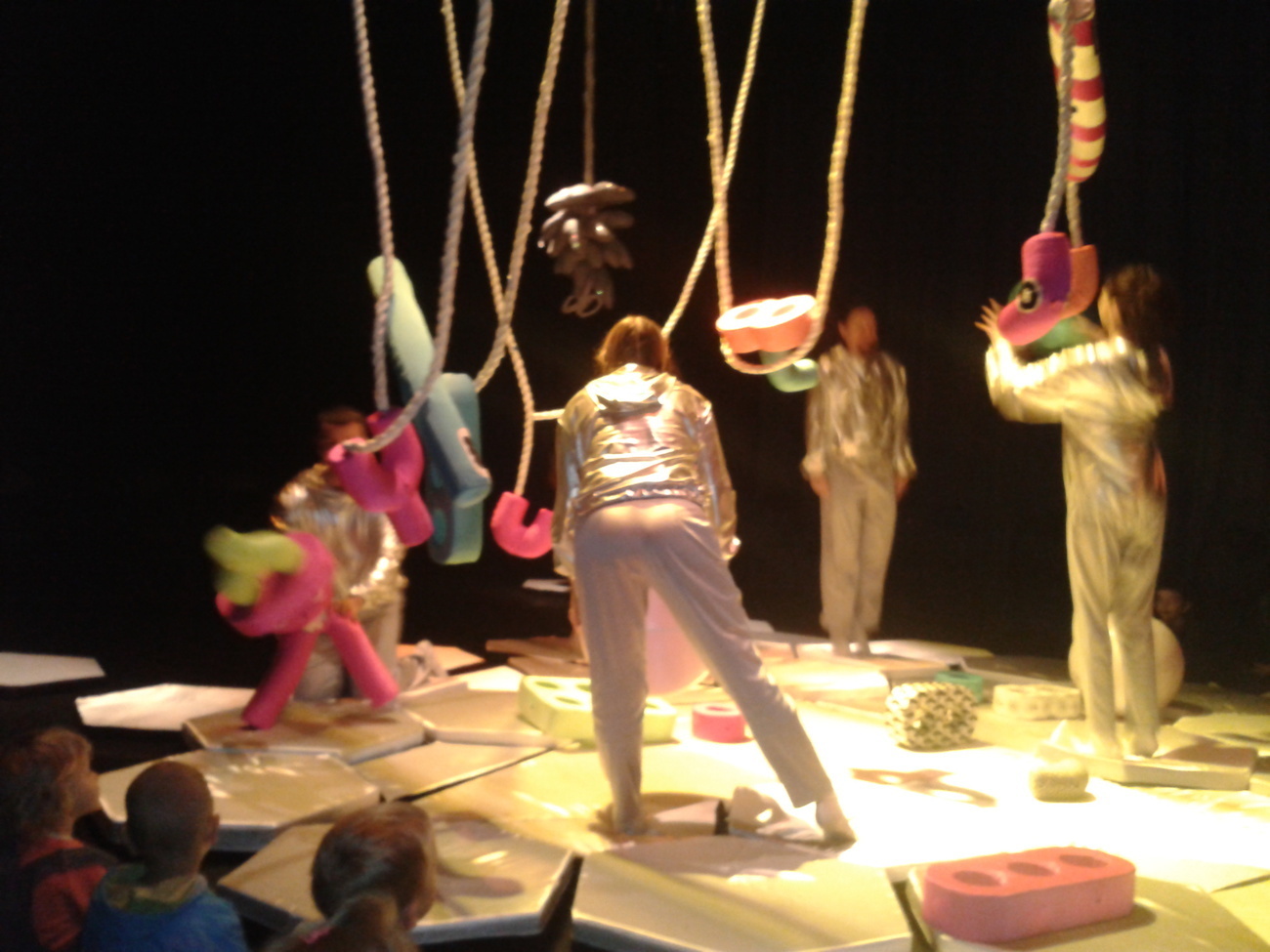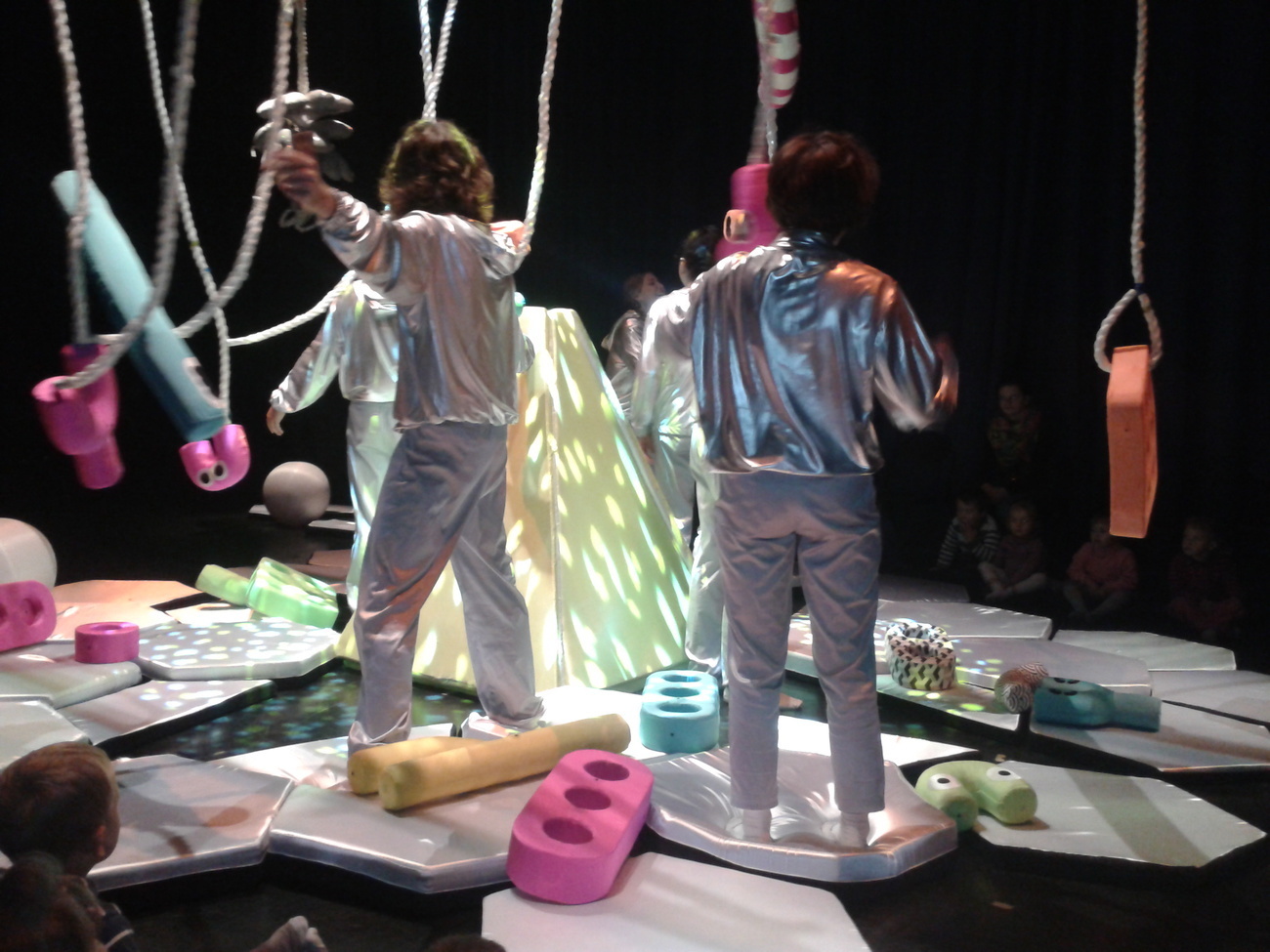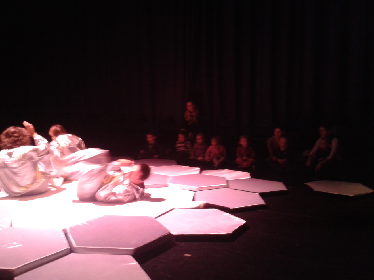 Uczestnicy spektaklu musieli przed wejściem ściągnąć buty, otrzymali także śmieszne poduszki, na których musieli usiąść. Wielka sala z ogromną ilością srebrnych poduszek tworzyła zarazem scenę oraz widownię.