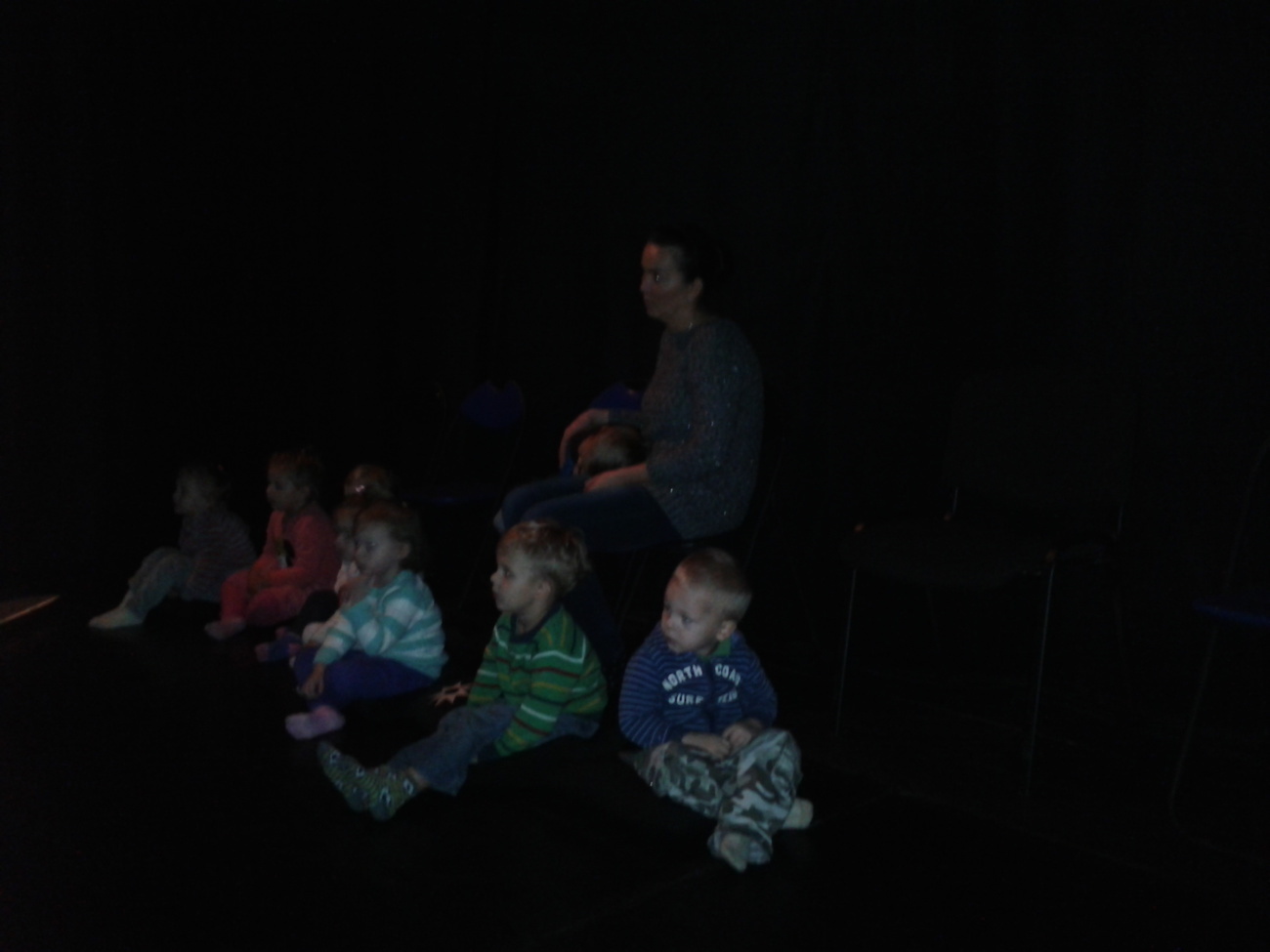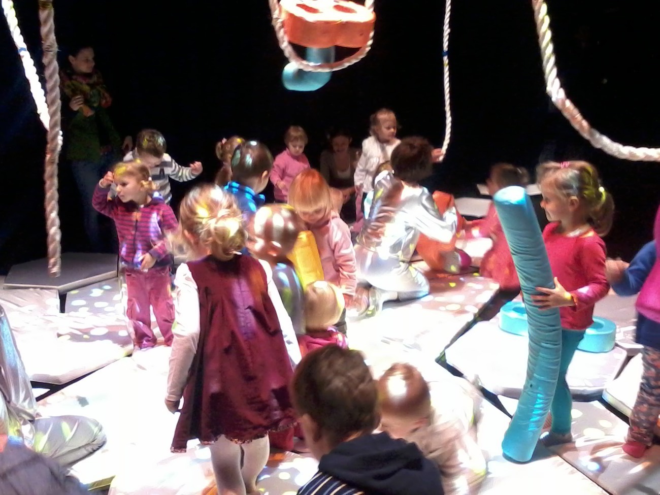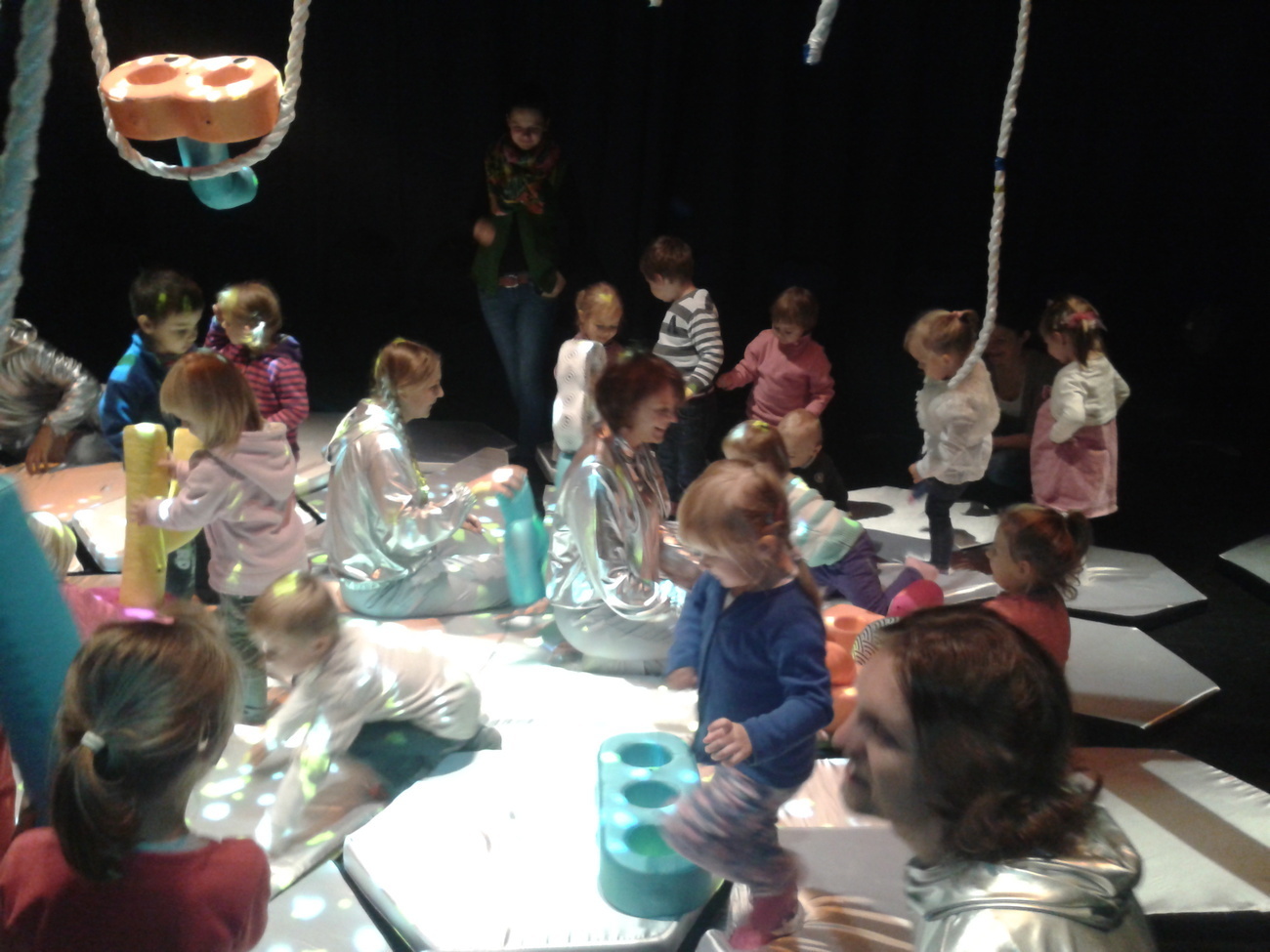Zgasło światło i…… przenieśliśmy się do dziecięcego pokoju. A w nim dzieci bawiące się kolorowymi klockami, które szeleszczą, łączą się z innymi. Wszystko to działo się w zwolnionym tempie. Przedszkolaki były zachwycone i patrzyły z zaciekawieniem na dalszy rozwój wydarzeń.
