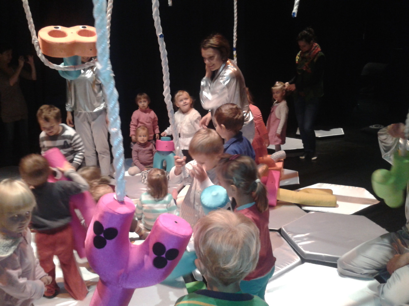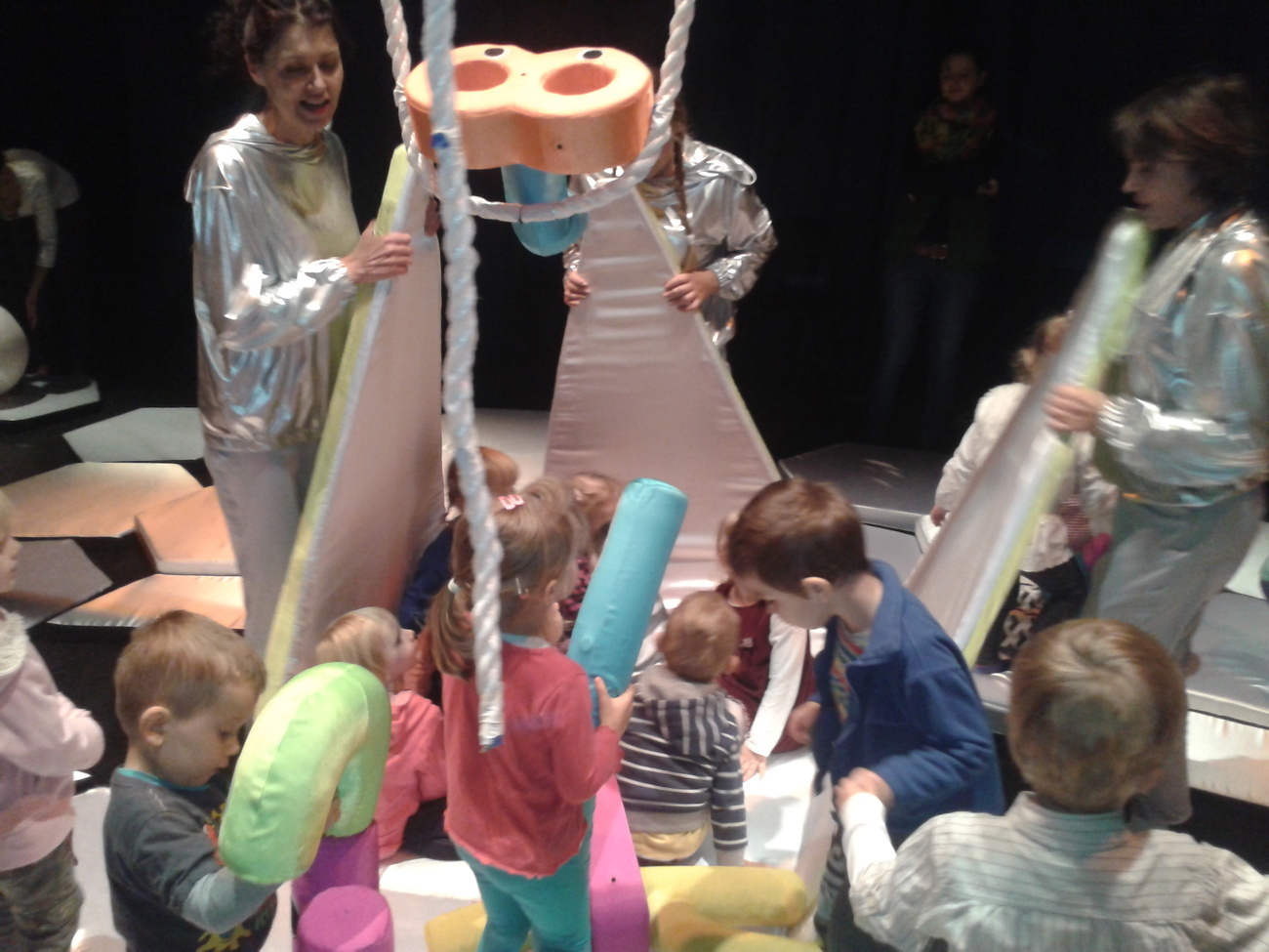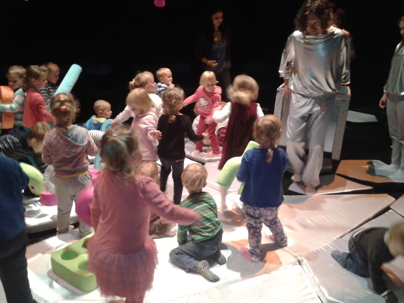 Jednak największą atrakcja tego spektaklu była interakcja aktorów z dziećmi. Przedszkolaki mogły dotknąć zabawek, poskakać na poduszkach, poczuć, że oni także są częścią przedstawienia.
