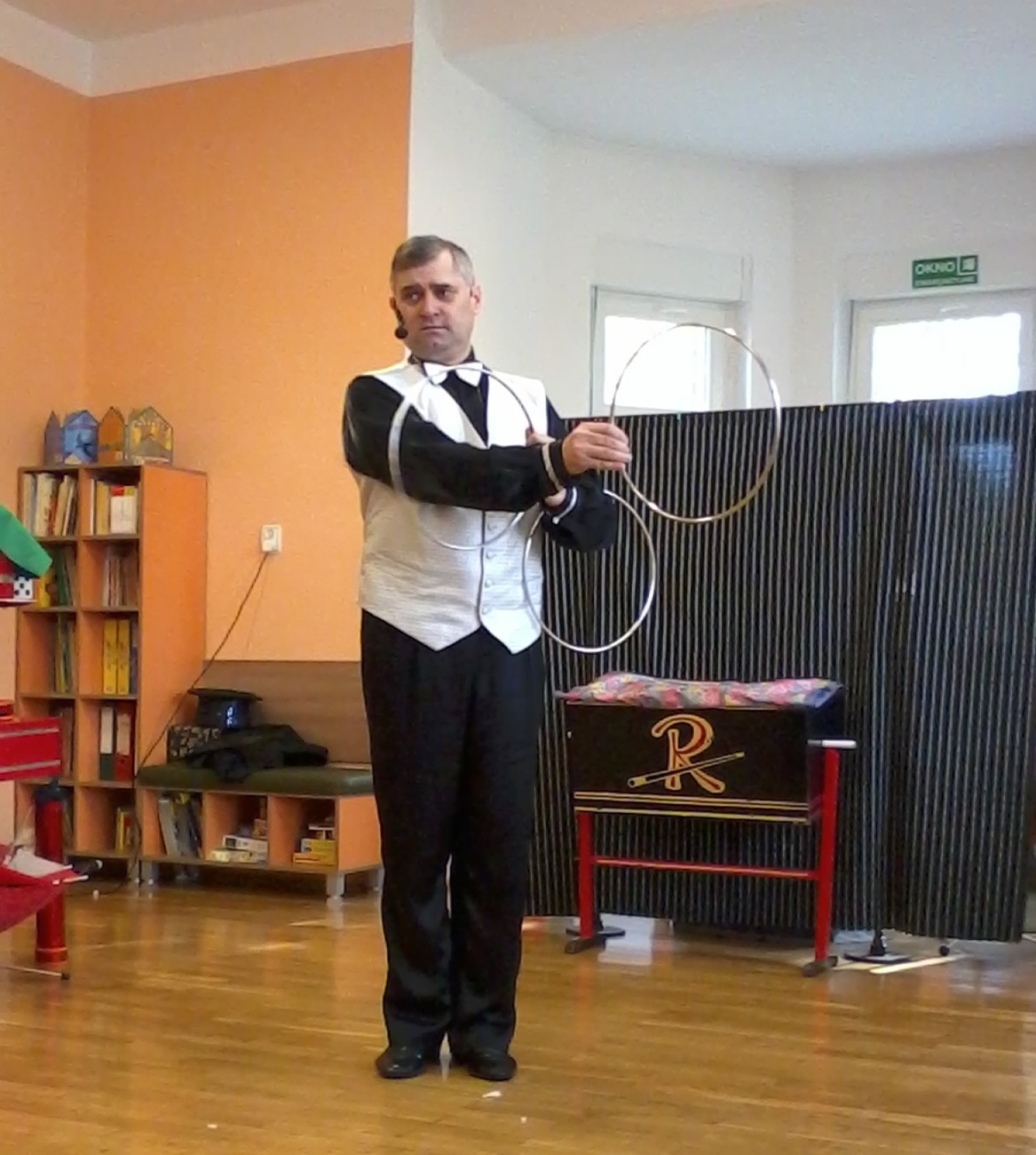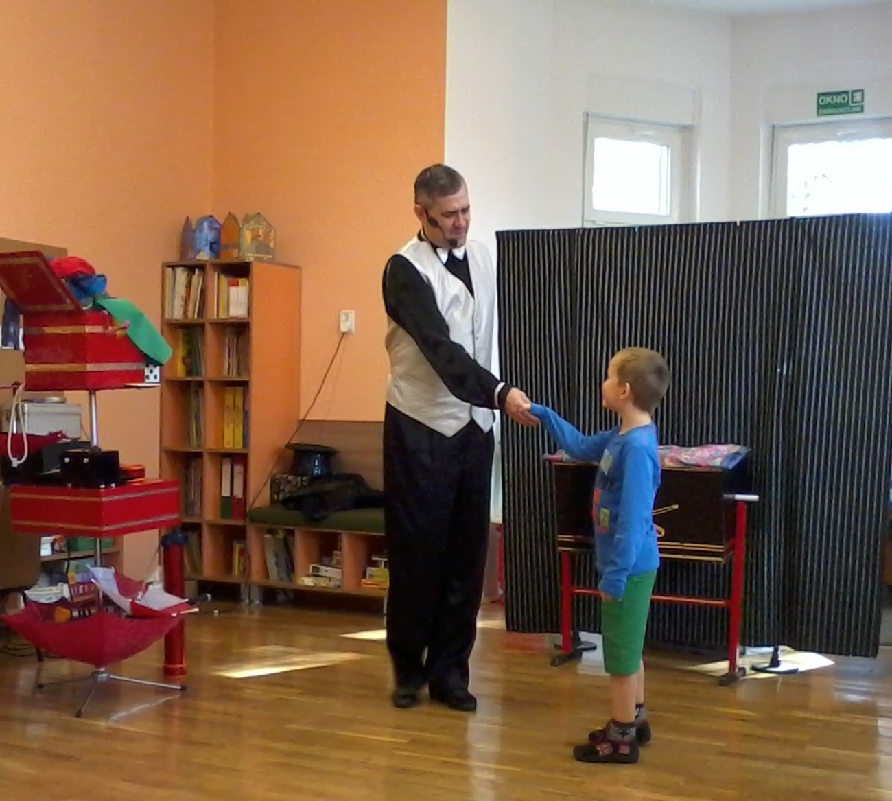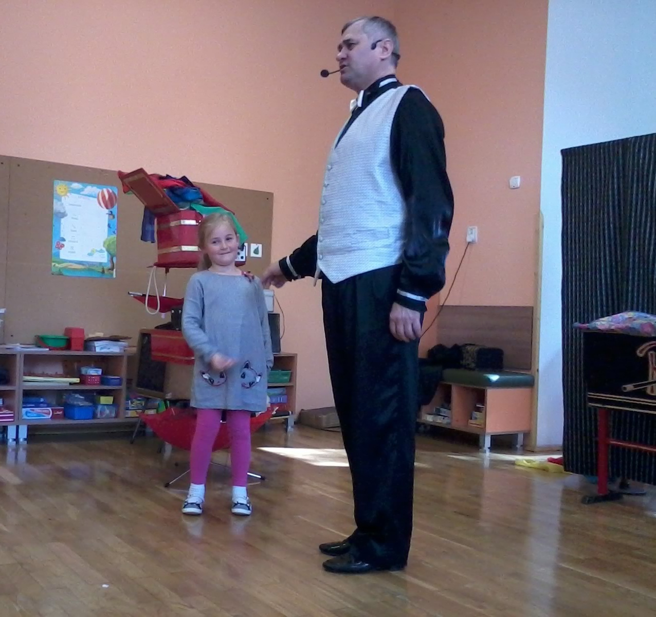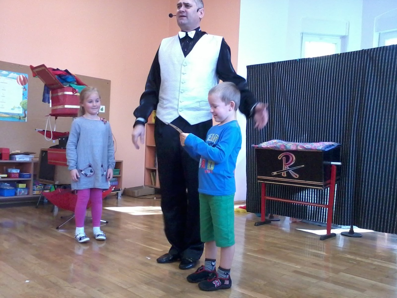Dzisiejszy czas po drugim śniadaniu nasze przedszkole zostało zaczarowane przez Magika - iluzjonistę. Wszystkie grupy brały udział w niesamowitym spektaklu. Mogliśmy podziwiać liczne, magiczne sztuczki. Każdą z nich nasze przedszkolaki komentowały : „WOW”. Wszyscy nauczyli się nagradzać naszego Gościa - Artystę brawami. W czasie spektaklu dzieci podziwiały znikające chusteczki, zmieniające kolor kwiaty, w nierealny wręcz sposób łączące się ze sobą metalowe obręcze. Prawdziwą „furorę” zrobiła maszynka do pieniędzy - zamieniająca białe prostokąty w banknoty. Niemałym aplauzem została nagrodzona sztuczka w wyniku, której w rękach Magika pojawił się biały gołąb, albo w pustym pudełku królik. Niestety co dobre szybko się kończy. Magia przedstawienia ulotniła się i musieliśmy wrócić do rzeczywistości w naszych salach.
