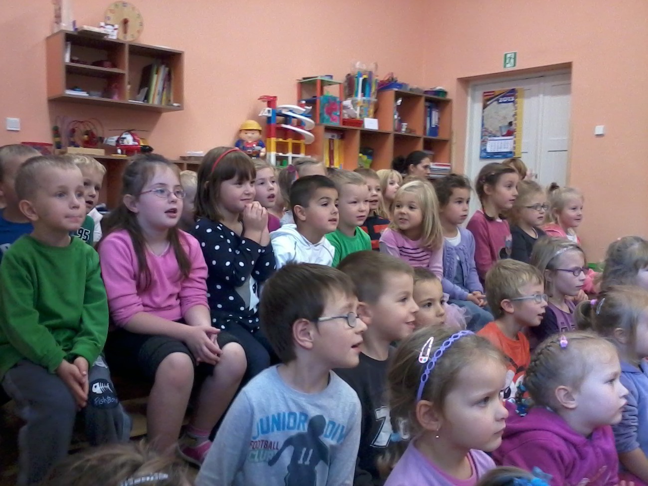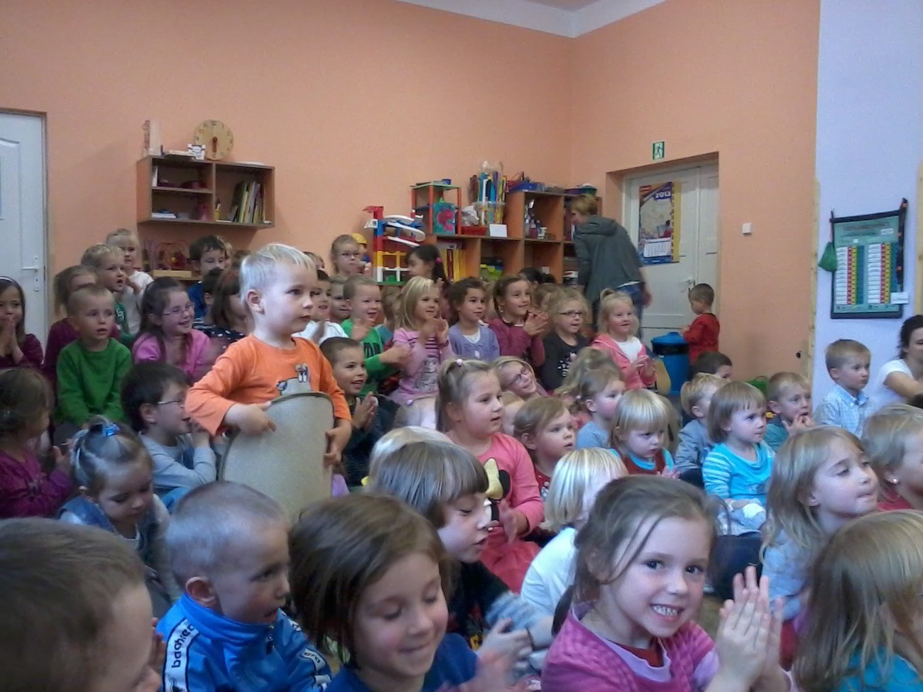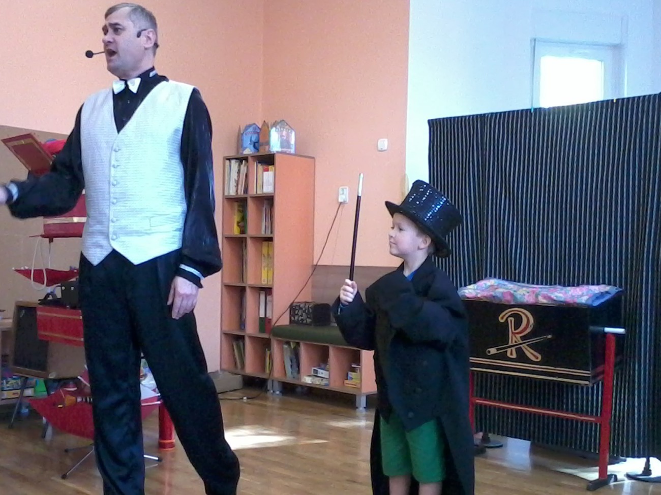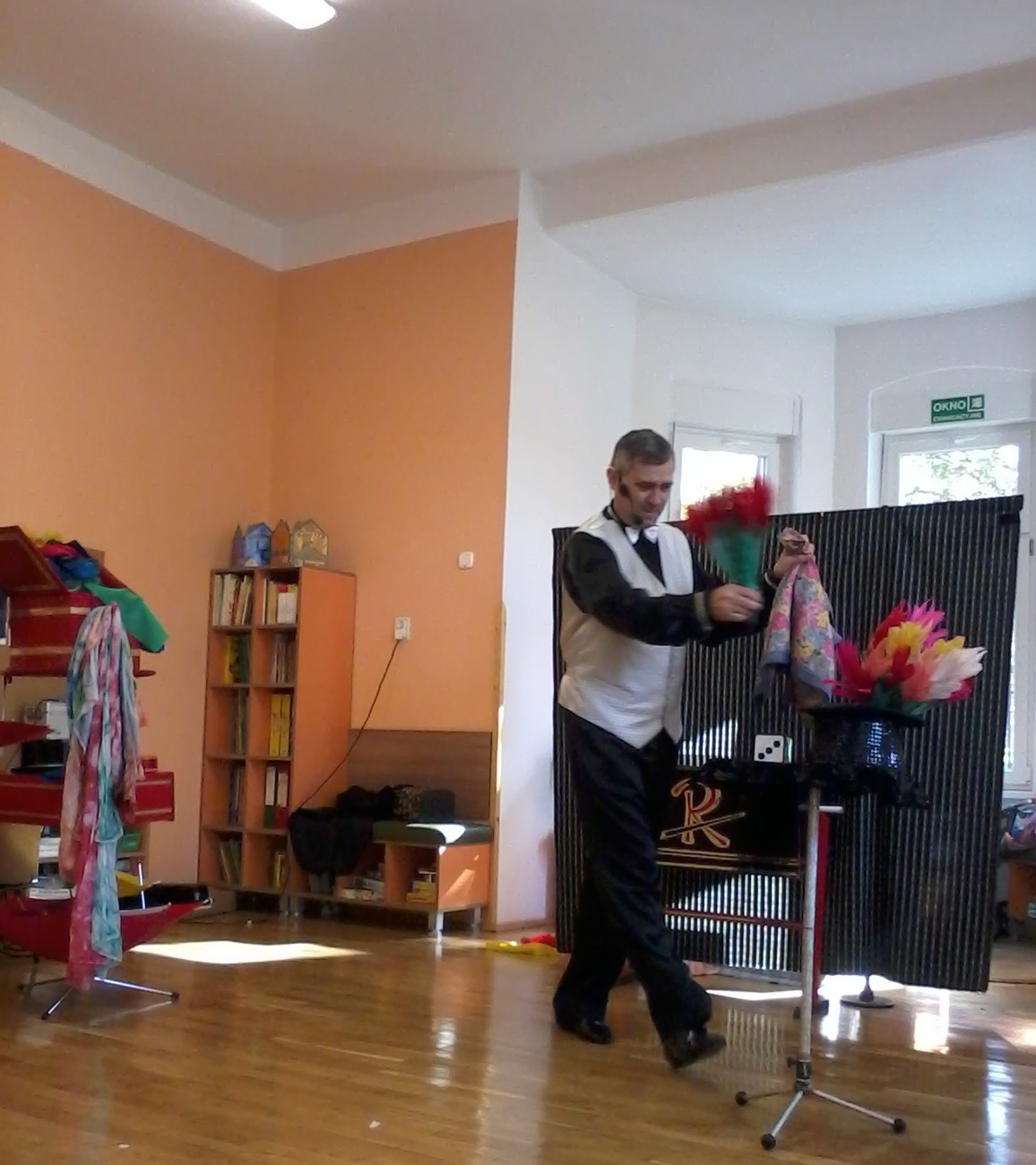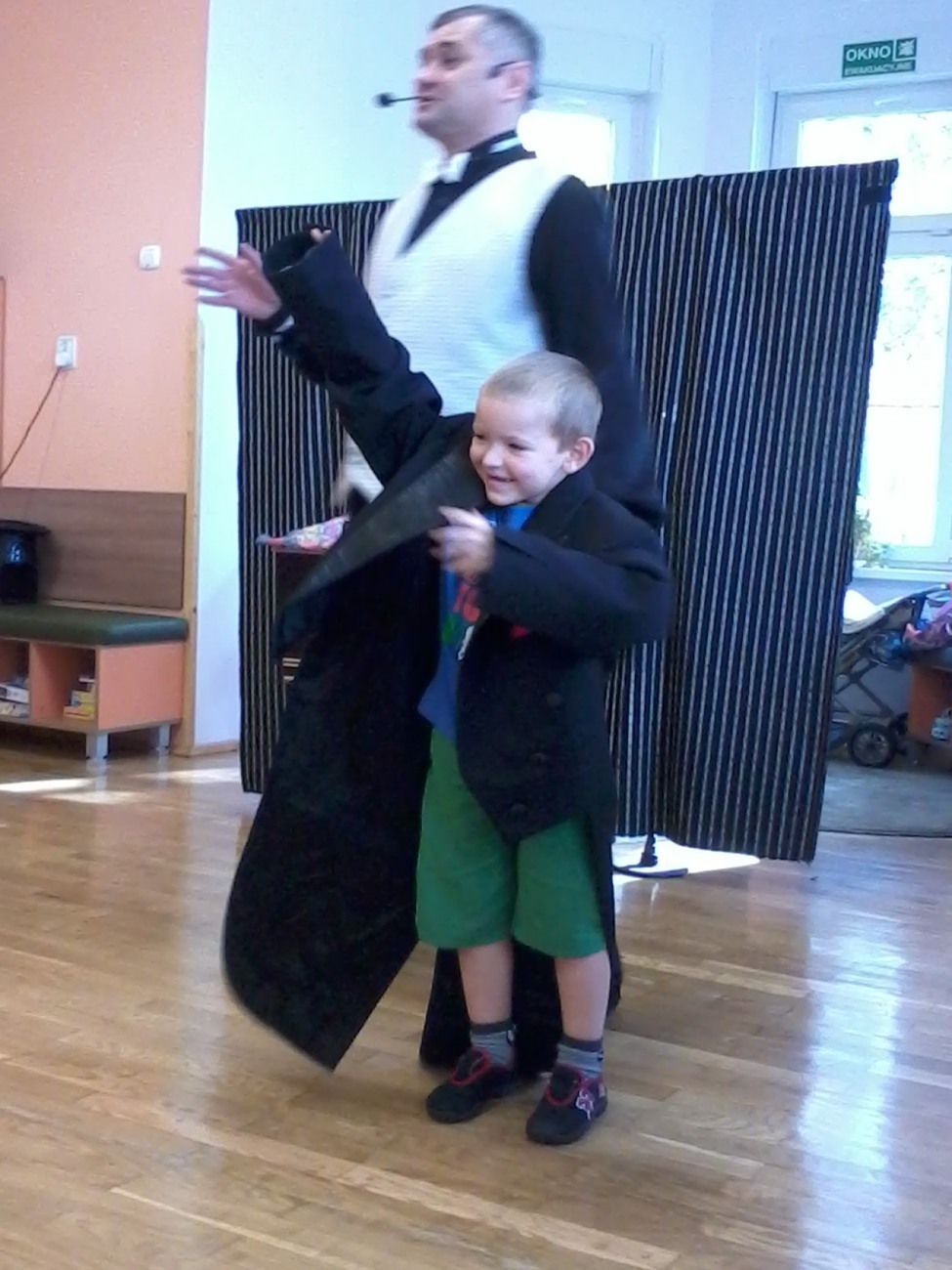 Dzisiejszy czas po drugim śniadaniu nasze przedszkole zostało zaczarowane przez Magika - iluzjonistę. Wszystkie grupy brały udział w niesamowitym spektaklu. Mogliśmy podziwiać liczne, magiczne sztuczki. Każdą z nich nasze przedszkolaki komentowały : „WOW”. Wszyscy nauczyli się nagradzać naszego Gościa - Artystę brawami. W czasie spektaklu dzieci podziwiały znikające chusteczki, zmieniające kolor kwiaty, w nierealny wręcz sposób łączące się ze sobą metalowe obręcze. Prawdziwą „furorę” zrobiła maszynka do pieniędzy - zamieniająca białe prostokąty w banknoty. Niemałym aplauzem została nagrodzona sztuczka w wyniku, której w rękach Magika pojawił się biały gołąb, albo w pustym pudełku królik. Niestety co dobre szybko się kończy. Magia przedstawienia ulotniła się i musieliśmy wrócić do rzeczywistości w naszych salach.