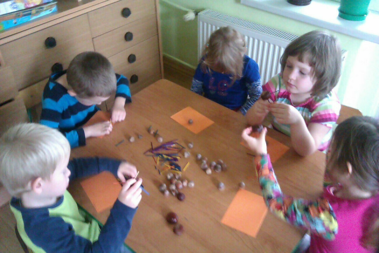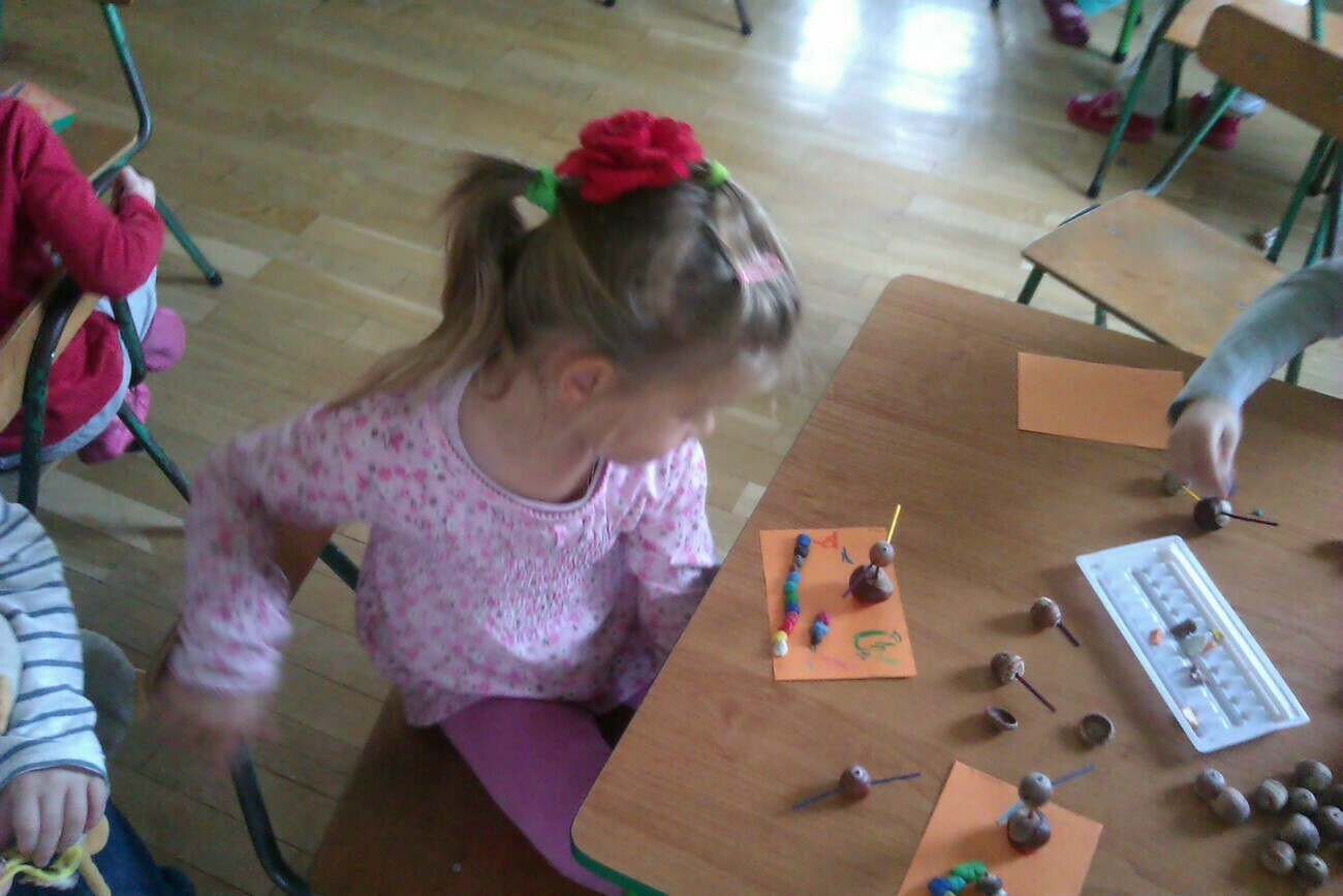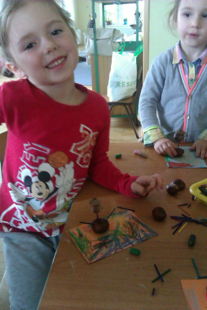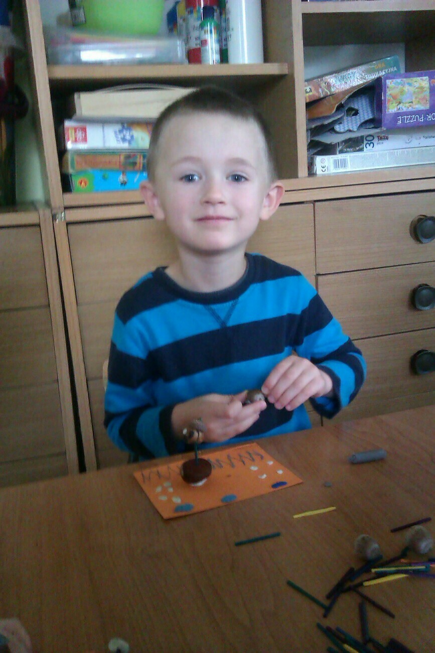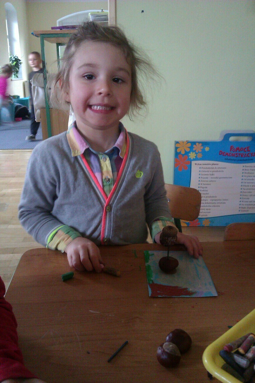 Nasze kosze pełne były skarbów jesieni, które zebraliśmy na wcześniejszych spacerach i wyprawach do lasu. Od rana zabraliśmy się za ludziki z kasztanów. Pani pomagała zrobić dziurki z kasztanach i żołędziach, a my wkładaliśmy do nich kolorowe zapałki. Prace można było wzbogacić o rysunki pastelami, a także wyklejanie plasteliną. Obrazy, które stworzyliśmy, były bardzo ciekawe i kolorowe. Zaraz po wykonaniu prac plastycznych czym prędzej wyruszyliśmy na jesienny spacer do pobliskiego parku na Wzgórzu Kościuszki. Pogoda dopisywała, a park jesienią wyglądał pięknie. Przedszkolaki bawiły się w berka, rzucały kolorowymi liśćmi i tarzały w kopcach, które wcześniej usypały. Radości i śmiechu było bez liku. Wszyscy zadowoleni i bardzo głodni wróciliśmy do przedszkola. Dzień minął nam szybciutko :)