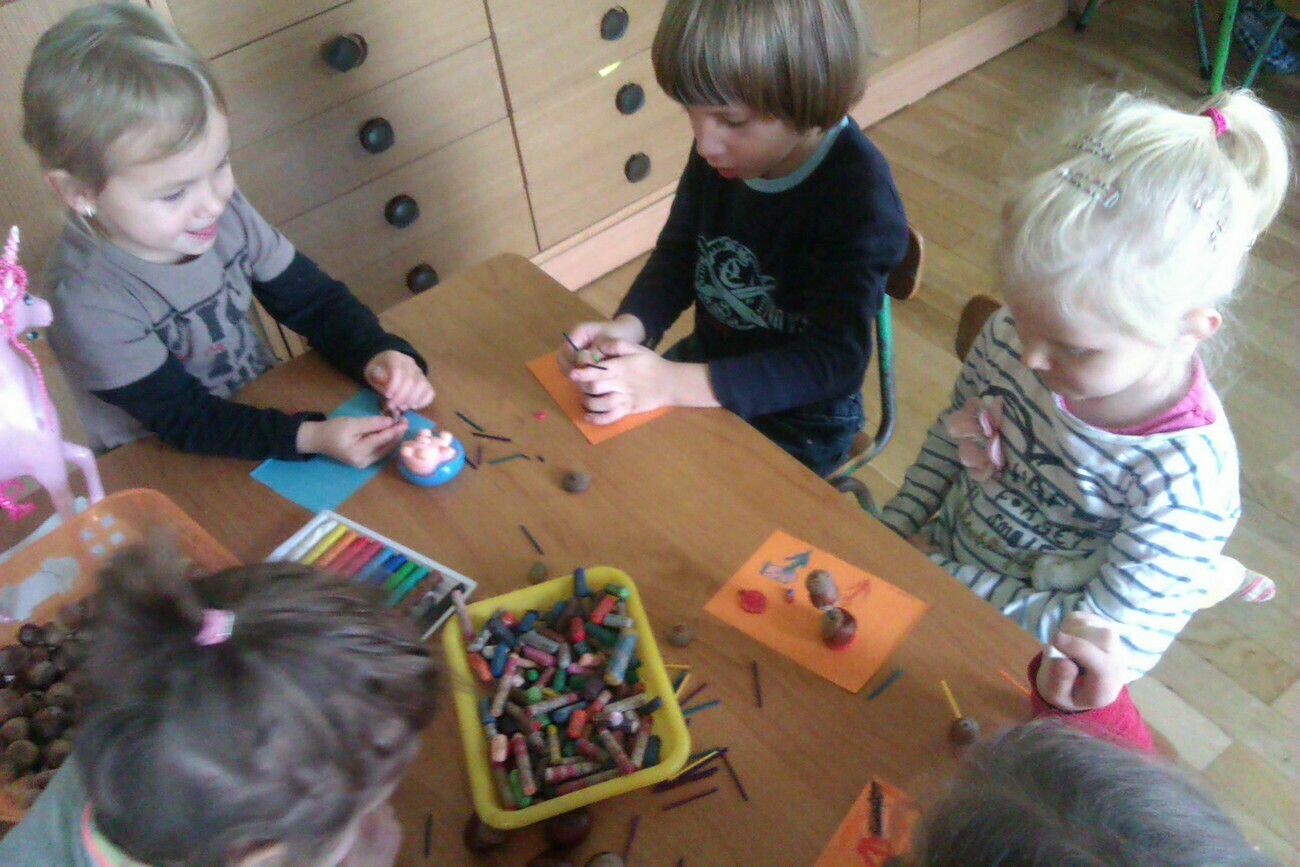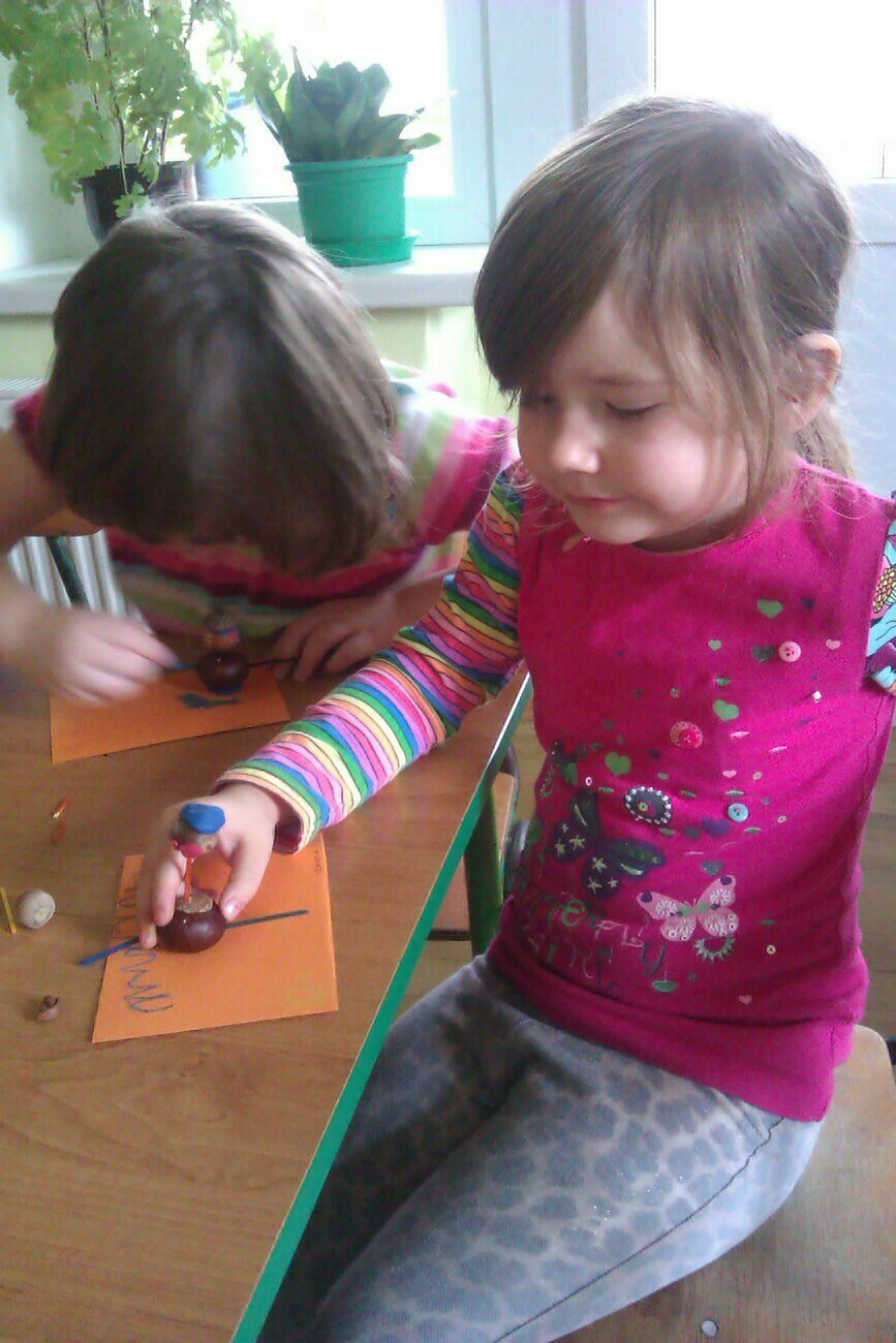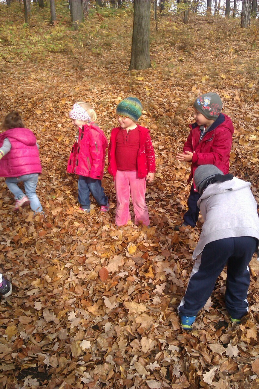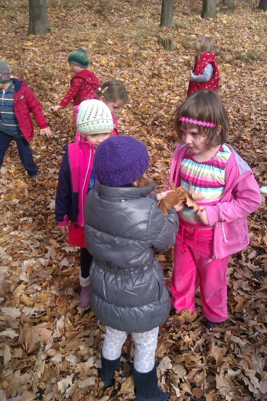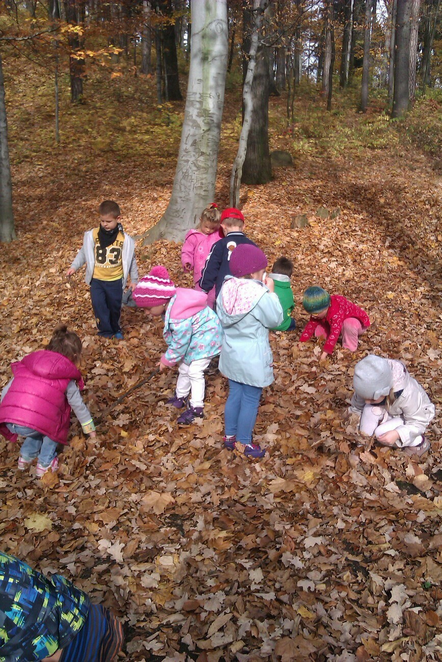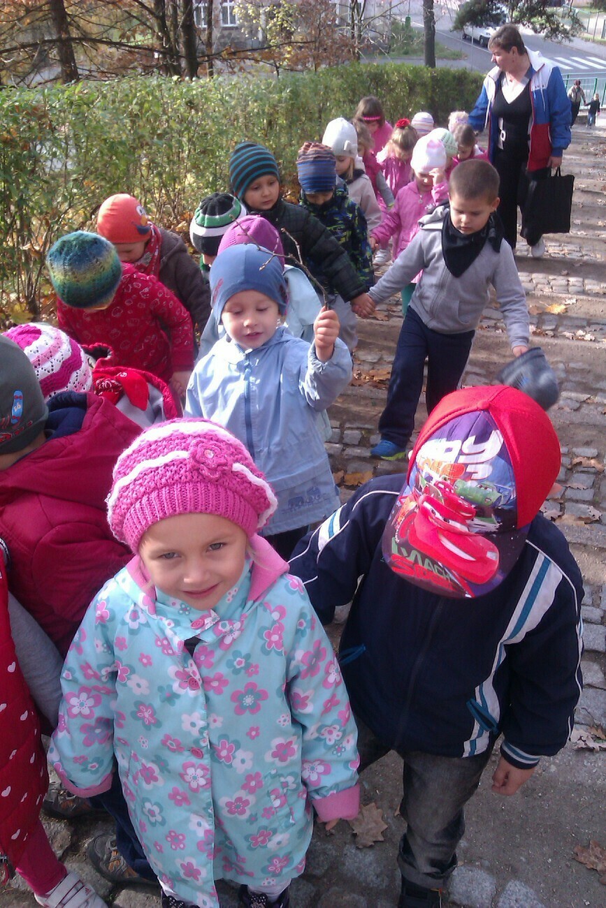Nasze kosze pełne były skarbów jesieni, które zebraliśmy na wcześniejszych spacerach i wyprawach do lasu. Od rana zabraliśmy się za ludziki z kasztanów. Pani pomagała zrobić dziurki z kasztanach i żołędziach, a my wkładaliśmy do nich kolorowe zapałki. Prace można było wzbogacić o rysunki pastelami, a także wyklejanie plasteliną. Obrazy, które stworzyliśmy, były bardzo ciekawe i kolorowe. Zaraz po wykonaniu prac plastycznych czym prędzej wyruszyliśmy na jesienny spacer do pobliskiego parku na Wzgórzu Kościuszki. Pogoda dopisywała, a park jesienią wyglądał pięknie. Przedszkolaki bawiły się w berka, rzucały kolorowymi liśćmi i tarzały w kopcach, które wcześniej usypały. Radości i śmiechu było bez liku. Wszyscy zadowoleni i bardzo głodni wróciliśmy do przedszkola. Dzień minął nam szybciutko :)