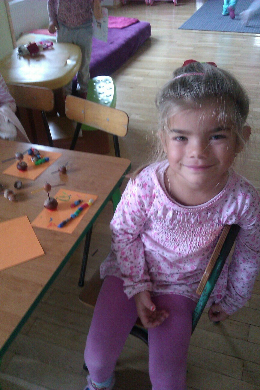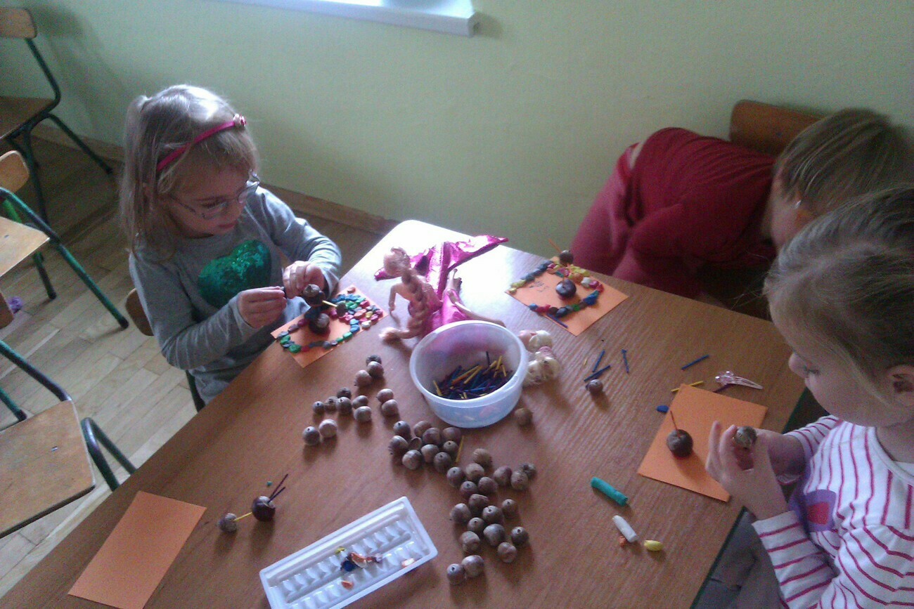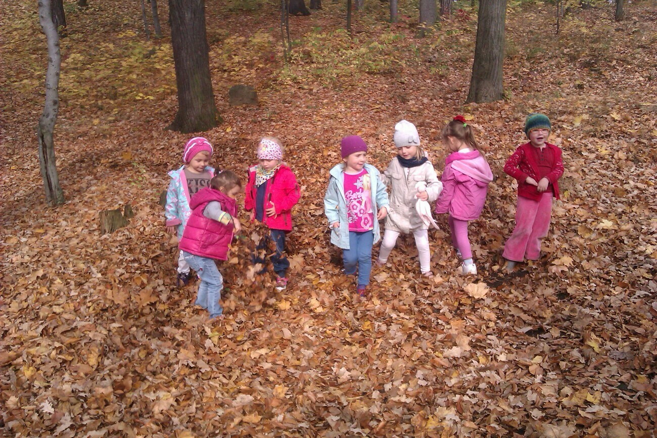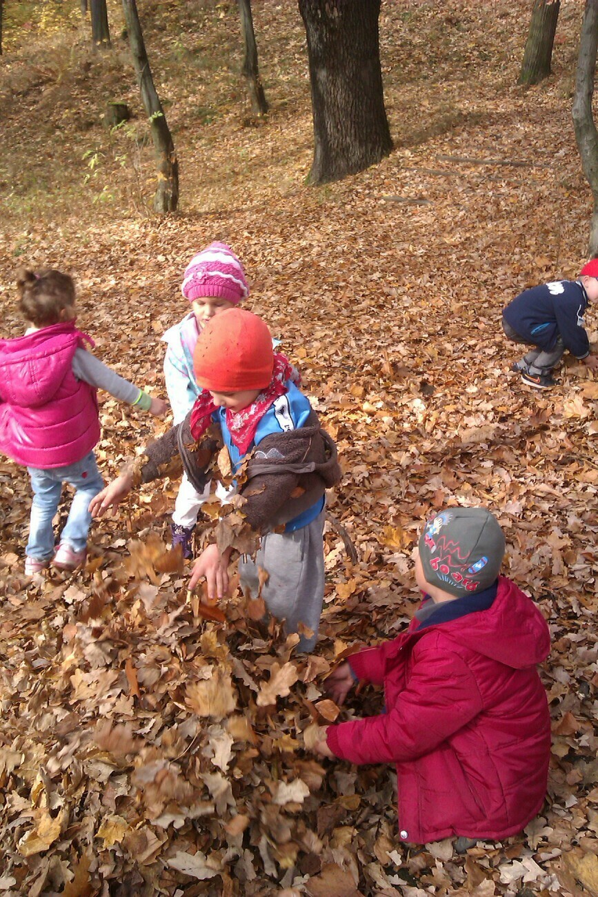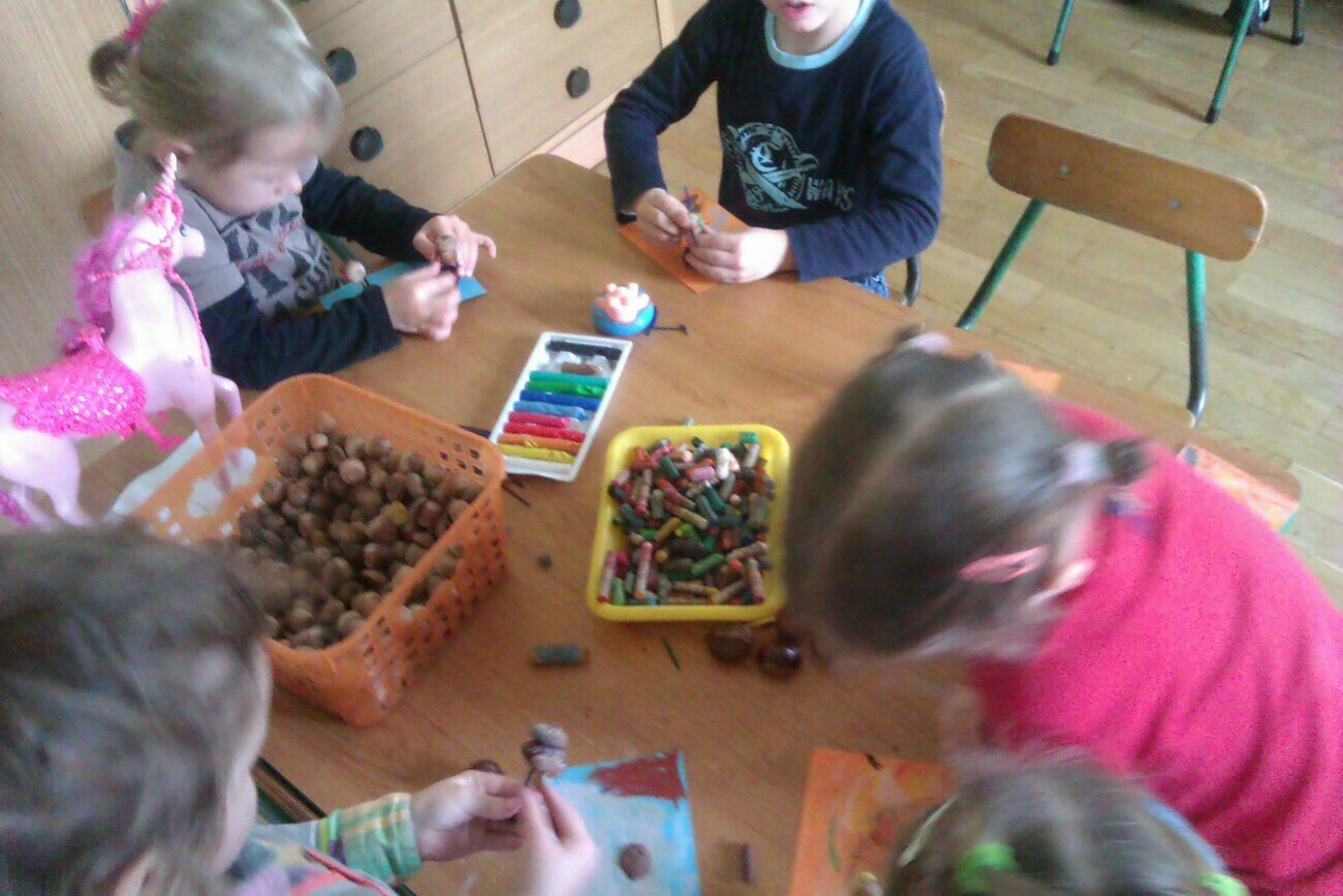 Nasze kosze pełne były skarbów jesieni, które zebraliśmy na wcześniejszych spacerach i wyprawach do lasu. Od rana zabraliśmy się za ludziki z kasztanów. Pani pomagała zrobić dziurki z kasztanach i żołędziach, a my wkładaliśmy do nich kolorowe zapałki. Prace można było wzbogacić o rysunki pastelami, a także wyklejanie plasteliną. Obrazy, które stworzyliśmy, były bardzo ciekawe i kolorowe. Zaraz po wykonaniu prac plastycznych czym prędzej wyruszyliśmy na jesienny spacer do pobliskiego parku na Wzgórzu Kościuszki. Pogoda dopisywała, a park jesienią wyglądał pięknie. Przedszkolaki bawiły się w berka, rzucały kolorowymi liśćmi i tarzały w kopcach, które wcześniej usypały. Radości i śmiechu było bez liku. Wszyscy zadowoleni i bardzo głodni wróciliśmy do przedszkola. Dzień minął nam szybciutko :)