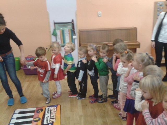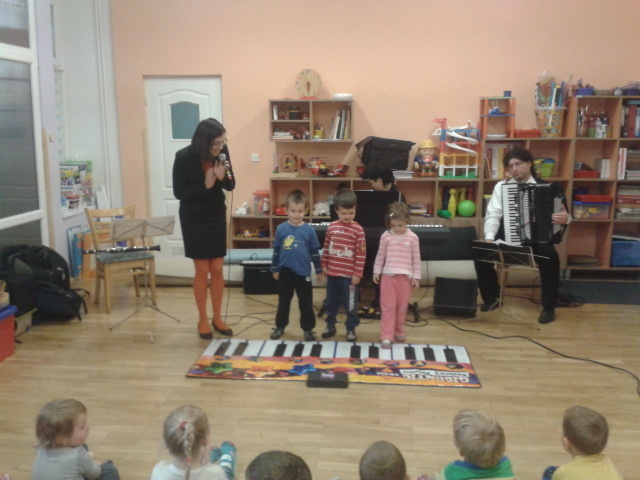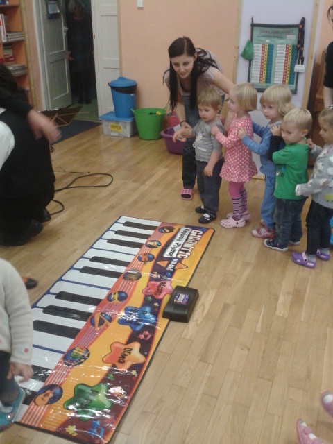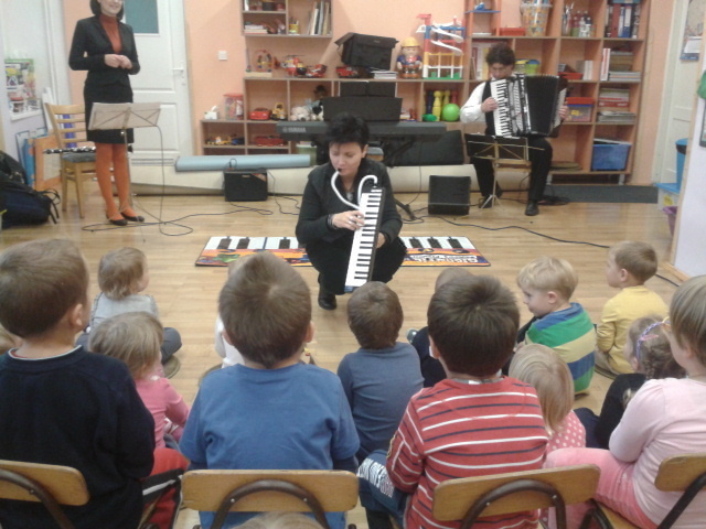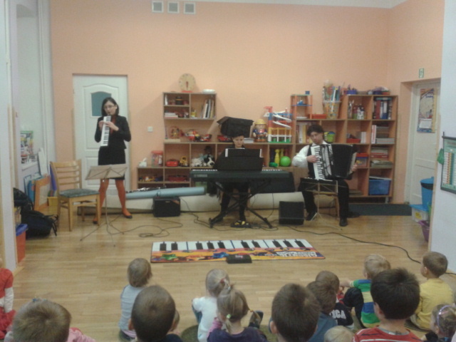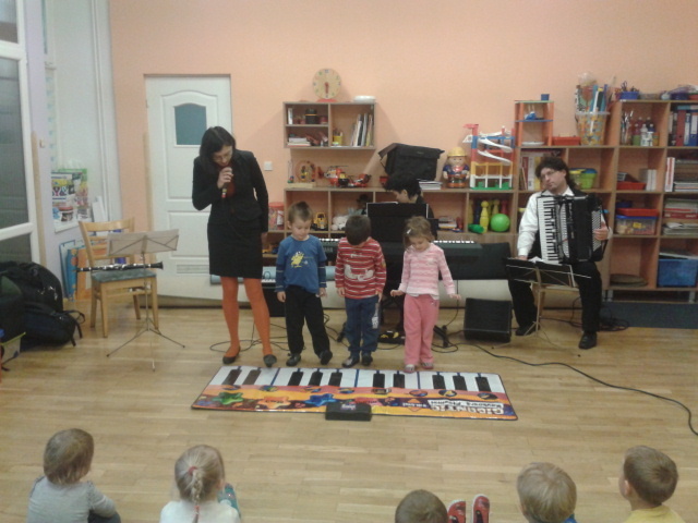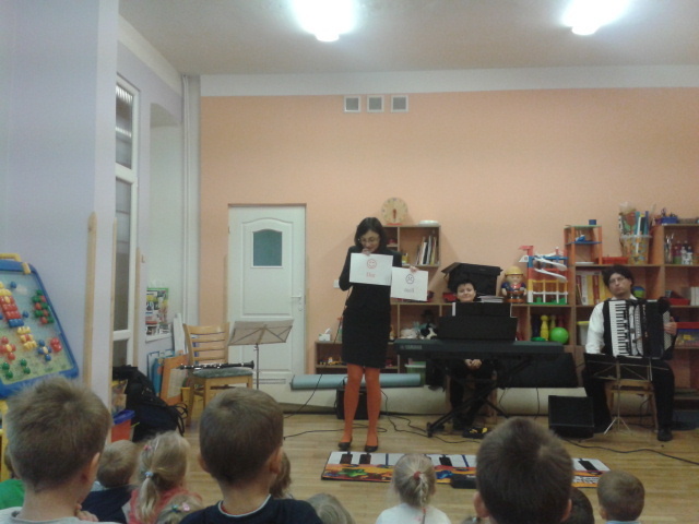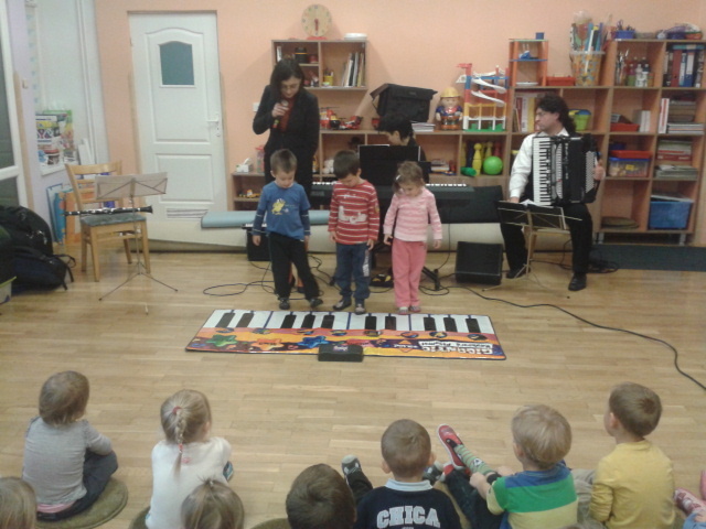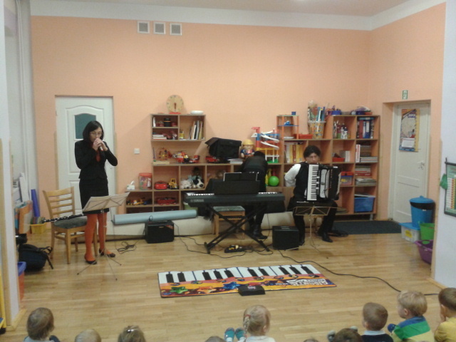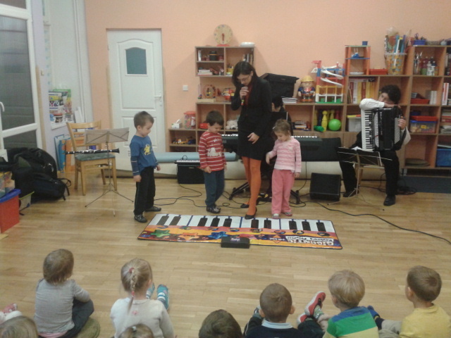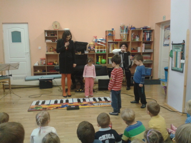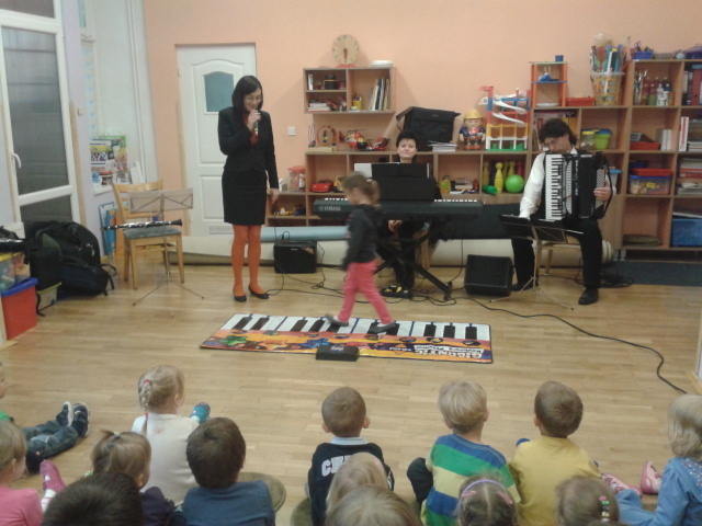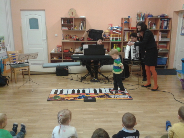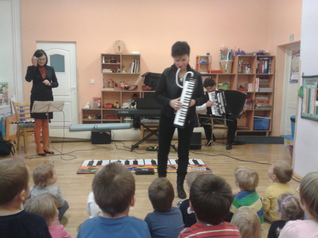 Opowiedzieli nam historię pewnej dziewczynki, która miała na imię Muzyka oraz o jej przyjaciółce Harmonii. Jak każda dziewczynka i każde dziecko, Muzyka chciała się bawić i mieć przyjaciół i miewała też różny humor. Raz była wesoła (durowa), a innym razem smutna (mollowa). Przedszkolaki miały okazję dowiedzieć się, że każdy utwór ma swój charakter i nastrój. Mogły odkryć tajemniczą krainę Harmonii i poznać dokładniej świat dźwięków. Dzieci bawiły się również w detektywów i próbowały odkryć czy muzyka, którą słyszą jest durowa (wesoła) czy mollowa (smutna). Na koniec przygody wracając do swoich sal, każdy mógł przejść przez klawiszowy mostek, tym samym wygrywając swoją melodię.