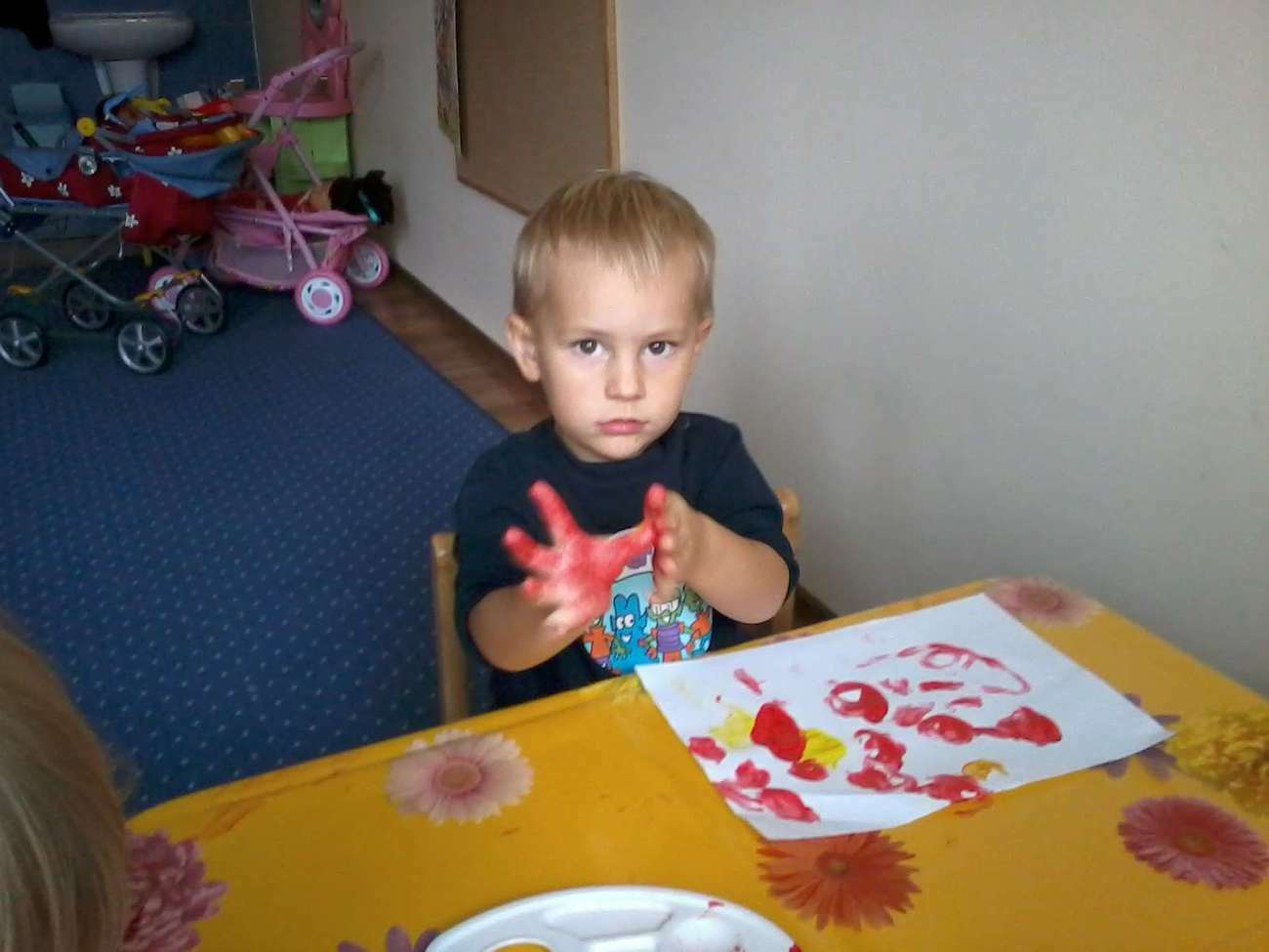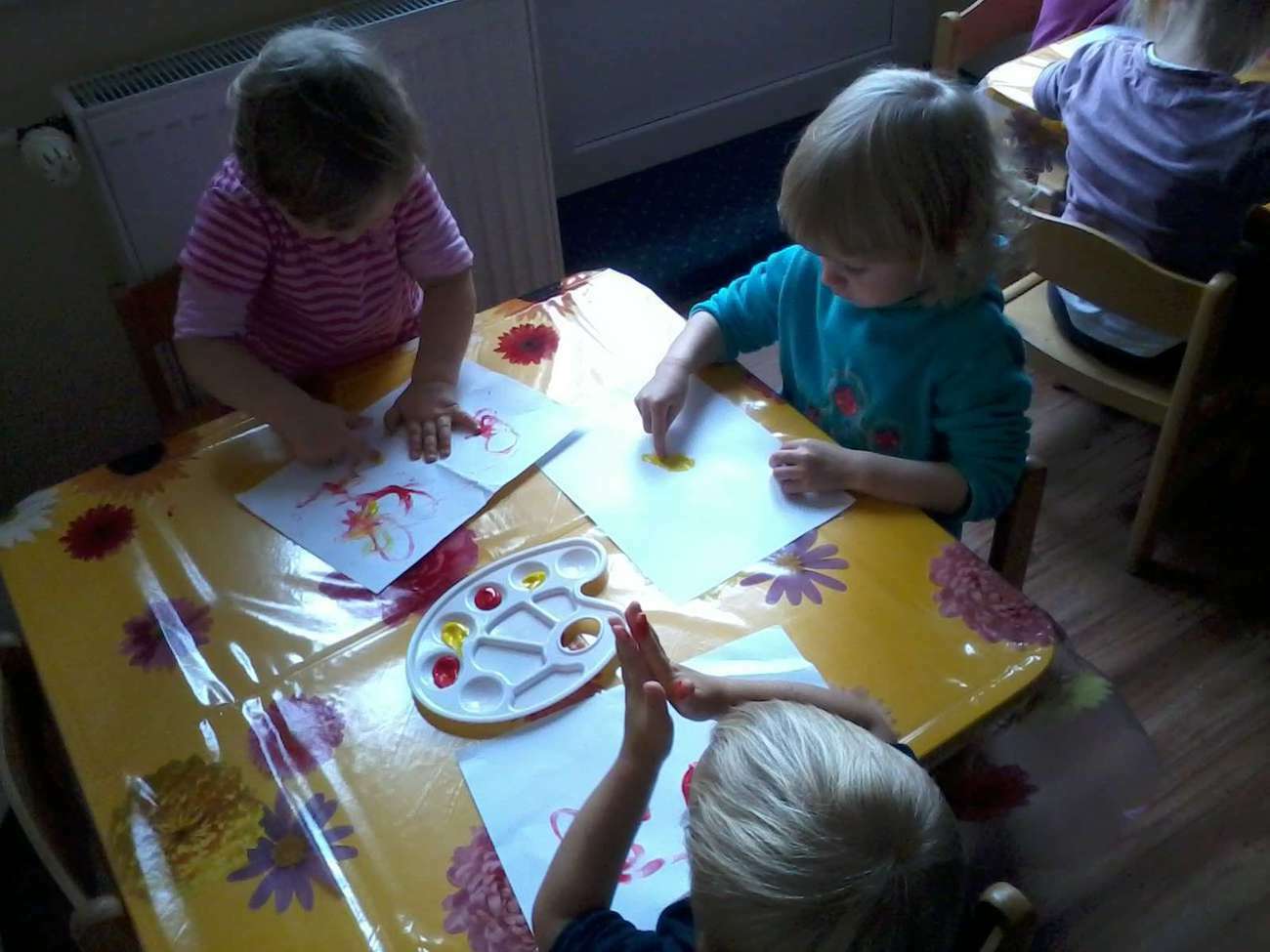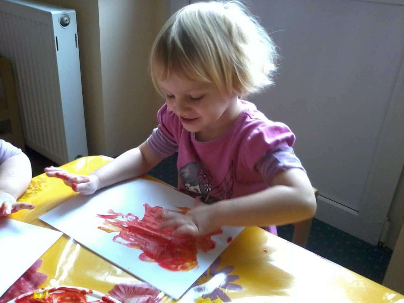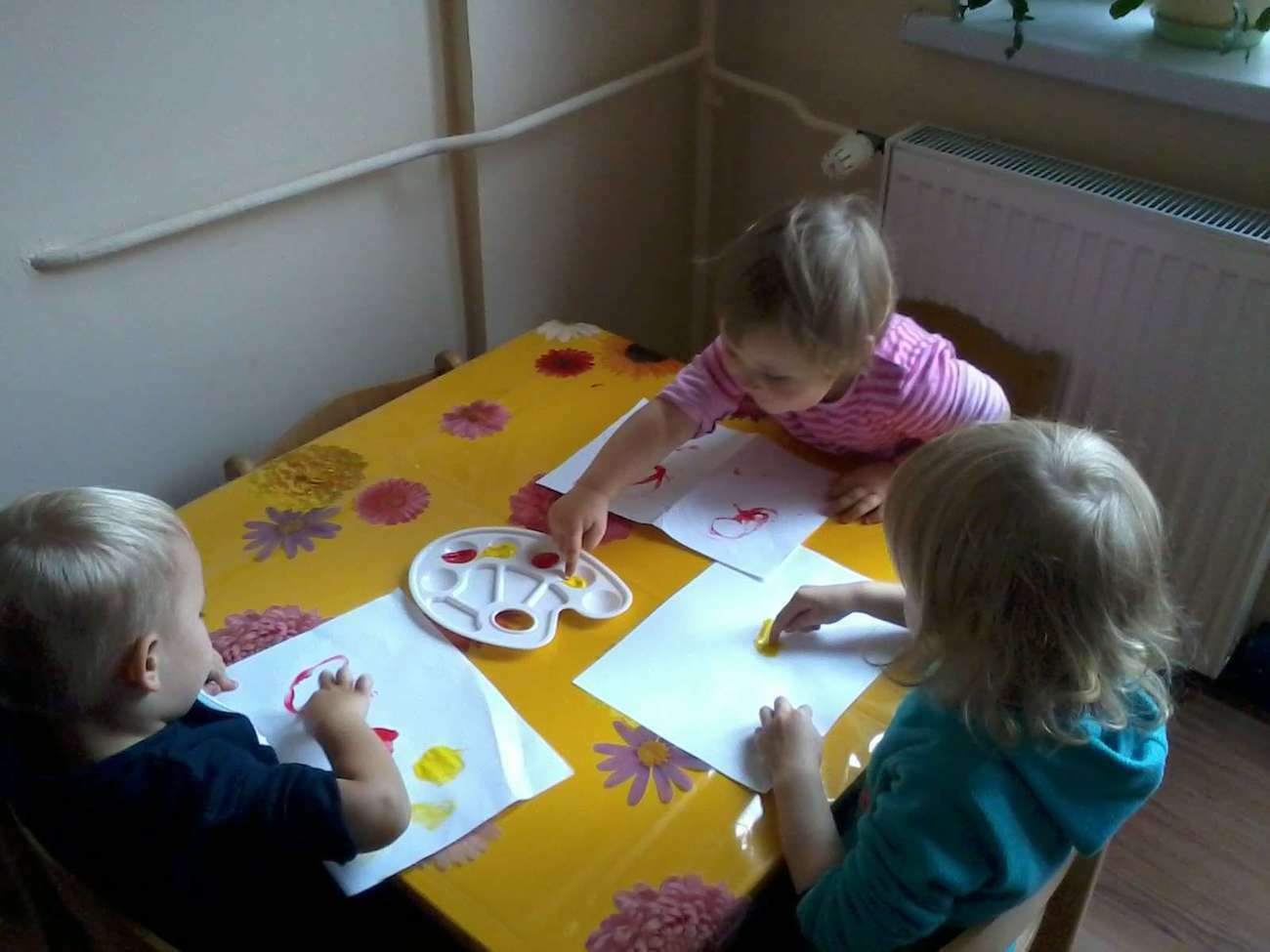 Kiedy nadeszła upragniona chwila rozłożyliśmy ceratę. I zaczęliśmy malować, jakie było zdziwienie kiedy się okazało, że pani nie dała nikomu pędzla........... bo malowaliśmy paluszkami.