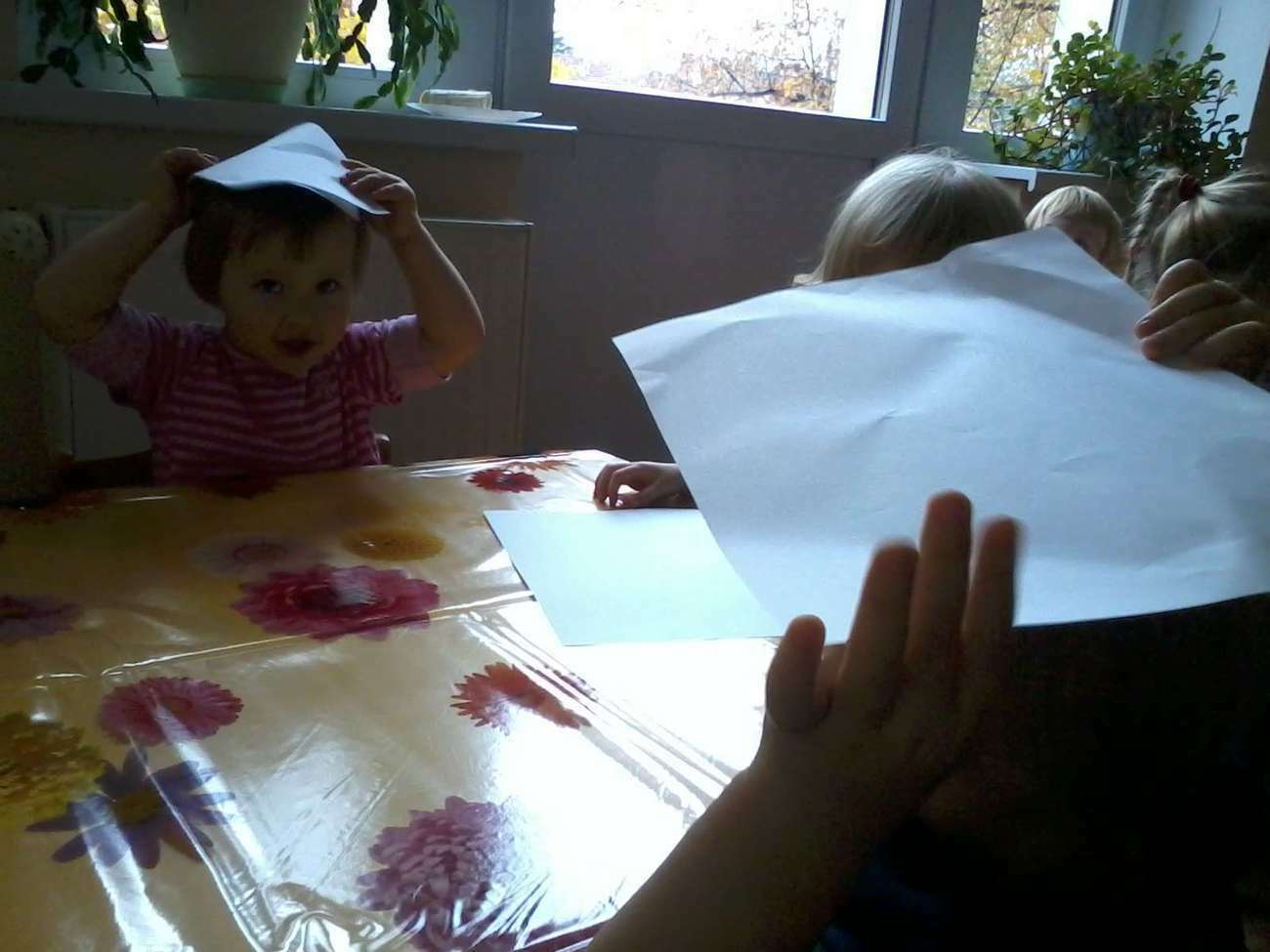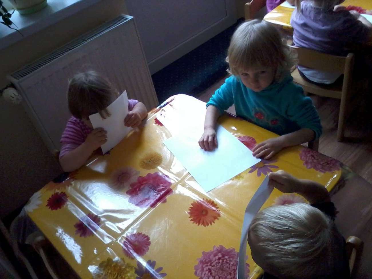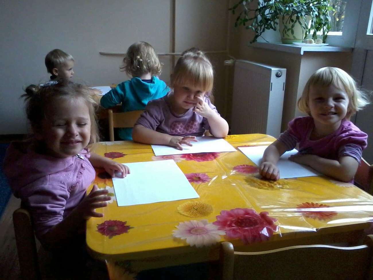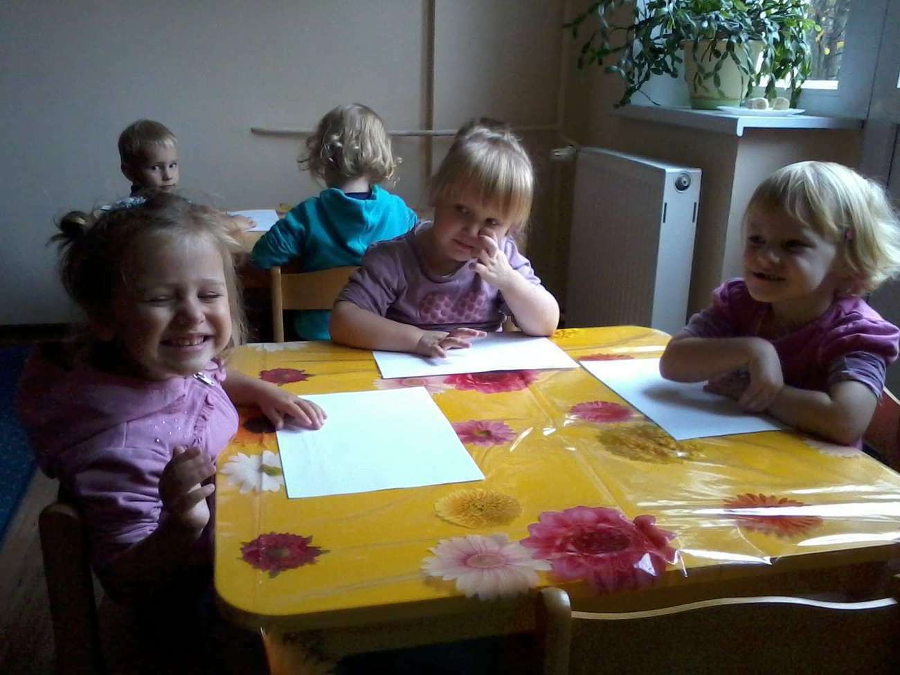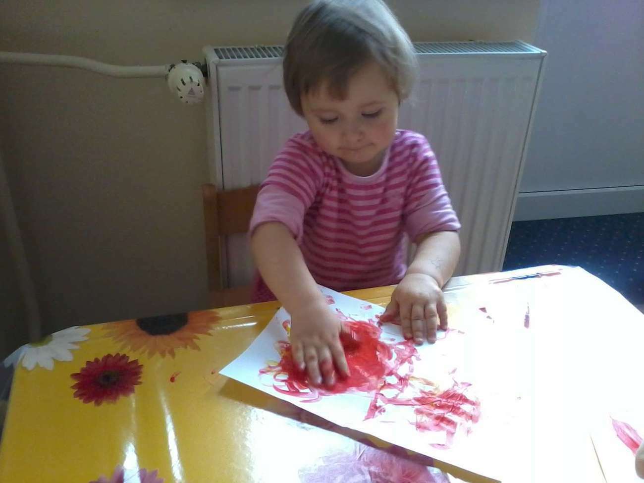 Kiedy nadeszła upragniona chwila rozłożyliśmy ceratę. I zaczęliśmy malować, jakie było zdziwienie kiedy się okazało, że pani nie dała nikomu pędzla........... bo malowaliśmy paluszkami.