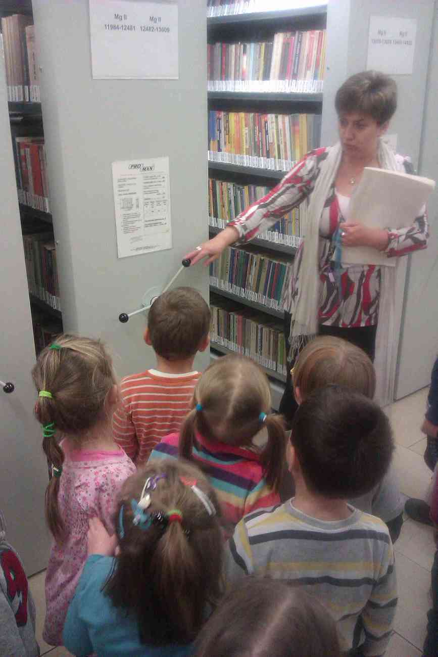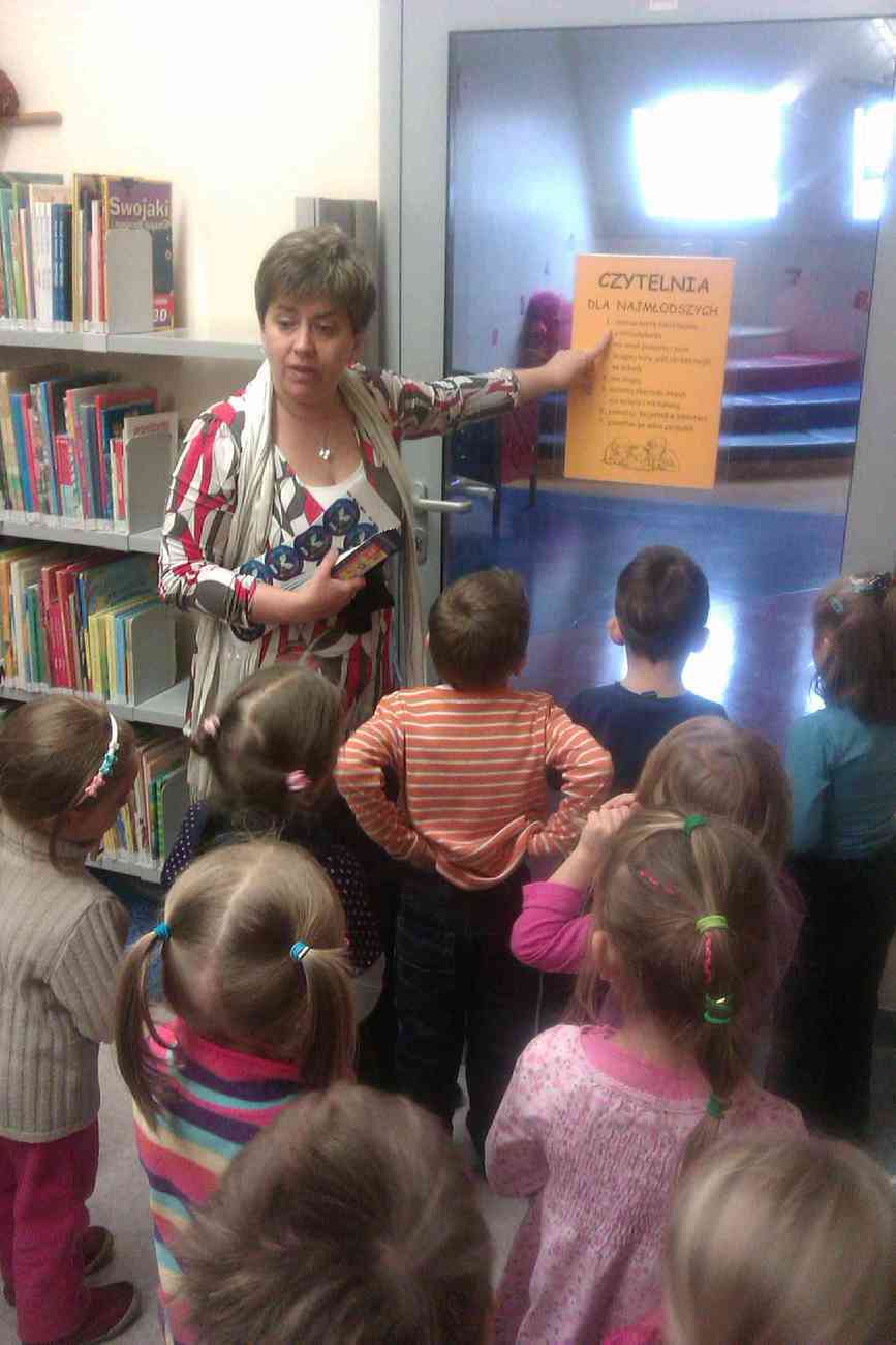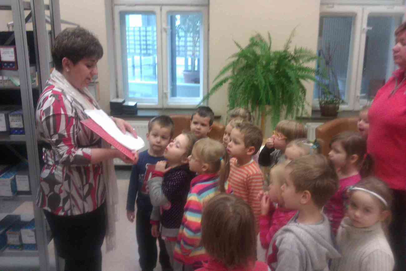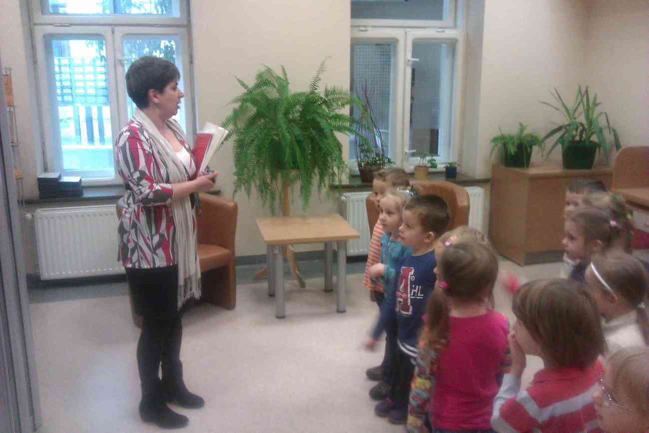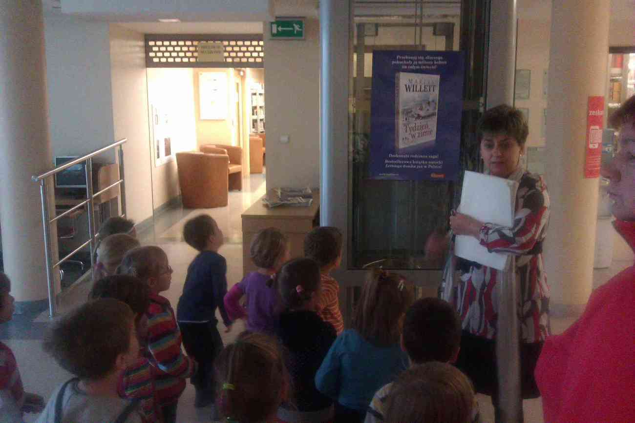 W piątek mimo ponurej pogody wybraliśmy się do Książnicy Karkonoskiej na lekcję biblioteczną. Było to nasze pierwsze wyjście w tego typu miejsce, dlatego też wcześniej przypomnieliśmy sobie jak należy się zachowywać w bibliotece. Przedszkolaki dzielnie i bardzo sprawnie dotarły na miejsce. Nie da się ukryć, że coraz sprawniej poruszamy się całą grupą. Widać, że częste i długie spacery przyniosły efekty. Urwisy nawet nie zauważyły, kiedy znaleźliśmy się na miejscu :) Spotkanie rozpoczęliśmy od zwiedzania biblioteki. Pani bibliotekarka obiecała pokazać nam miejsca niedostępne dla odwiedzających bibliotekę czytelników. Tak też się stało. Odwiedziliśmy wszystkie piętra biblioteki . Mogliśmy zobaczyć książki dla niewidomych i dowiedzieć się jak uczą się pisać co okazało się nie lada wyczynem. Mogliśmy również zobaczyć wystawę robaków, która niezwykle nas zainteresowała. Odwiedziliśmy także panie, które pracują w piwnicy i wysyłają ksiązki specjalna winda dla książek. Na końcu odwiedziliśmy czytelnie dla dzieci do której każdy przedszkolak obiecał zabrać rodziców. Pani bibliotekarka pokazała nam wiele książek dla dzieci, także niezwykle ciekawe i pobudzające wyobraźnię ksiązki przestrzenne. Wszyscy otrzymali zakładki do ksiązki i nalepki z logo akcji "Cała Polska Czyta Dzieciom". Każdy przedszkolak obiecał przypomnieć w domu jak ważne dla dzieci jest czytanie książek i jak najszybciej wrócić do czytelni z rodzicami:)