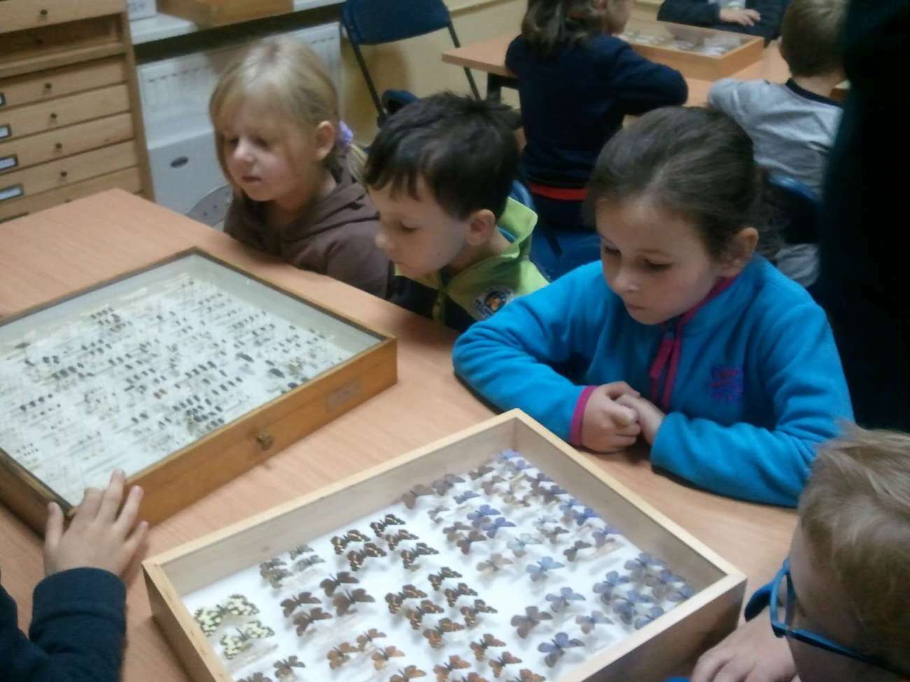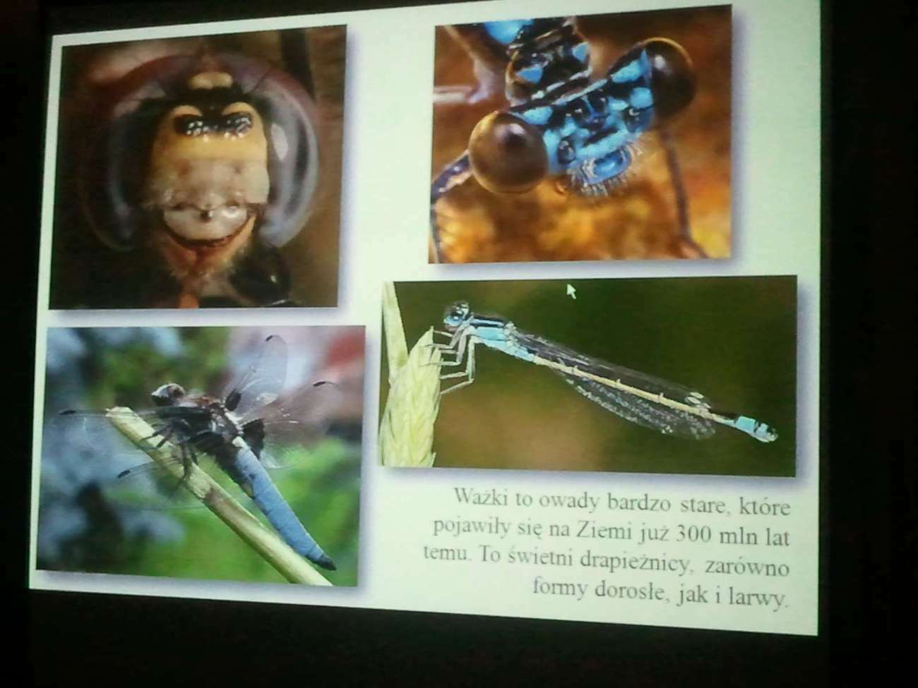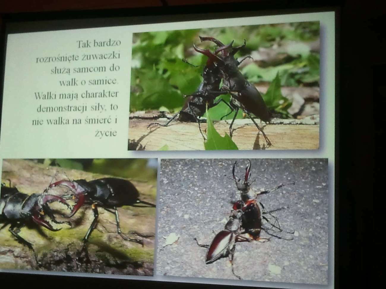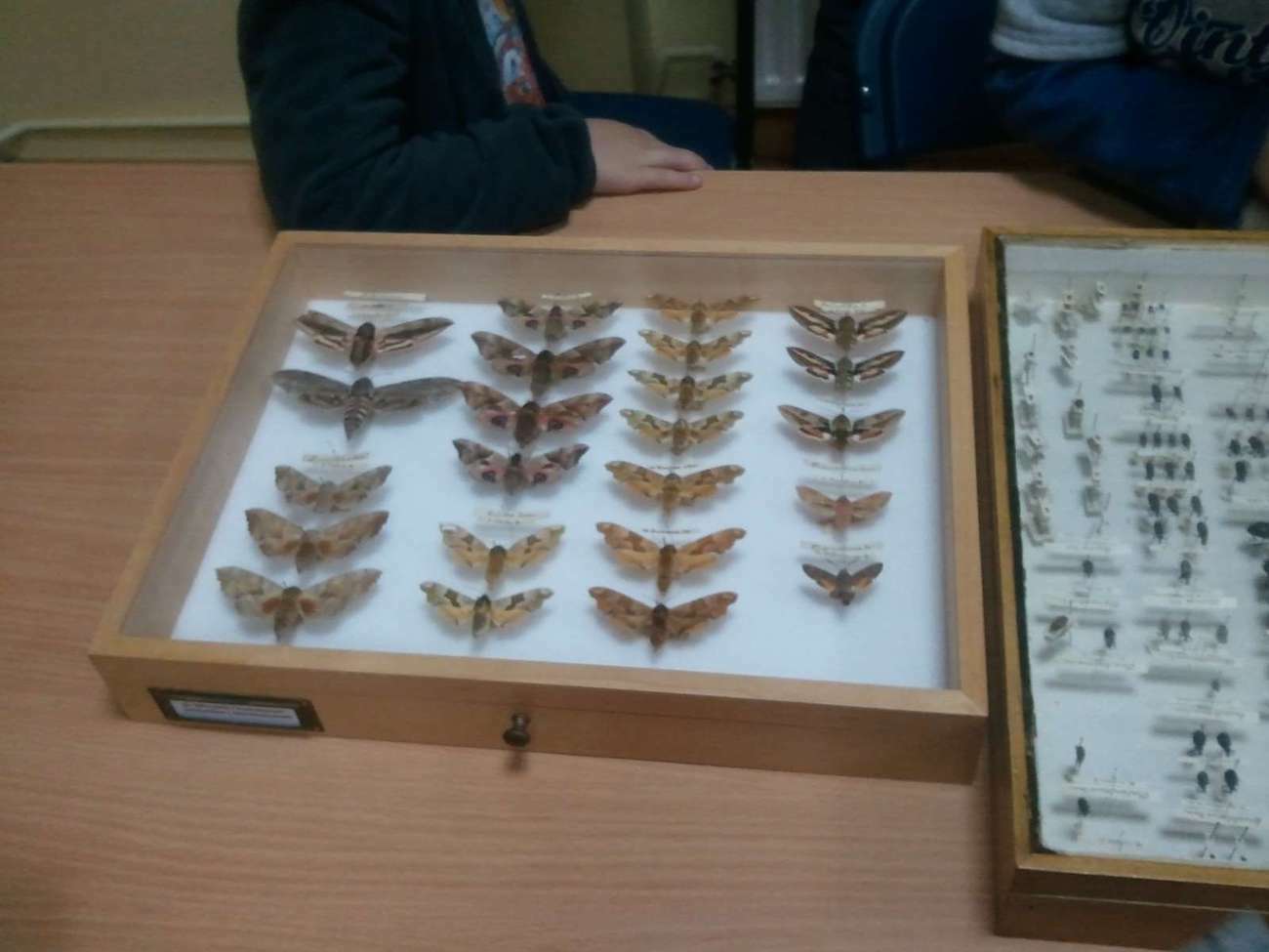 Po zakończonej prezentacji przeszliśmy do drugiego pomieszczenia, gdzie w gablotach oglądaliśmy różne gatunki much, motyli, żuków, chrabąszczy i ważek. Mogliśmy się im przyjrzeć z bardzo bliska, dzięki binokularom, które udostępnił nam pan prowadzący spotkanie. W tym powiększeniu owady wydawały się strasznymi istotami nie z tego świata. Pomimo tego jak sami na początku przyznaliśmy, że nie każdy z nas lubi owady to po tym spotkaniu, wiemy, że są bardzo interesujące i warte bliższego poznania.