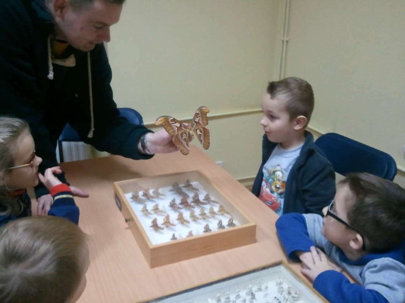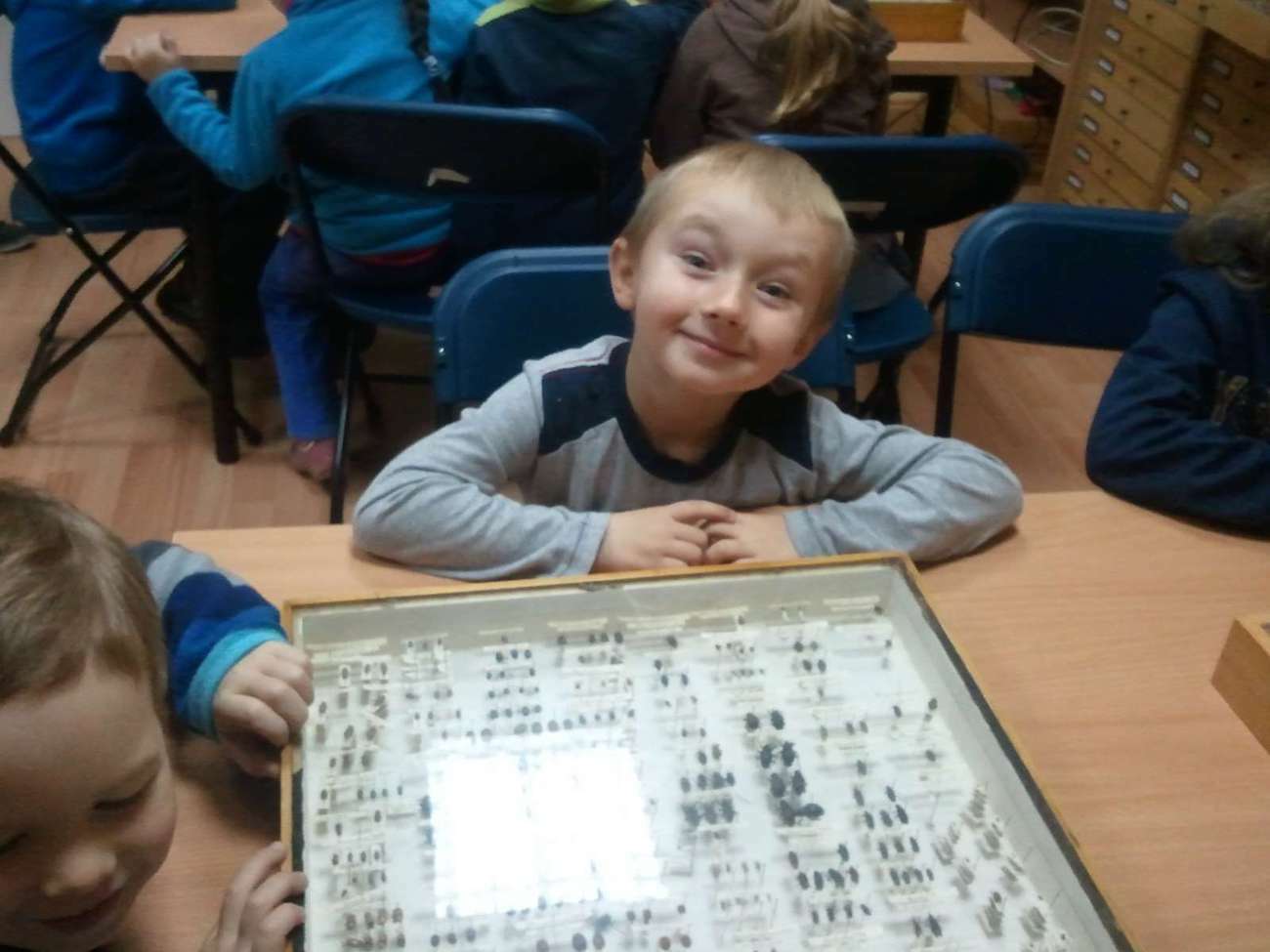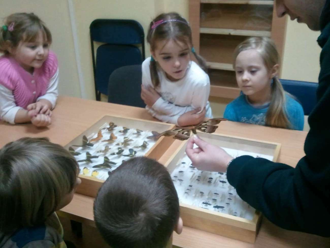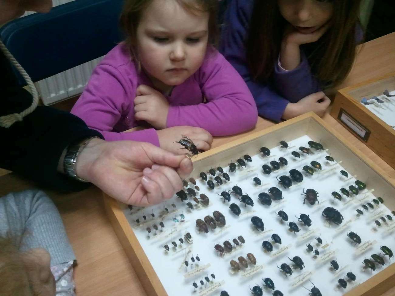 Po zakończonej prezentacji przeszliśmy do drugiego pomieszczenia, gdzie w gablotach oglądaliśmy różne gatunki much, motyli, żuków, chrabąszczy i ważek. Mogliśmy się im przyjrzeć z bardzo bliska, dzięki binokularom, które udostępnił nam pan prowadzący spotkanie. W tym powiększeniu owady wydawały się strasznymi istotami nie z tego świata. Pomimo tego jak sami na początku przyznaliśmy, że nie każdy z nas lubi owady to po tym spotkaniu, wiemy, że są bardzo interesujące i warte bliższego poznania.