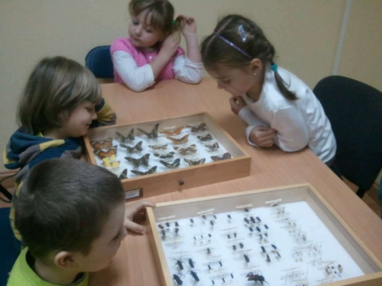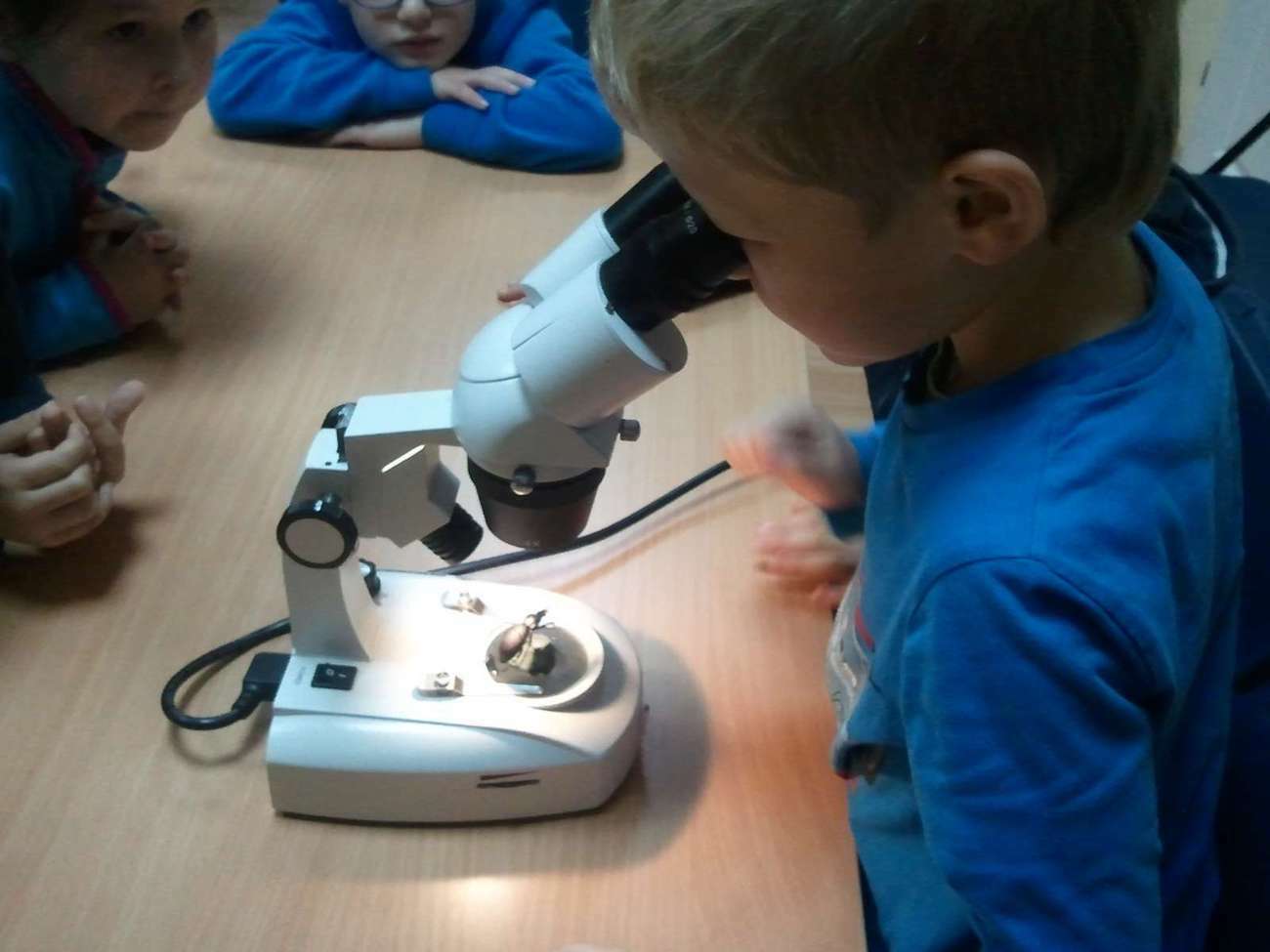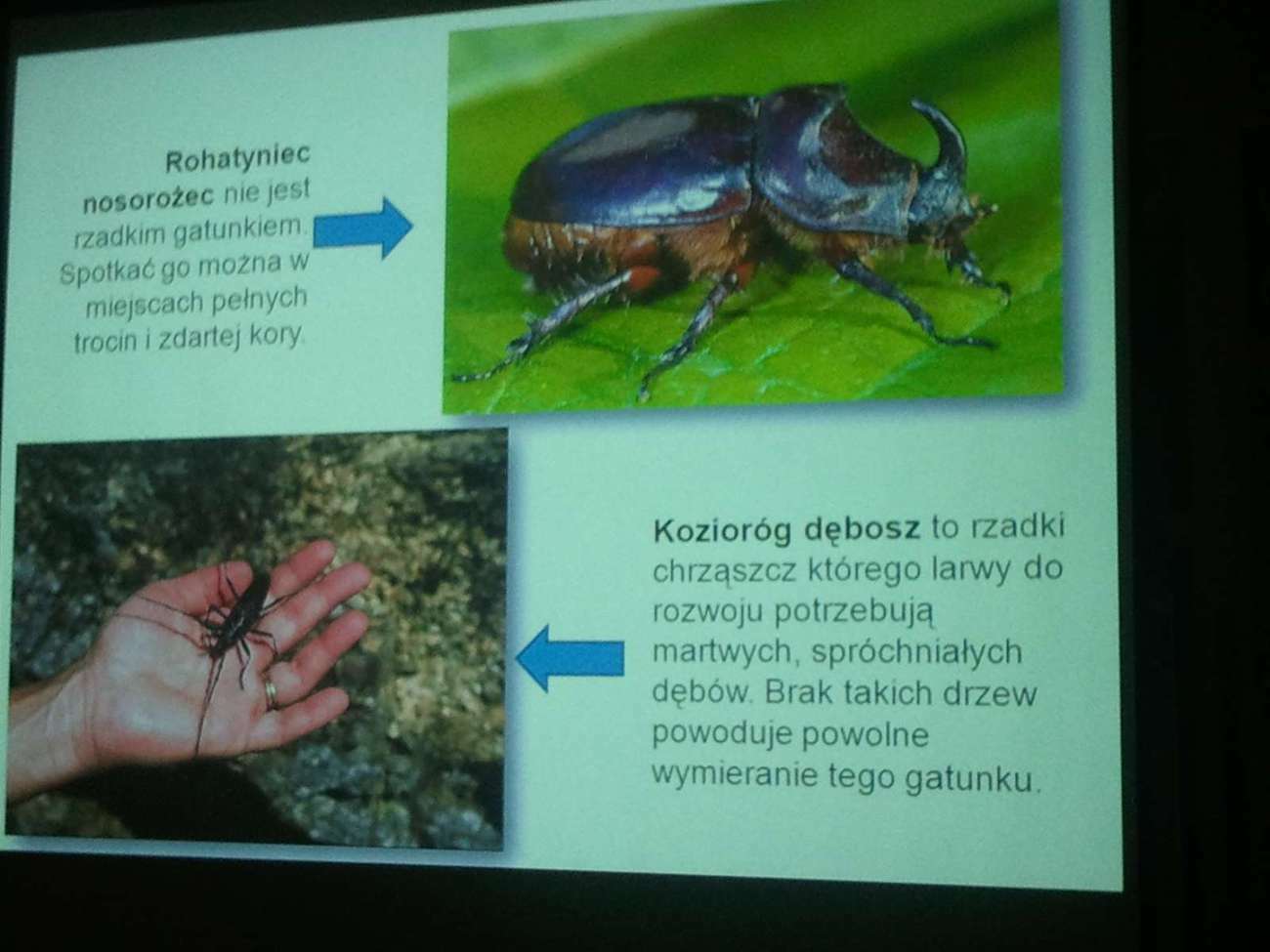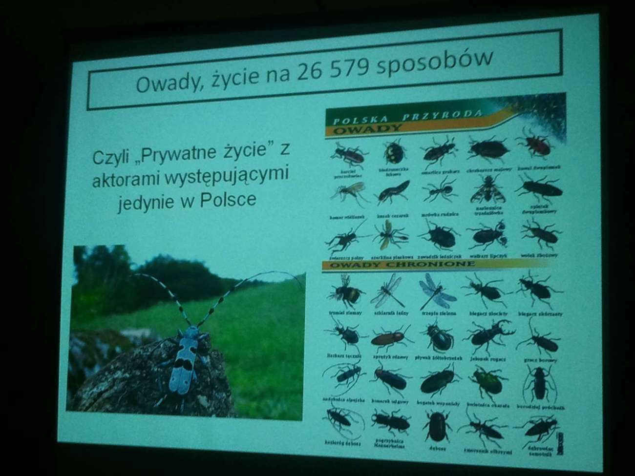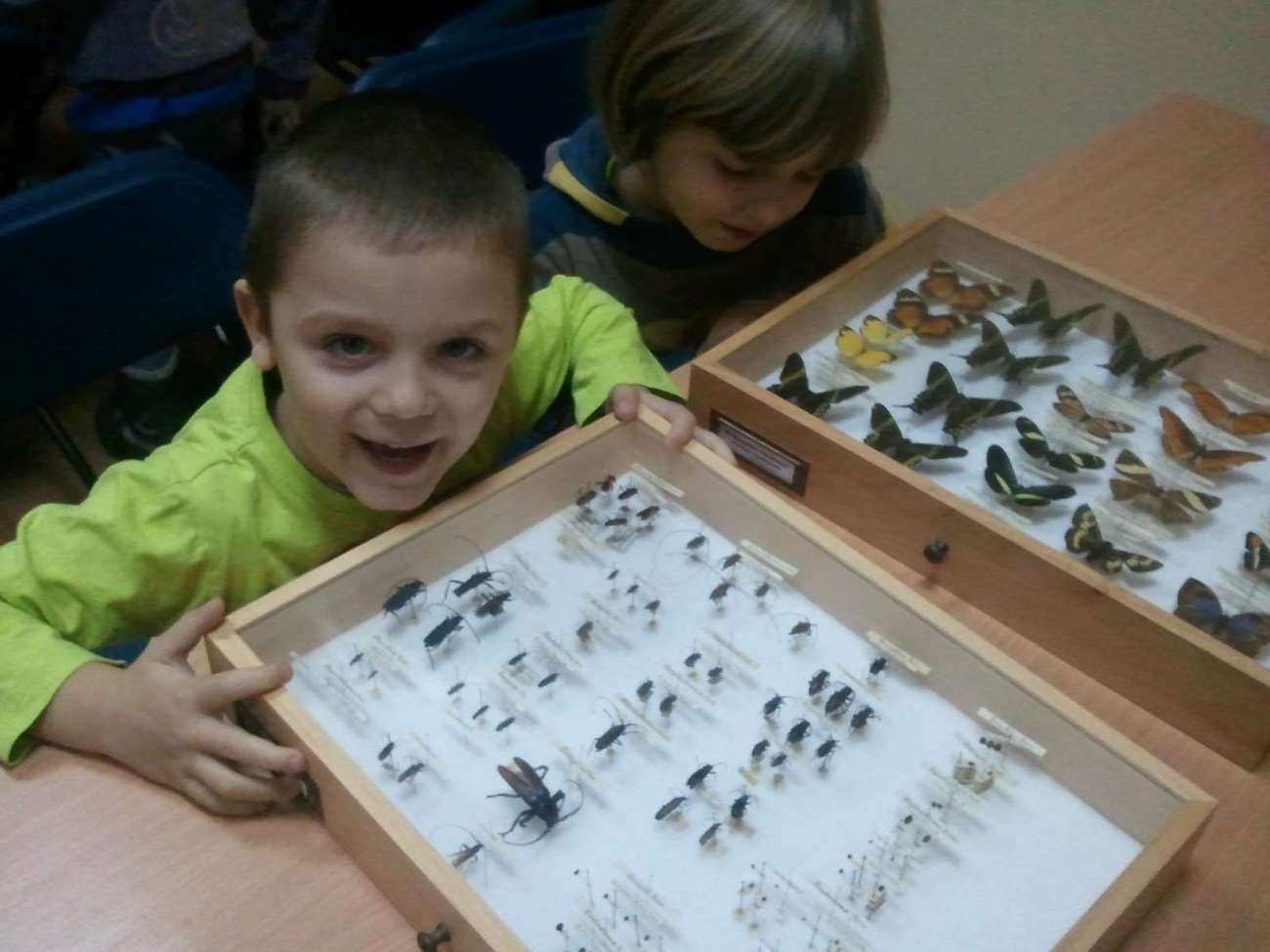 Po zakończonej prezentacji przeszliśmy do drugiego pomieszczenia, gdzie w gablotach oglądaliśmy różne gatunki much, motyli, żuków, chrabąszczy i ważek. Mogliśmy się im przyjrzeć z bardzo bliska, dzięki binokularom, które udostępnił nam pan prowadzący spotkanie. W tym powiększeniu owady wydawały się strasznymi istotami nie z tego świata. Pomimo tego jak sami na początku przyznaliśmy, że nie każdy z nas lubi owady to po tym spotkaniu, wiemy, że są bardzo interesujące i warte bliższego poznania.
