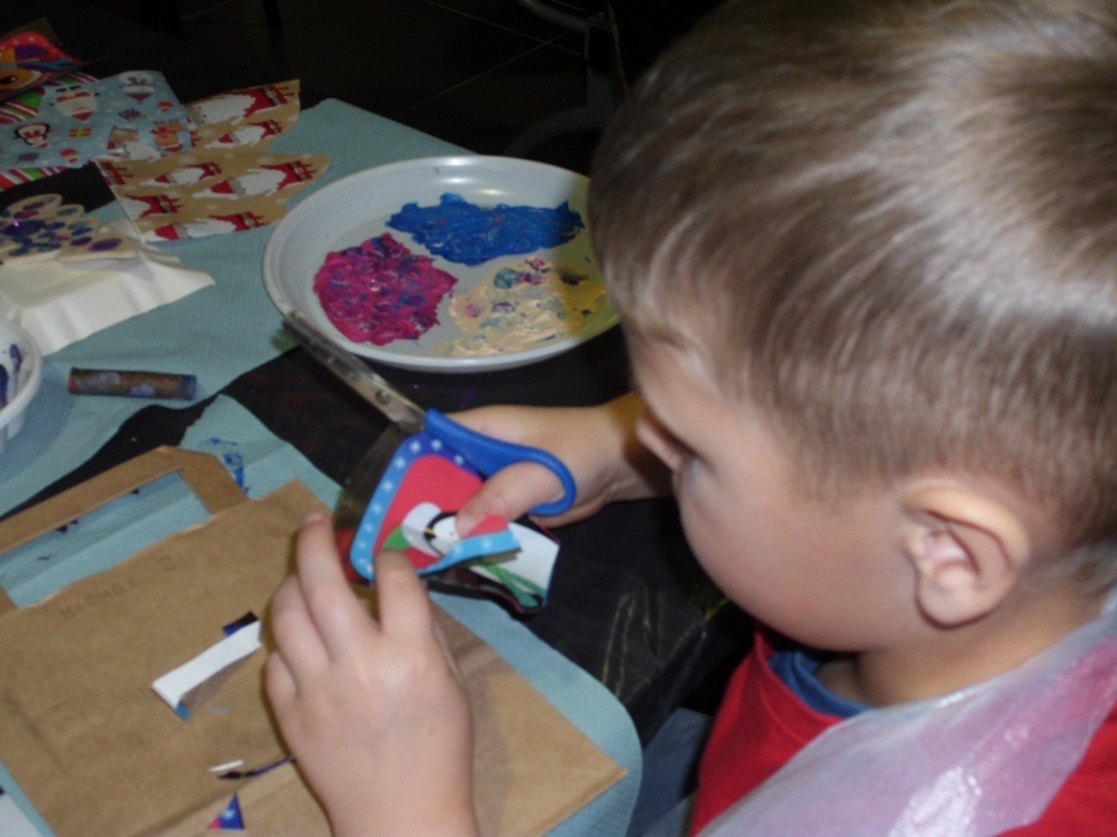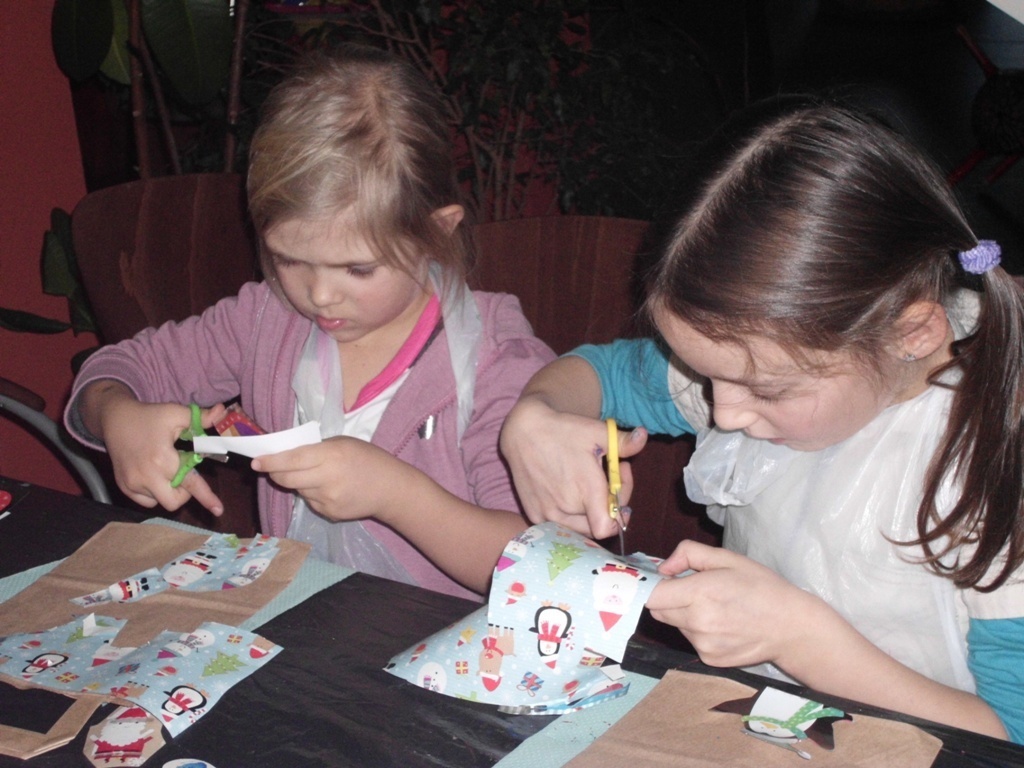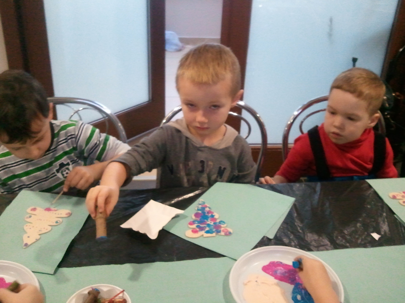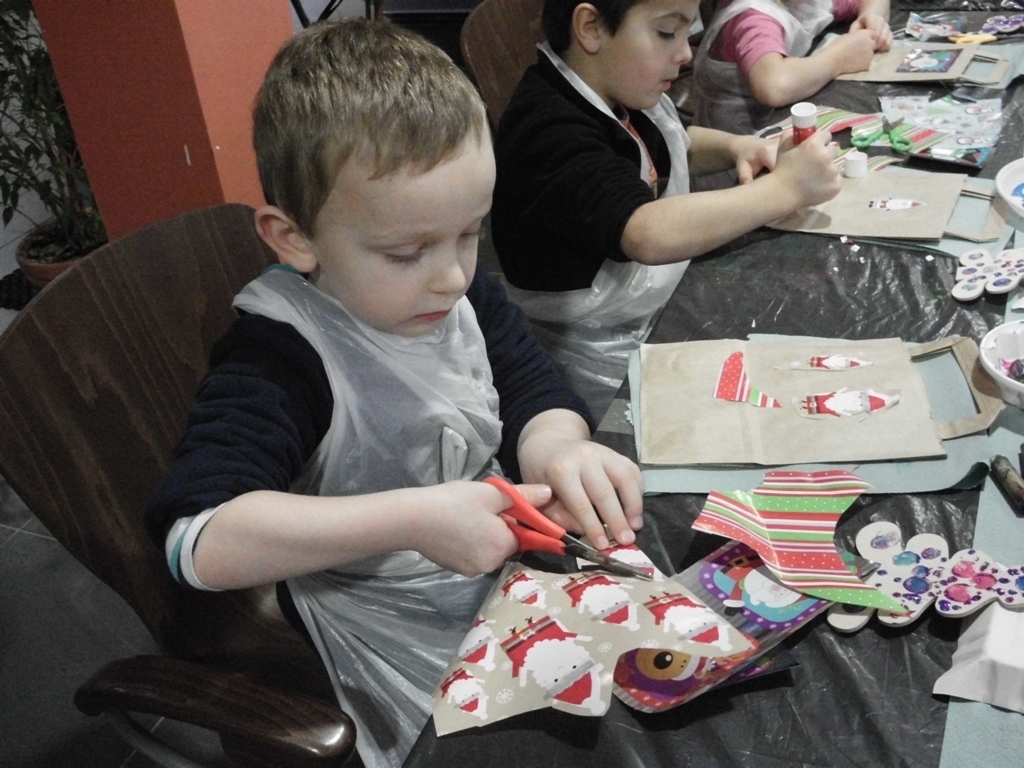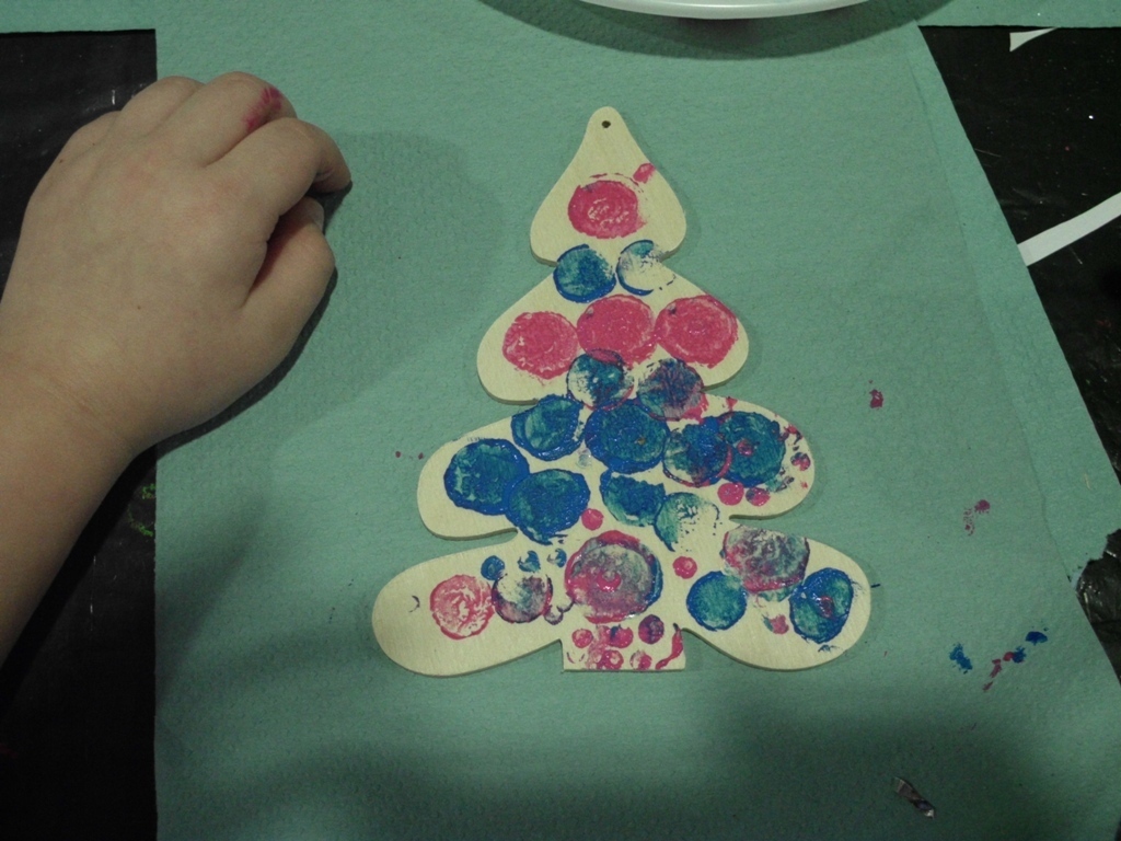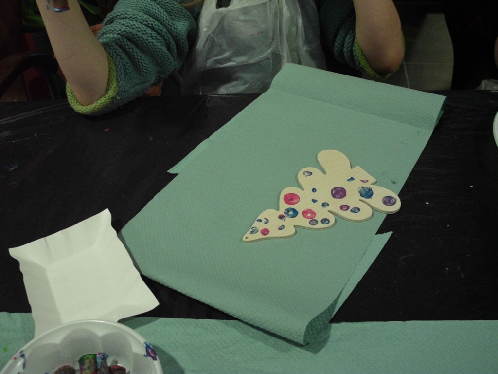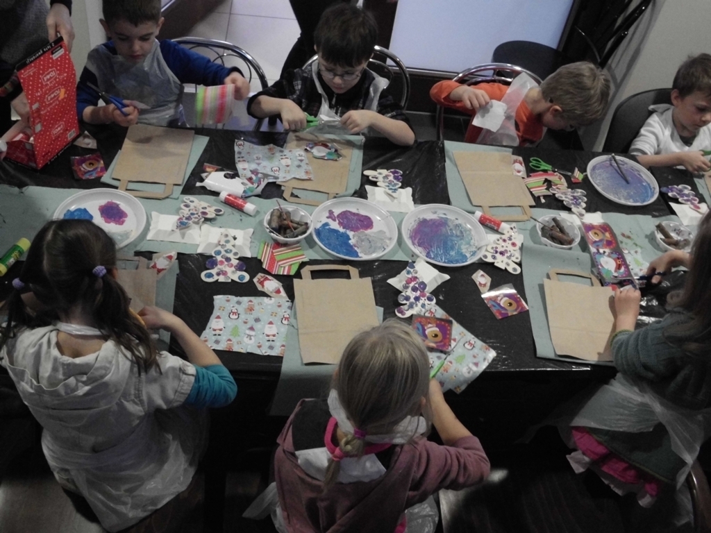 Zadaniem każdego dziecka było pomalowanie drewnianej choinki za pomocą akrylowych farb i patyczków różnej szerokości. Na choinkach powstawały wymyślne wzory i szlaczki. Podczas gdy jedna strona drzewka schła, dzieci mogły się zająć przygotowaniem świątecznych torebek, w których będą zabierane choinki. Z kolorowego, ozdobnego papieru wycinaliśmy przeróżne wzory i kształty, które naklejaliśmy na przygotowane torebki. Po wykonaniu tego zadania wróciliśmy do ozdabiania drugiej strony choinek.