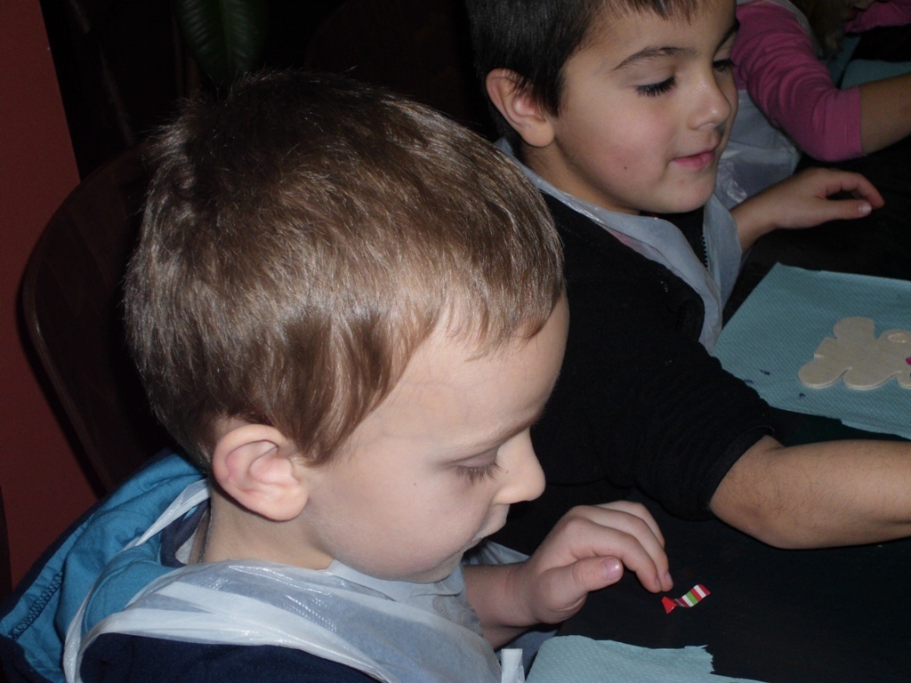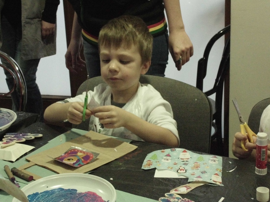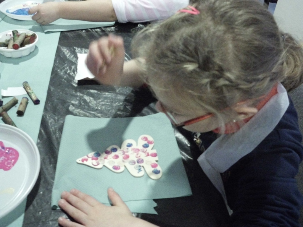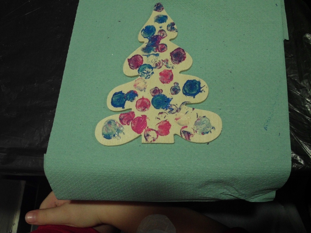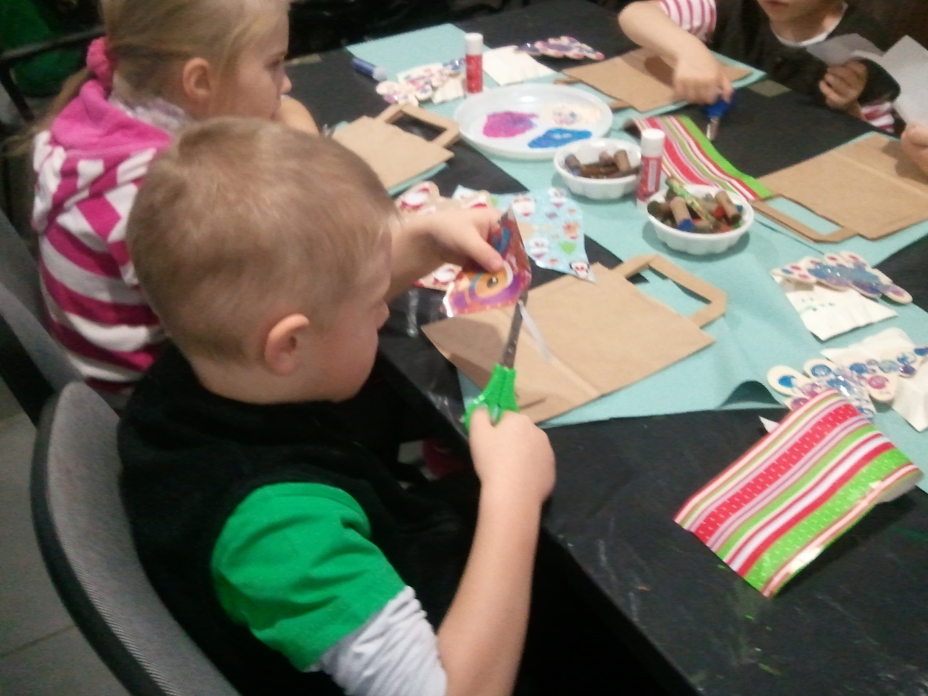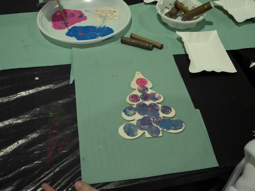 Zadaniem każdego dziecka było pomalowanie drewnianej choinki za pomocą akrylowych farb i patyczków różnej szerokości. Na choinkach powstawały wymyślne wzory i szlaczki. Podczas gdy jedna strona drzewka schła, dzieci mogły się zająć przygotowaniem świątecznych torebek, w których będą zabierane choinki. Z kolorowego, ozdobnego papieru wycinaliśmy przeróżne wzory i kształty, które naklejaliśmy na przygotowane torebki. Po wykonaniu tego zadania wróciliśmy do ozdabiania drugiej strony choinek.