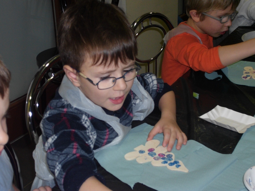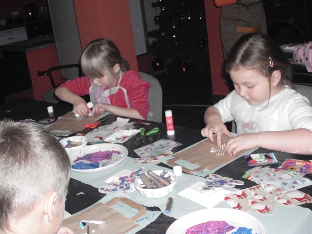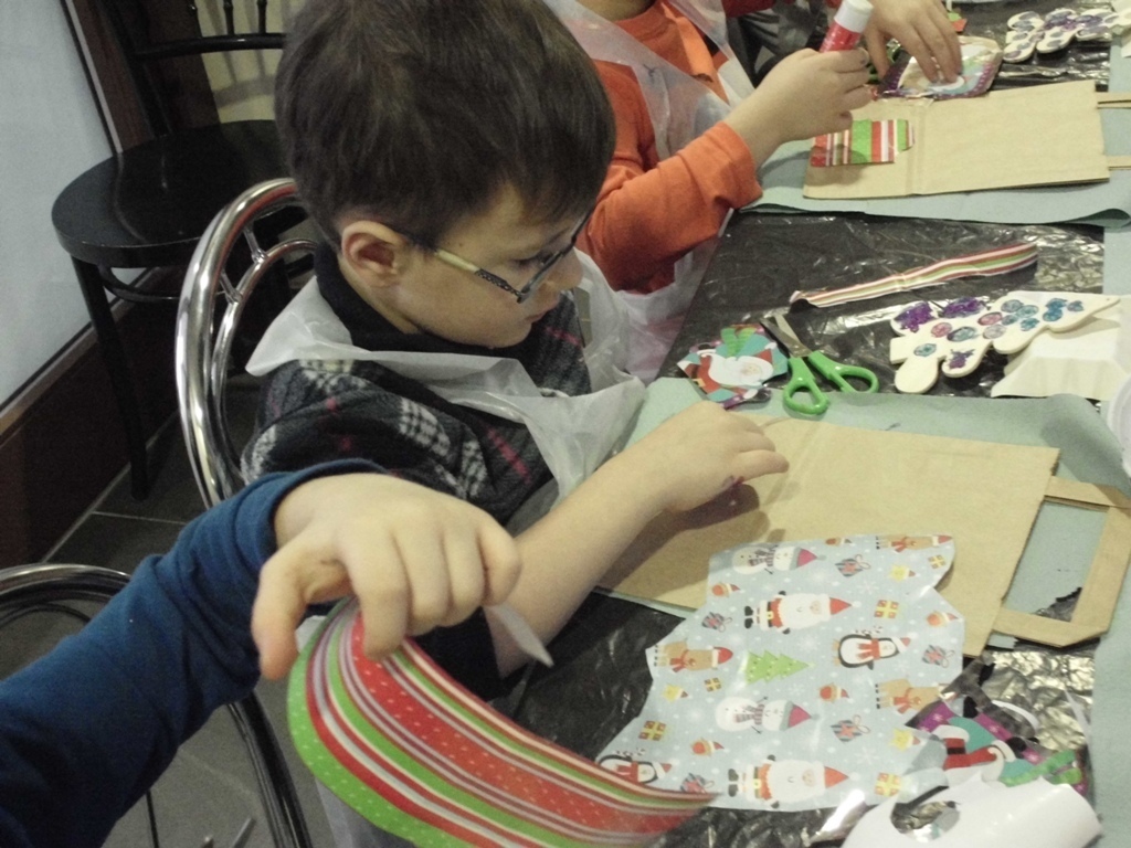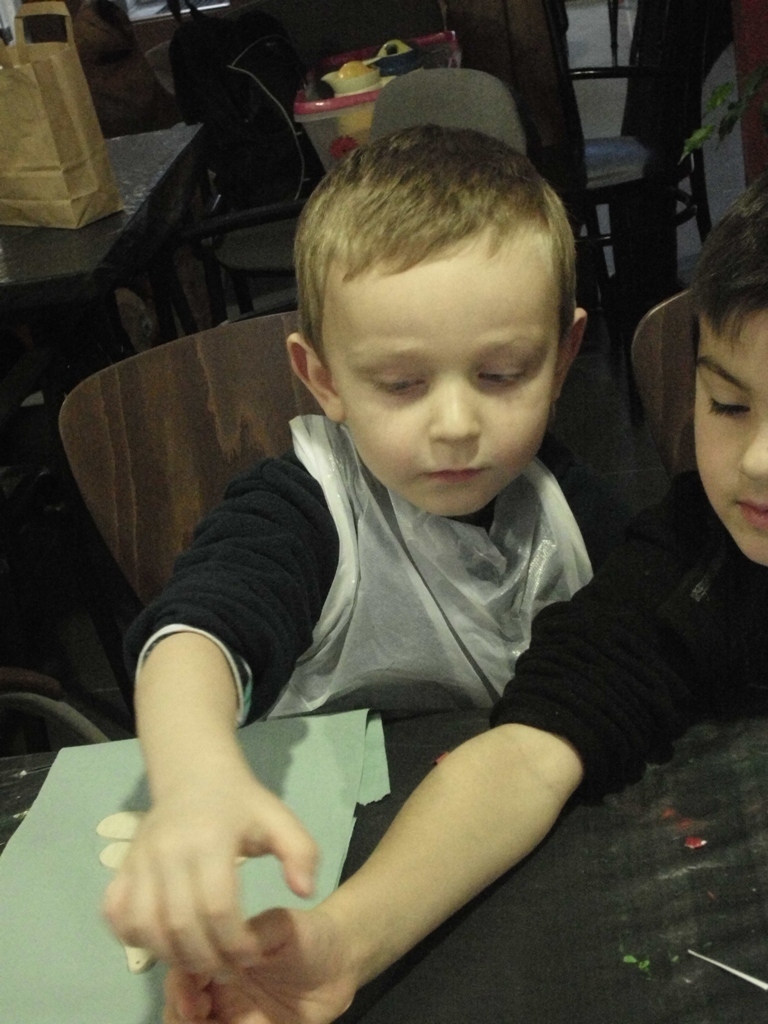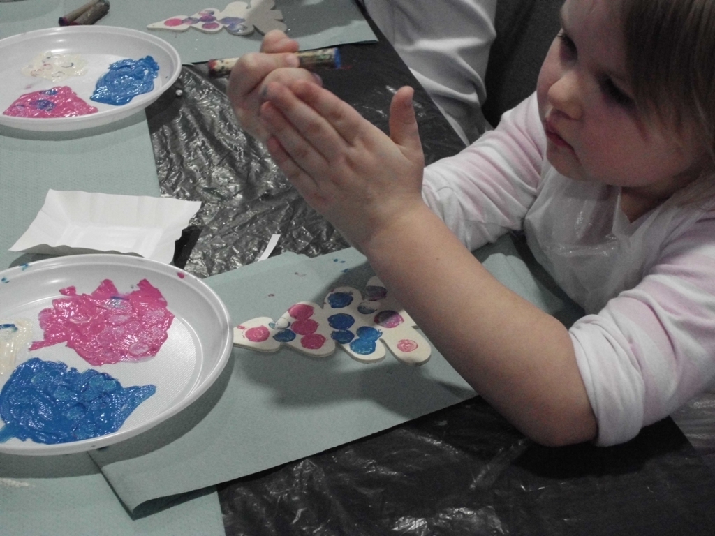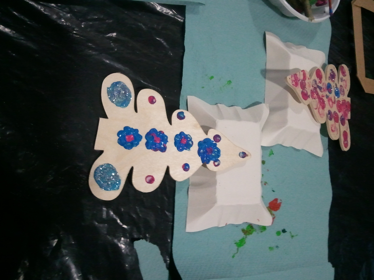 Zadaniem każdego dziecka było pomalowanie drewnianej choinki za pomocą akrylowych farb i patyczków różnej szerokości. Na choinkach powstawały wymyślne wzory i szlaczki. Podczas gdy jedna strona drzewka schła, dzieci mogły się zająć przygotowaniem świątecznych torebek, w których będą zabierane choinki. Z kolorowego, ozdobnego papieru wycinaliśmy przeróżne wzory i kształty, które naklejaliśmy na przygotowane torebki. Po wykonaniu tego zadania wróciliśmy do ozdabiania drugiej strony choinek.