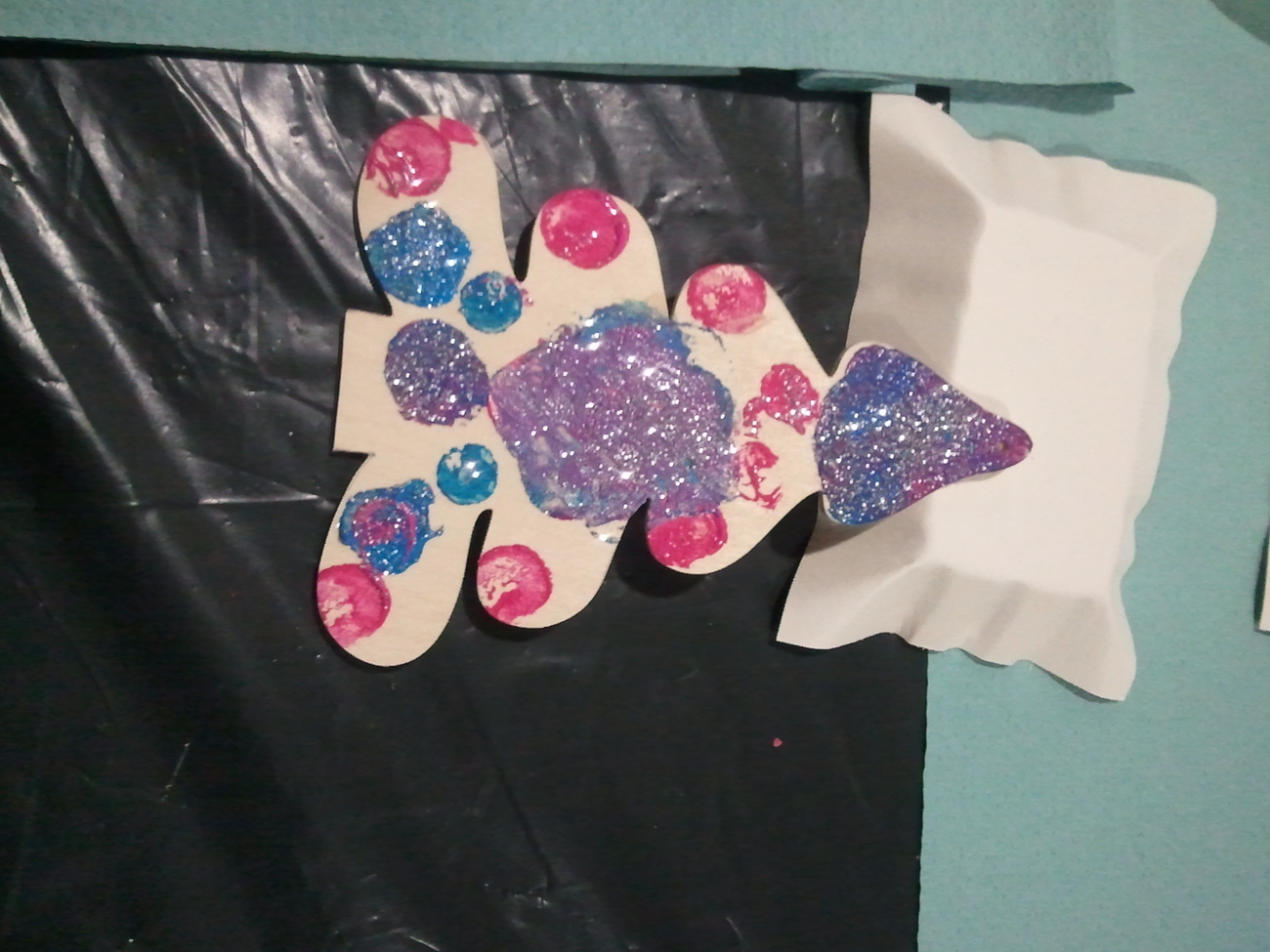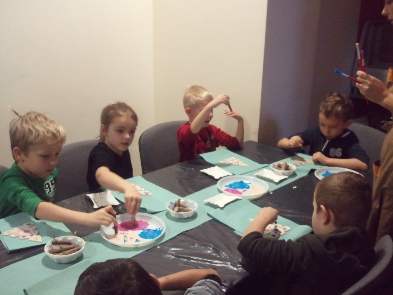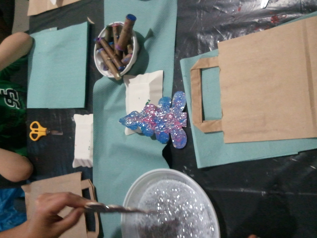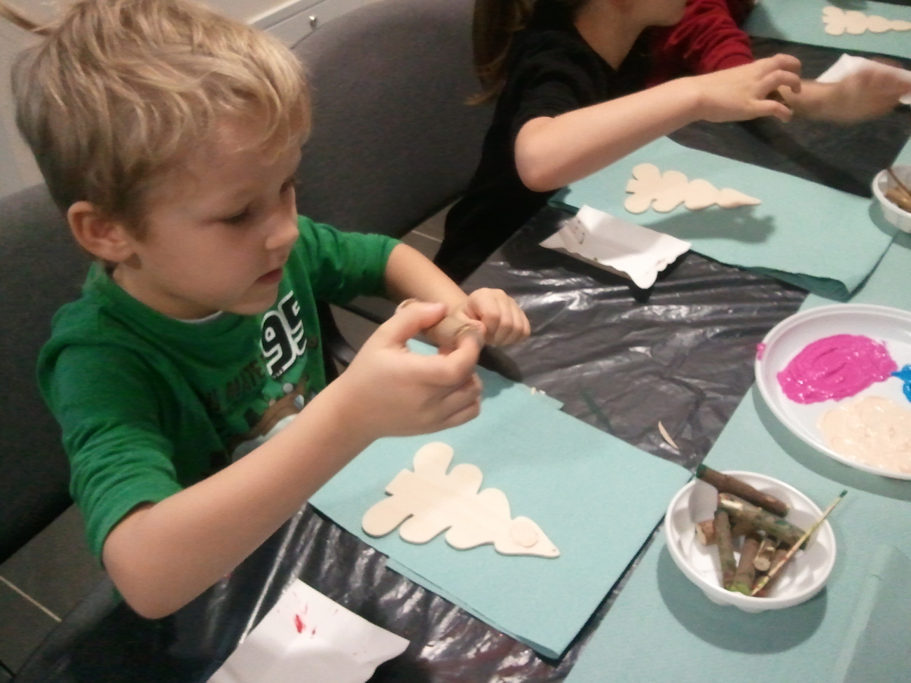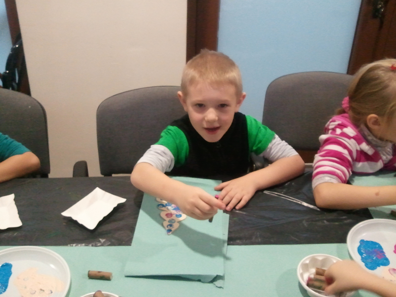 Zadaniem każdego dziecka było pomalowanie drewnianej choinki za pomocą akrylowych farb i patyczków różnej szerokości. Na choinkach powstawały wymyślne wzory i szlaczki. Podczas gdy jedna strona drzewka schła, dzieci mogły się zająć przygotowaniem świątecznych torebek, w których będą zabierane choinki. Z kolorowego, ozdobnego papieru wycinaliśmy przeróżne wzory i kształty, które naklejaliśmy na przygotowane torebki. Po wykonaniu tego zadania wróciliśmy do ozdabiania drugiej strony choinek.
