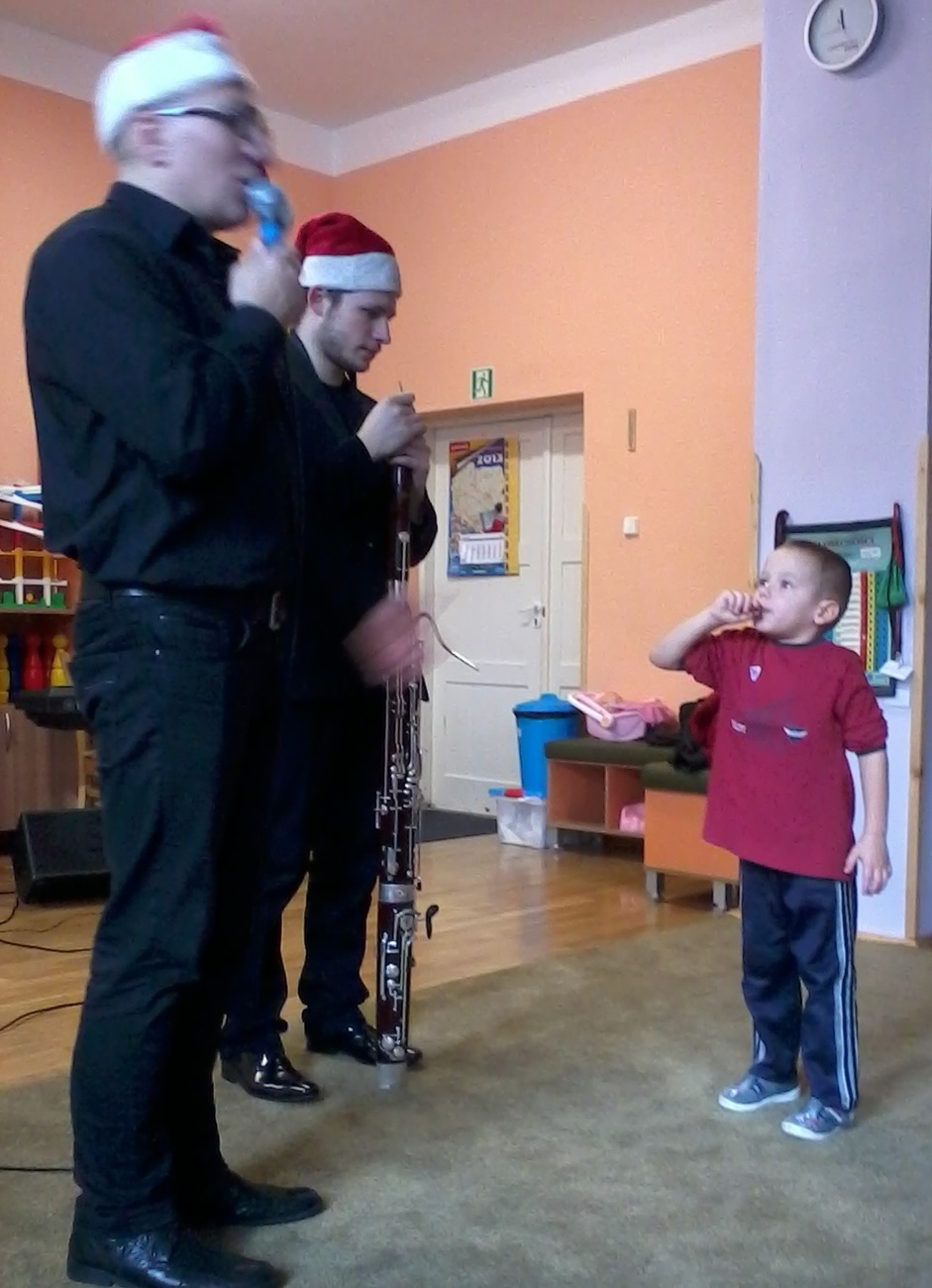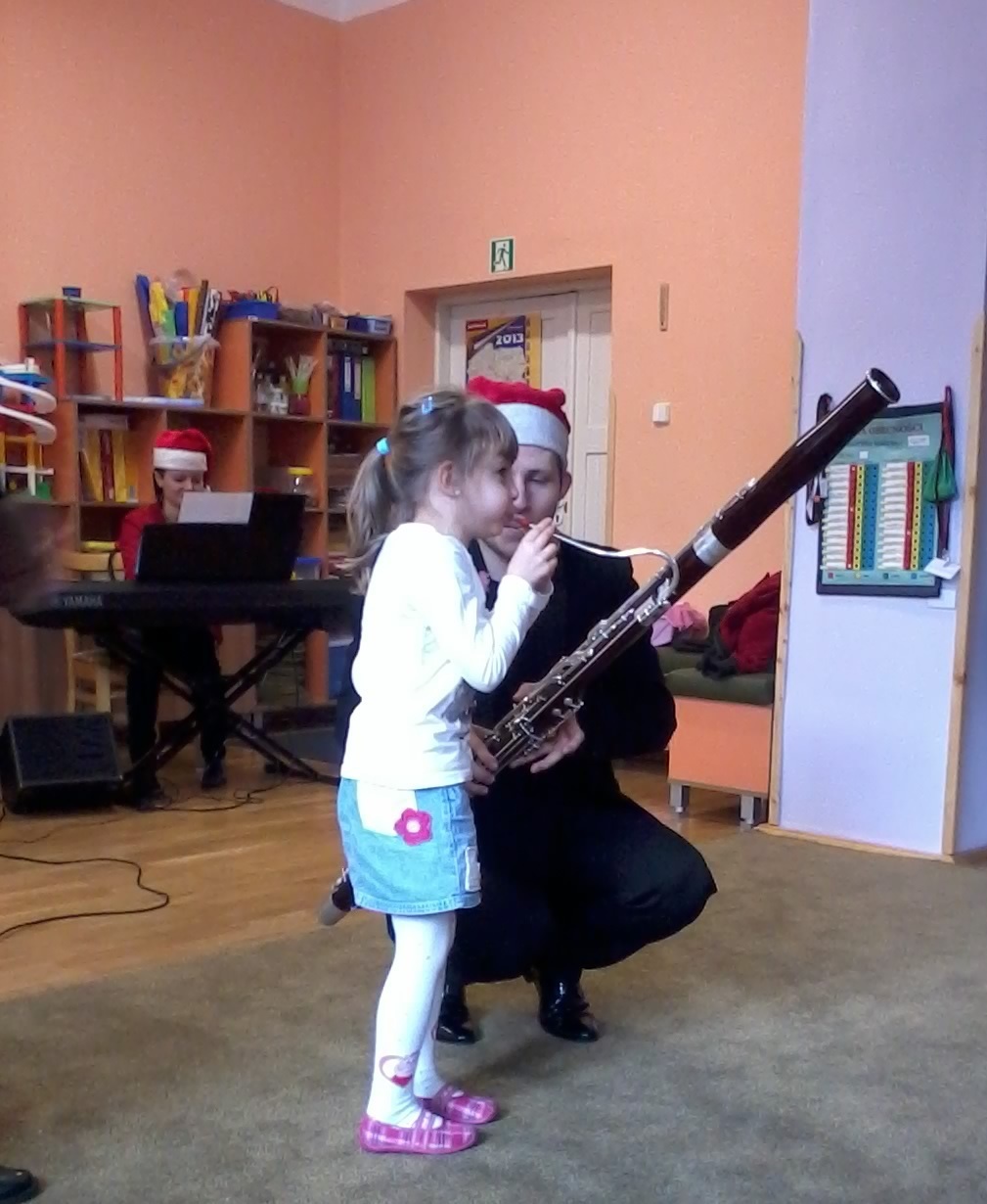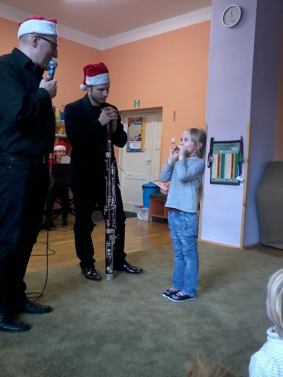 Jeśli święta to oczywiście obecne muszą być również renifery. Nie trzeba było długo czekać na chętnych do tej roli. Szybko jednak okazało się, że niezbędny będzie Mikołaj. Tanecznym krokiem do akcji wkroczyła Pani Mikołajowa - Klaudia :) Dla odmiany to ona, zabrała "renifery" na krótki spacer. Poznaliśmy także nowy instrument - fagot, który jak się okazało wymaga dużo siły. Przedszkolaki miały okazję dmuchać co sił w płucach, by wydobyć z niego dźwięk, a udało się to nielicznym.