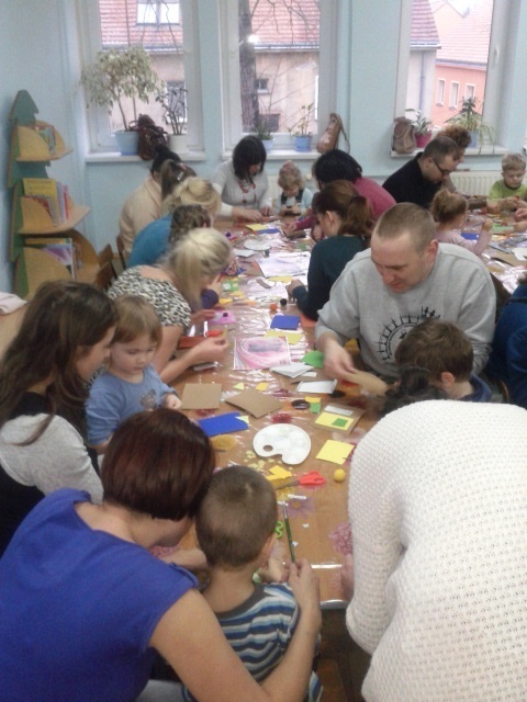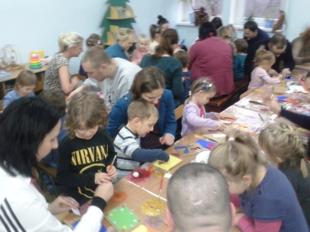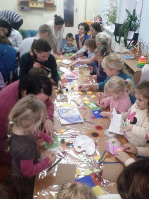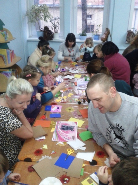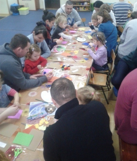 Nasze Żabki cały dzień były bardzo ciekawe, co będziemy robić z rodzicami. Stoły nakryte ceratami, klej i inne materiały plastyczne zdradziły cel spotkania. Przedszkolaki z pomocą rodziców tworzyły własne, niepowtarzalne zaproszenia na uroczystość Dnia Babci i Dziadka. Wszyscy ochoczo zabrali się do pracy. Wszystkie maluchy przejęły inicjatywę przy wykonywaniu pracy, ale „pozwolili” pomagać rodzicom.