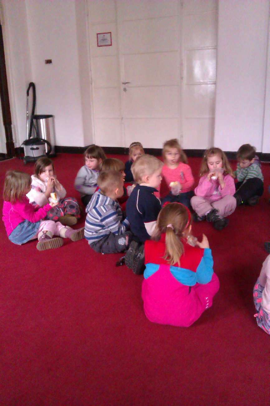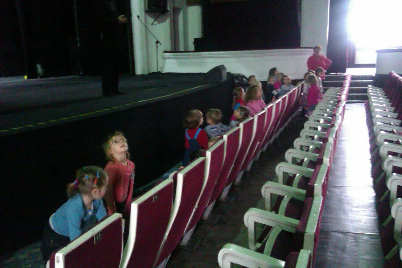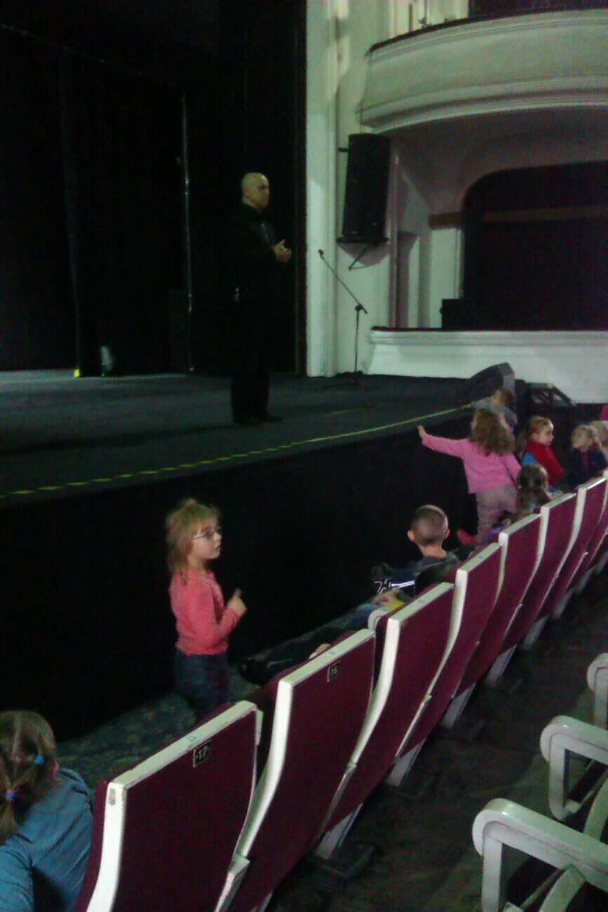 Wreszcie rozpoczęliśmy zwiedzanie. Pan Tadeusz zabrał nas do największej sali, w której odbywają się przedstawienia i tam właśnie nasze przedszkolaki miały swój pierwszy występ na wielkiej scenie.