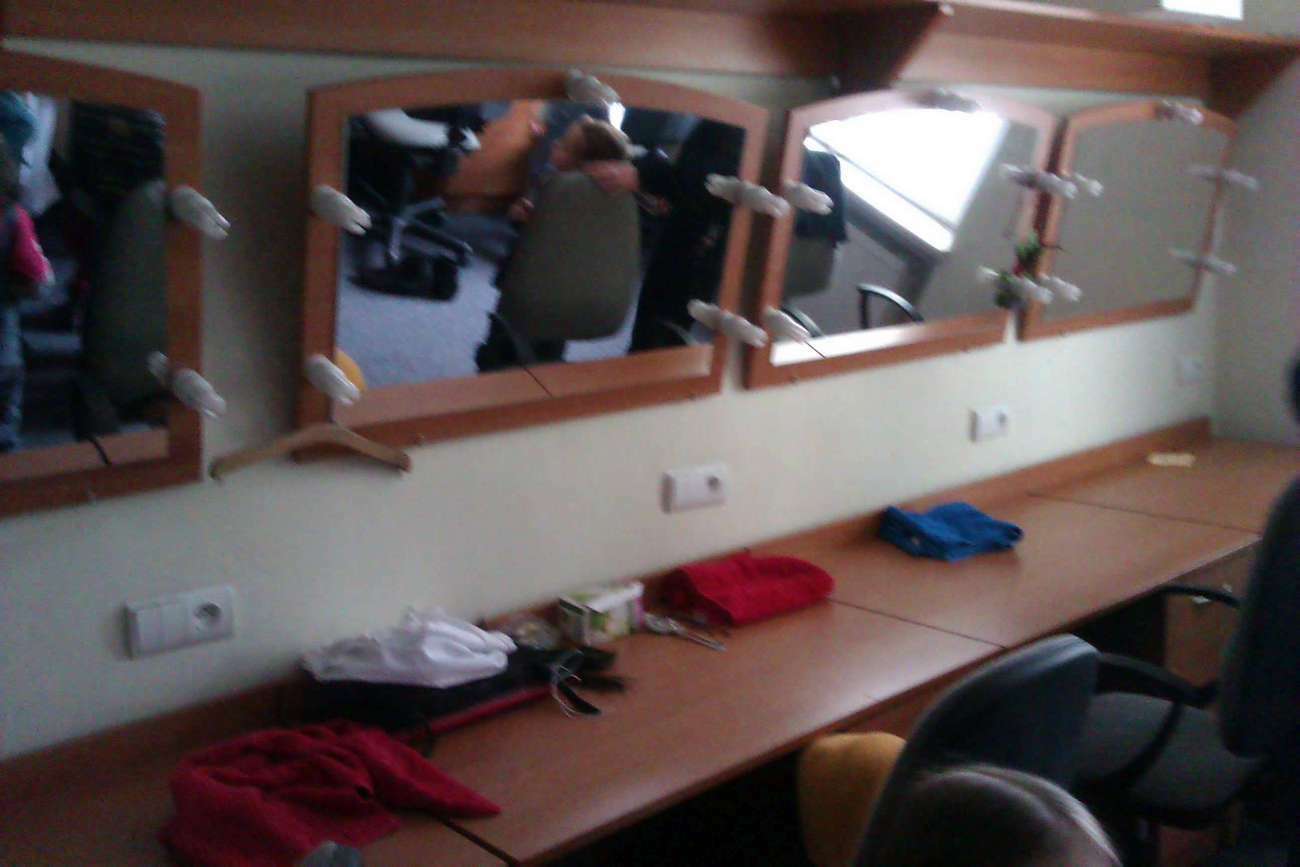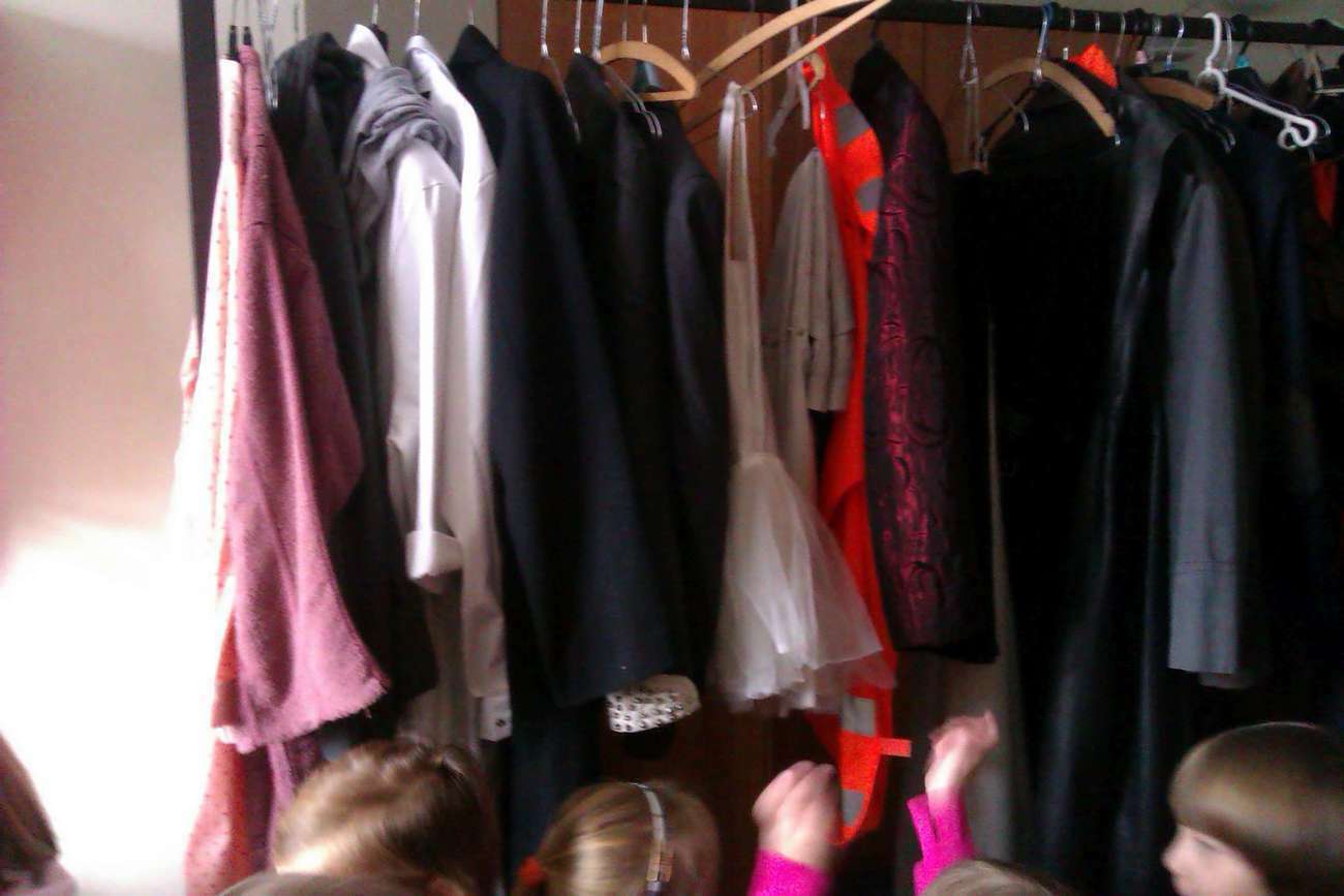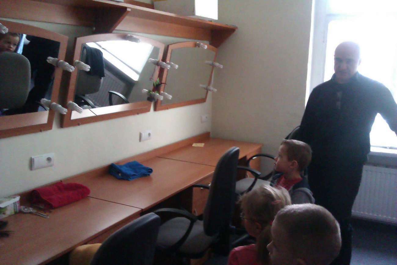 Przedszkolaki mogły nie tylko wejść na scenę, ale również za kulisy. Odwiedziliśmy garderobę i salę, w której aktorzy przygotowują się przed występem. Pan Tadeusz pokazał nam jak w kilka sekund można zmienić swój wizerunek przyklejając sobie wąsy i nakładając perukę :) Trzeba przyznać, że w tym przebraniu wyglądał jak ktoś całkiem inny:) Dowiedzieliśmy się także ile czasu trwa przygotowanie przedstawienia i kto inny oprócz aktorów bierze w nim udział. Zwiedziliśmy także mniejszą salę, gdzie aktorzy są bardzo blisko publiczności.