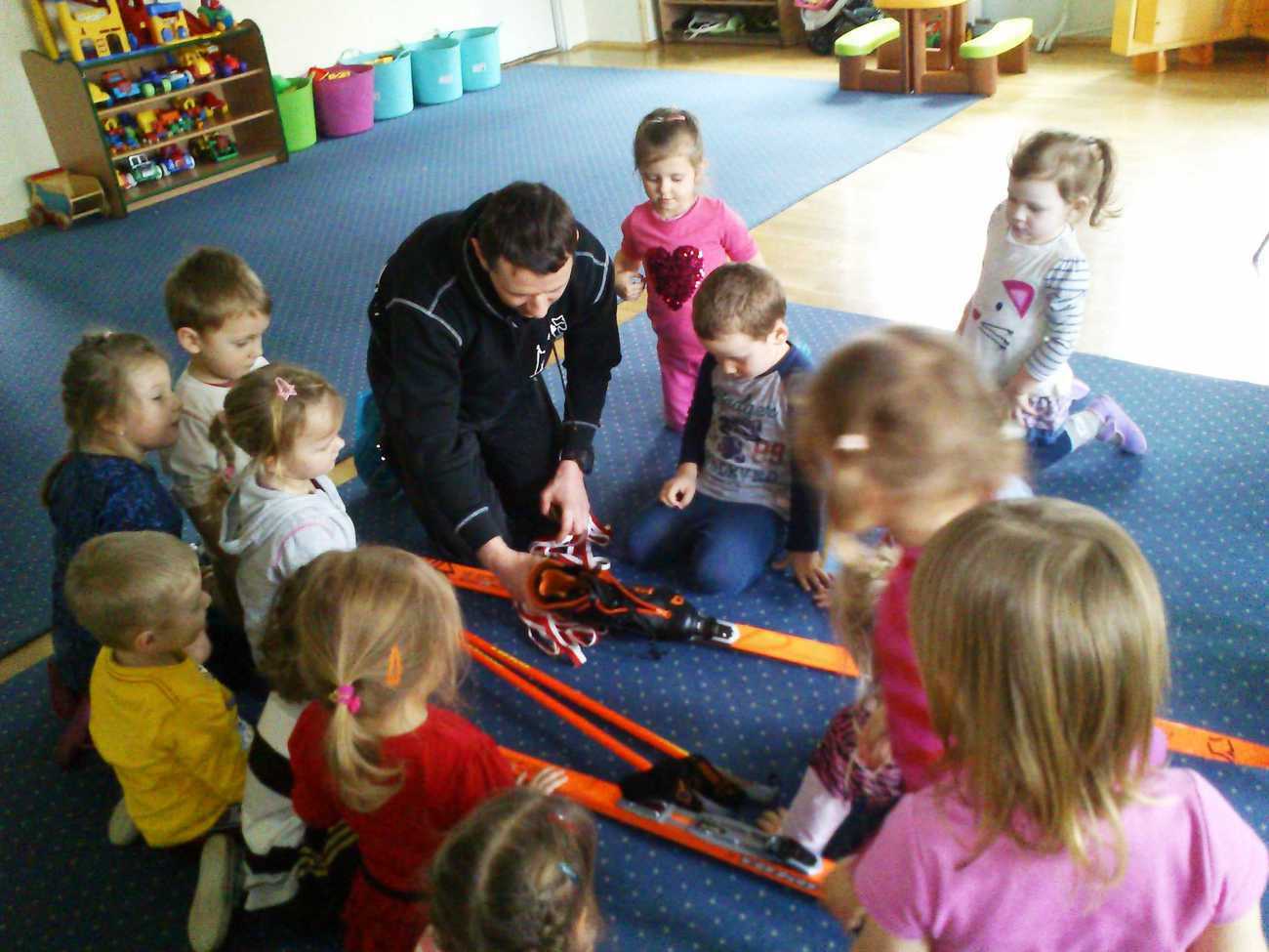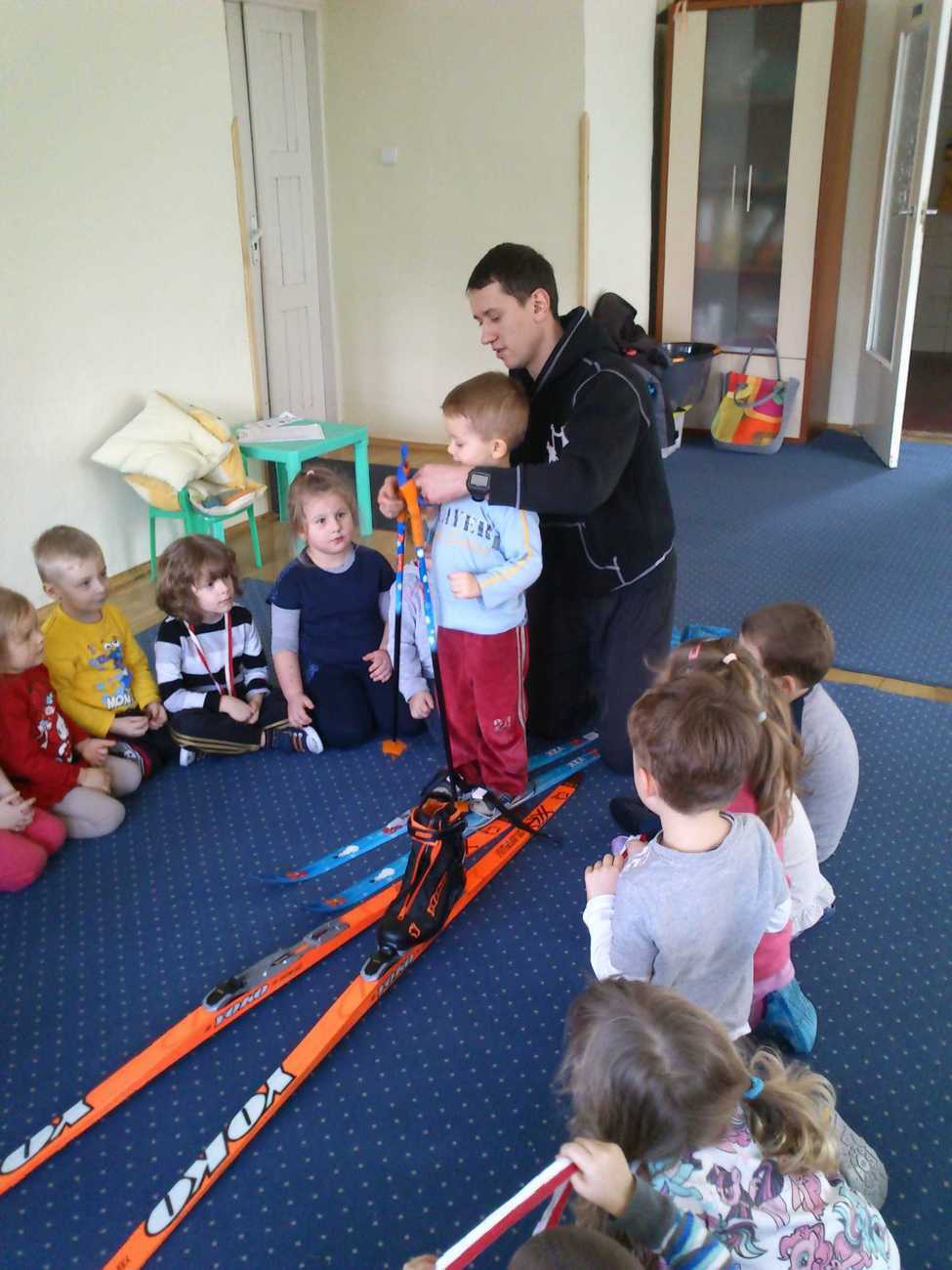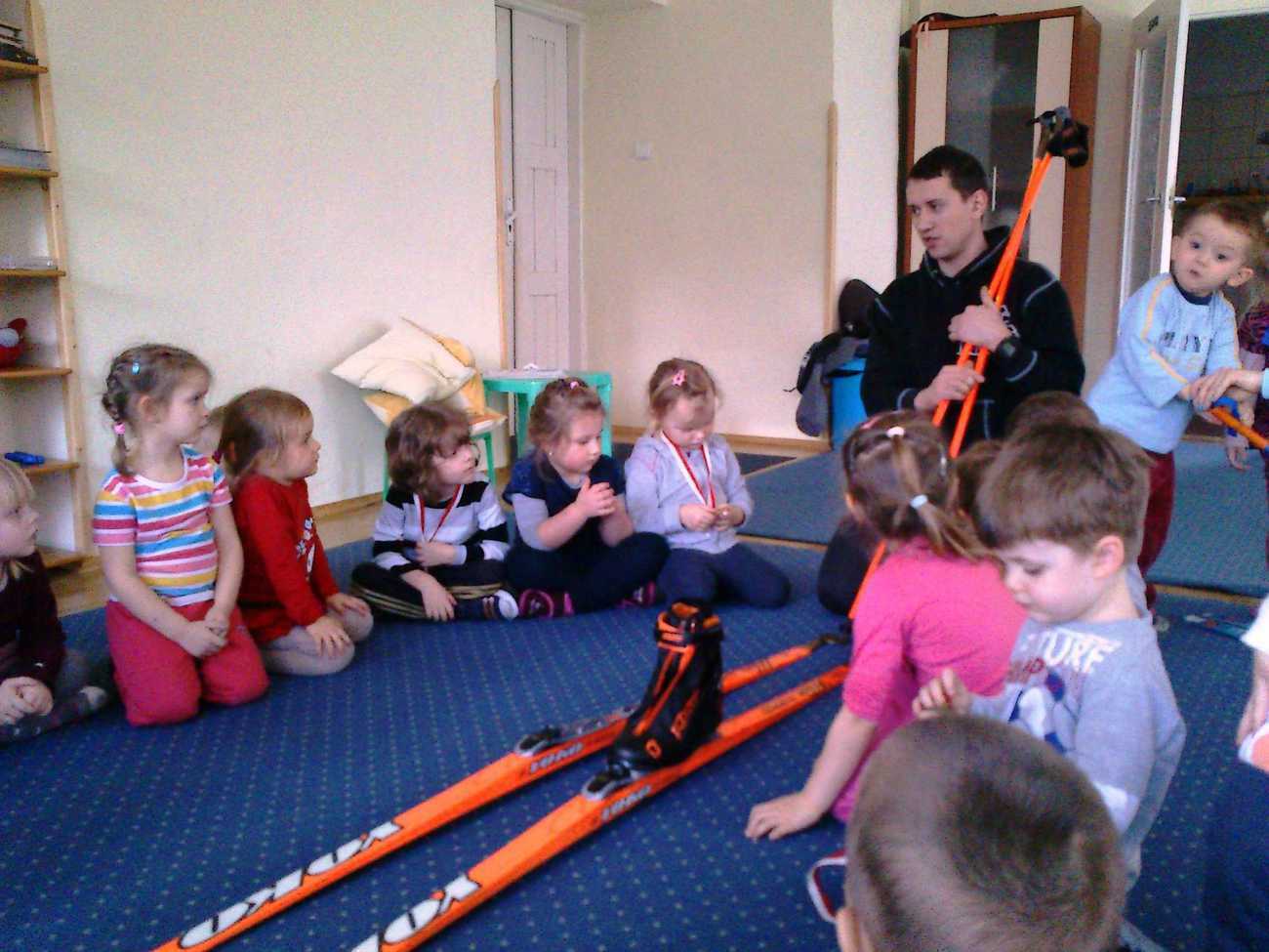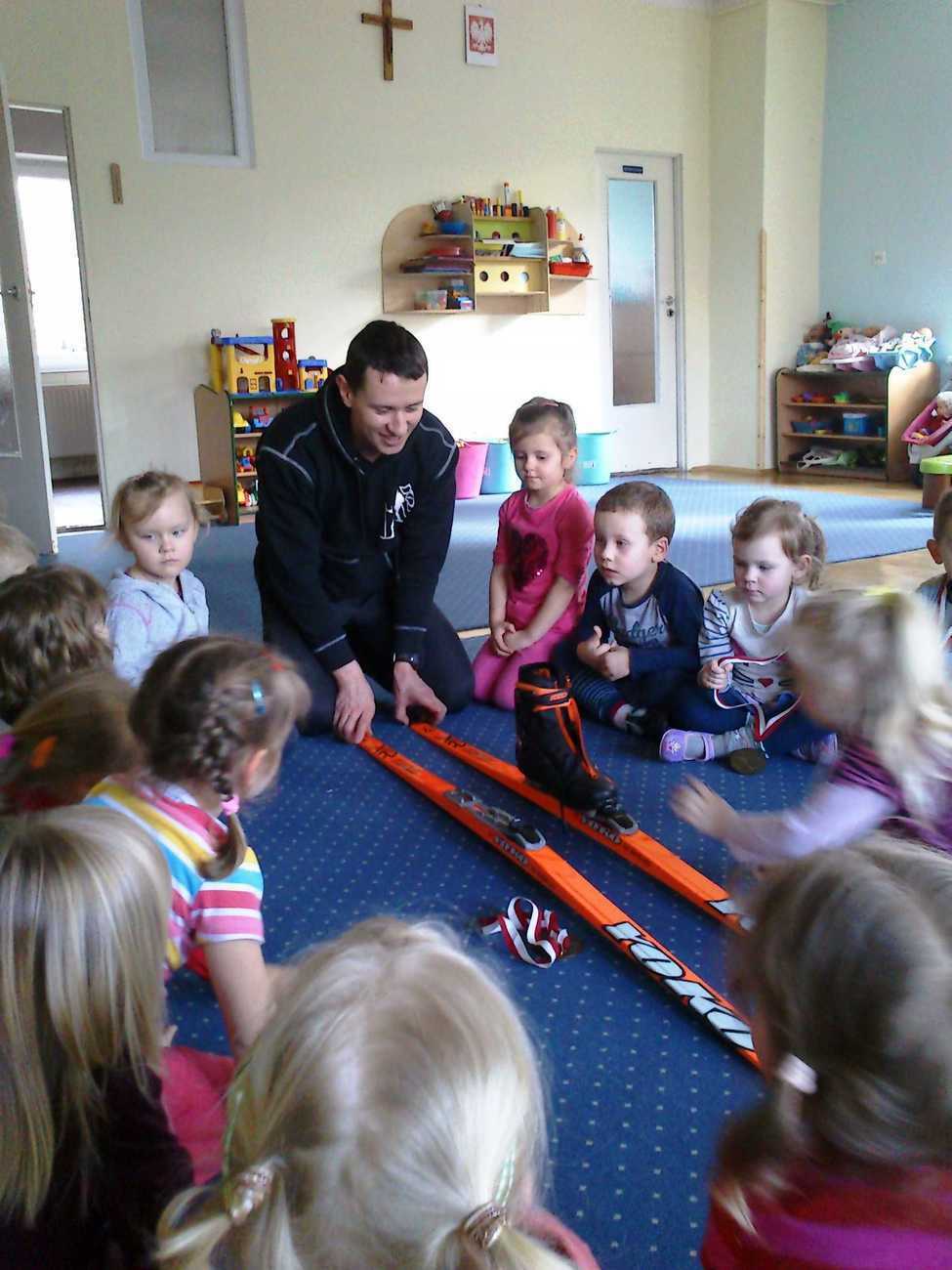 Gr. II miała okazję poznać pana Tomasza Kałużnego, wielokrotnego medalistę Uniwersjady i Mistrzostw Polski. Nasz Gość przyniósł ze sobą sprzęt do biegów narciarskich: narty, obuwie, kije. Pan Tomasz przyniósł również ze sobą narty i kijki w rozmiarze dziecięcym, oraz swoje najcenniejsze, złote medale. Te zrobiły prawdziwą furorę wśród przedszkolaków. Każde z dzieci mogło dotknąć sprzętu narciarskiego. Dowiedzieliśmy się wielu ciekawych informacji zarówno w kwestii uprawianego sportu, jak i olimpiady.
