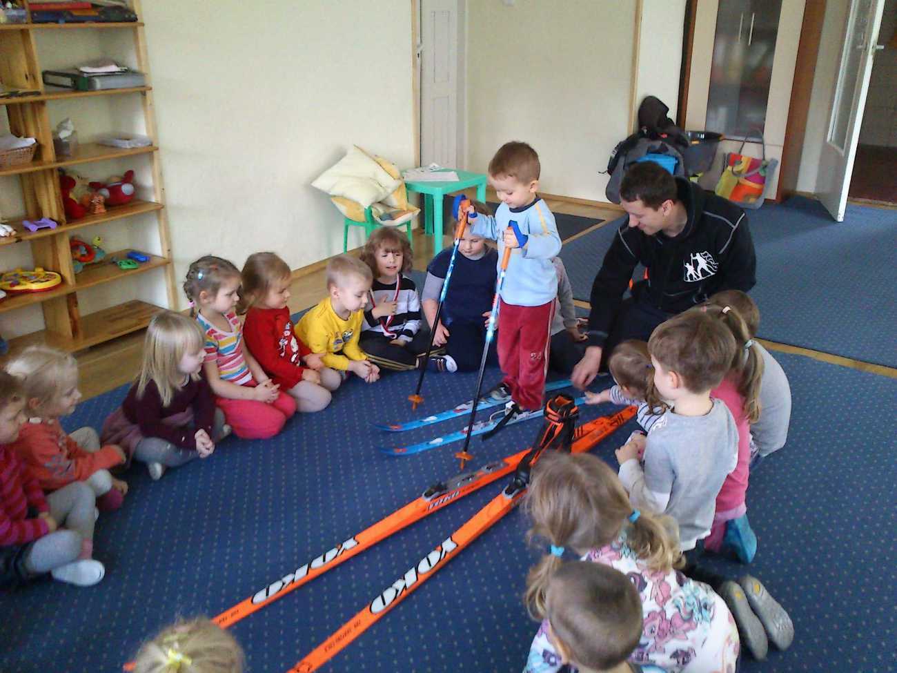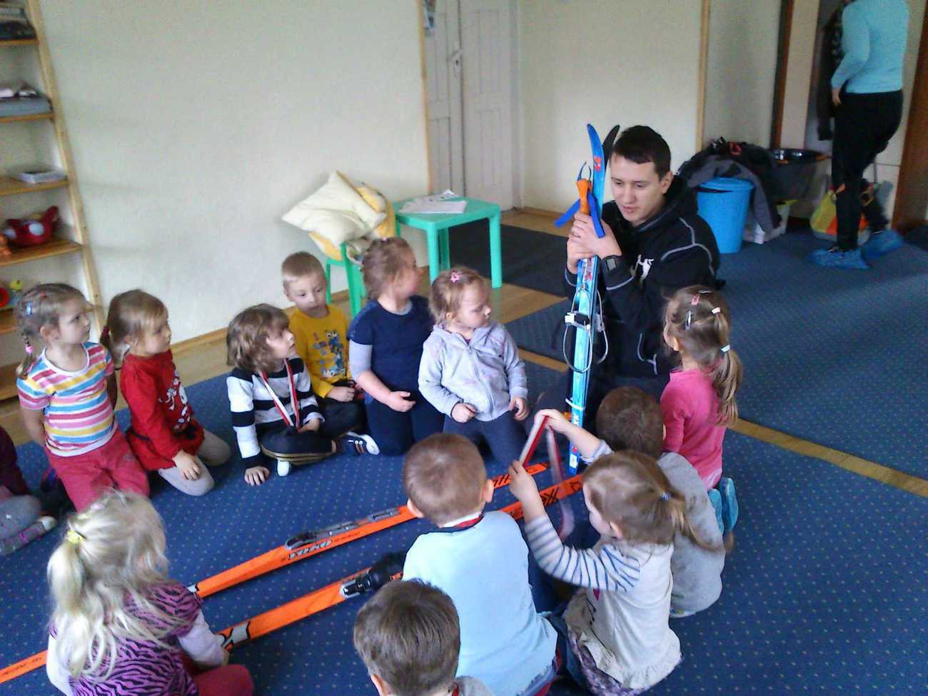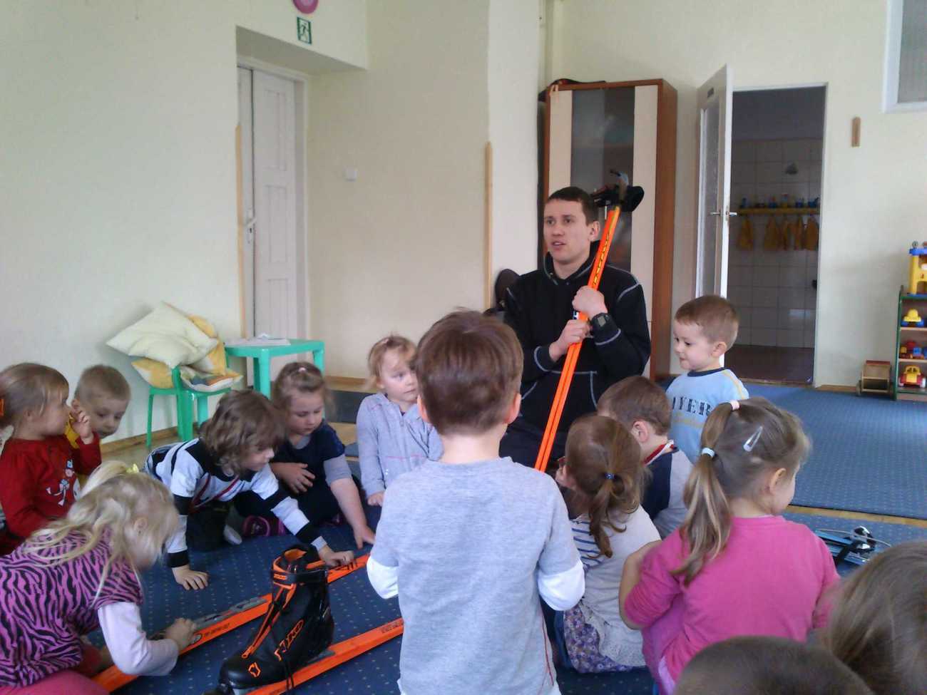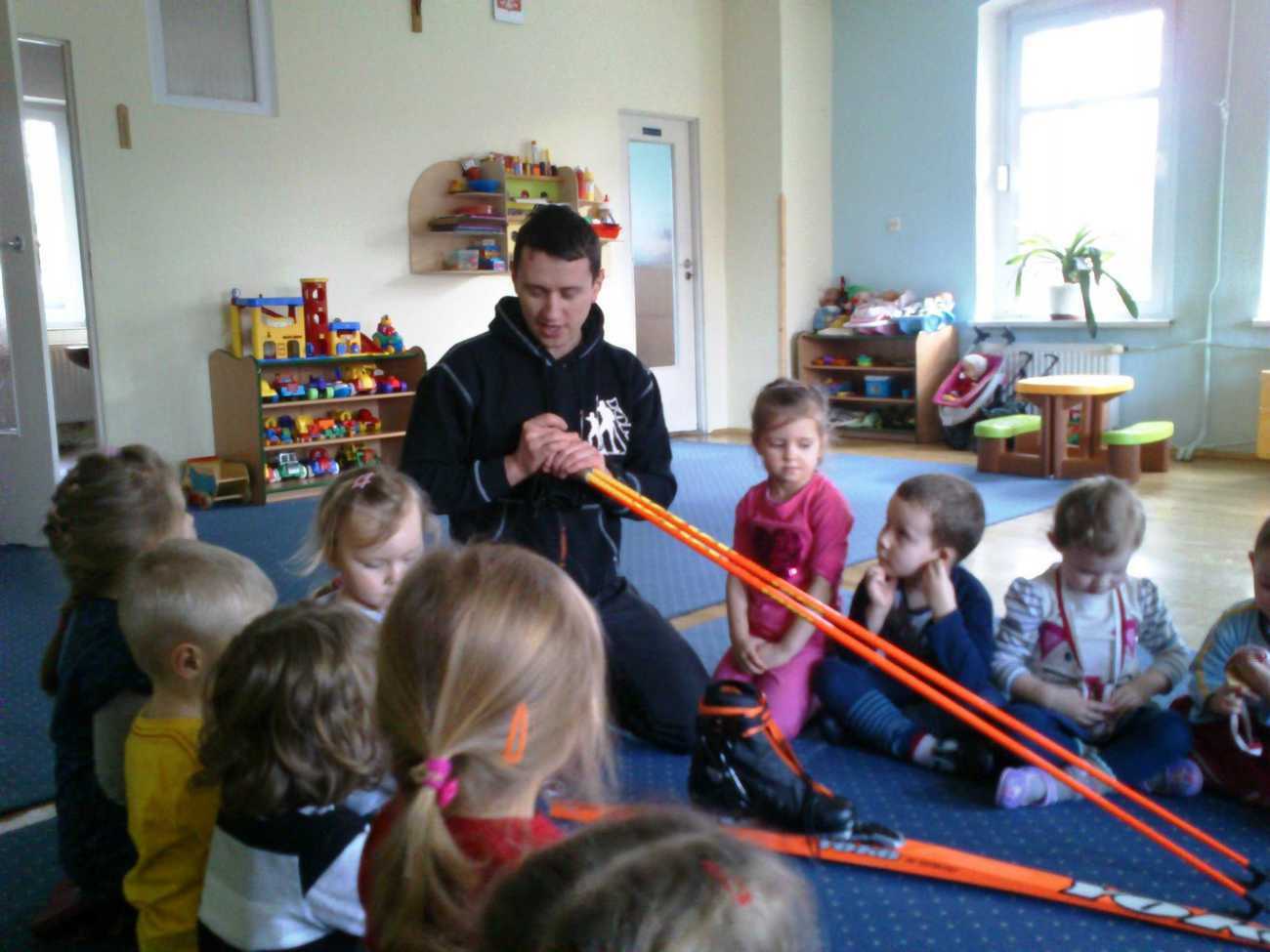 Gr. II miała okazję poznać pana Tomasza Kałużnego, wielokrotnego medalistę Uniwersjady i Mistrzostw Polski. Nasz Gość przyniósł ze sobą sprzęt do biegów narciarskich: narty, obuwie, kije. Pan Tomasz przyniósł również ze sobą narty i kijki w rozmiarze dziecięcym, oraz swoje najcenniejsze, złote medale. Te zrobiły prawdziwą furorę wśród przedszkolaków. Każde z dzieci mogło dotknąć sprzętu narciarskiego. Dowiedzieliśmy się wielu ciekawych informacji zarówno w kwestii uprawianego sportu, jak i olimpiady.