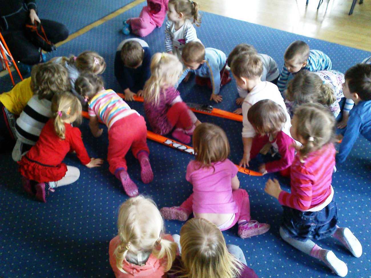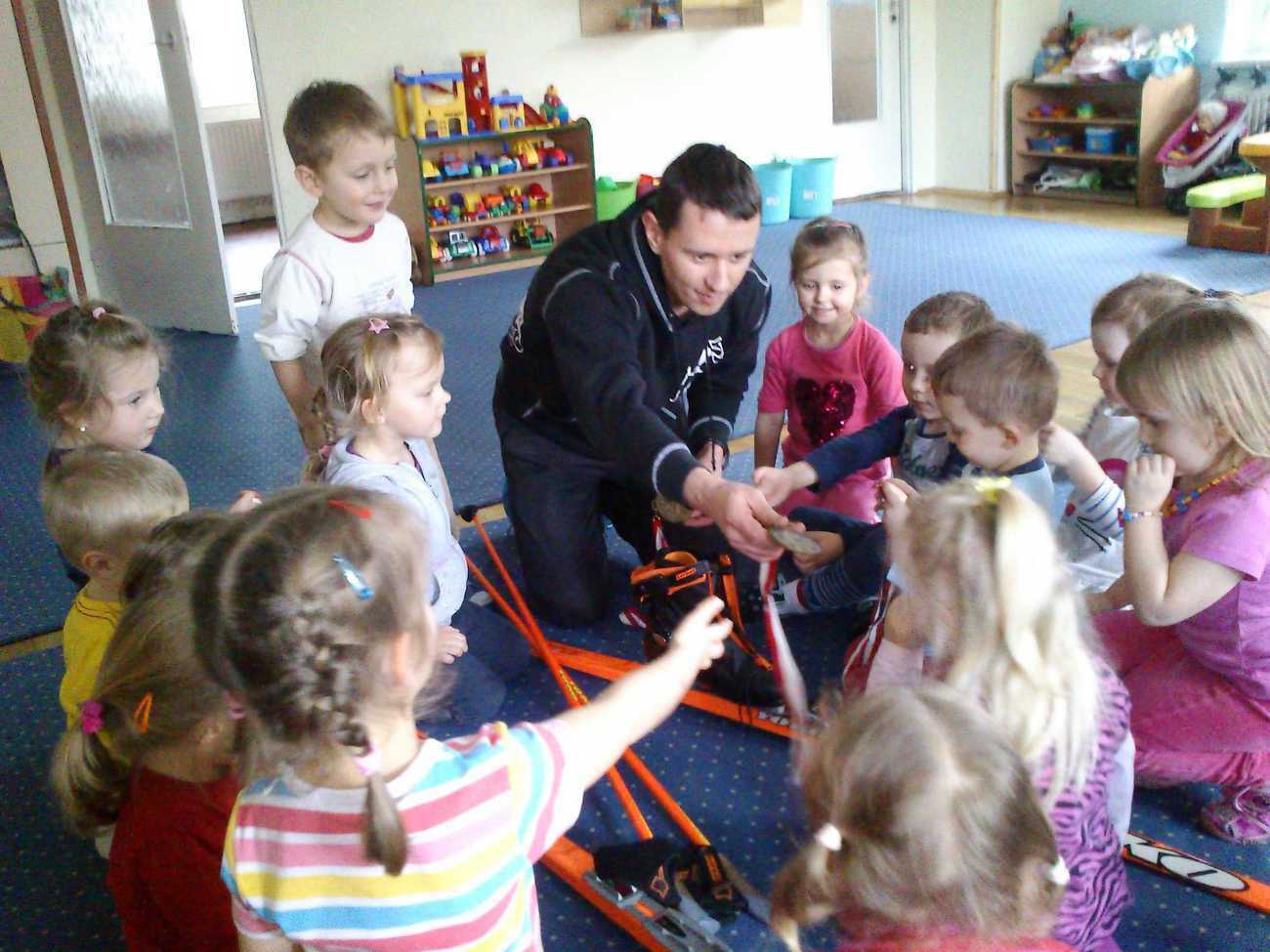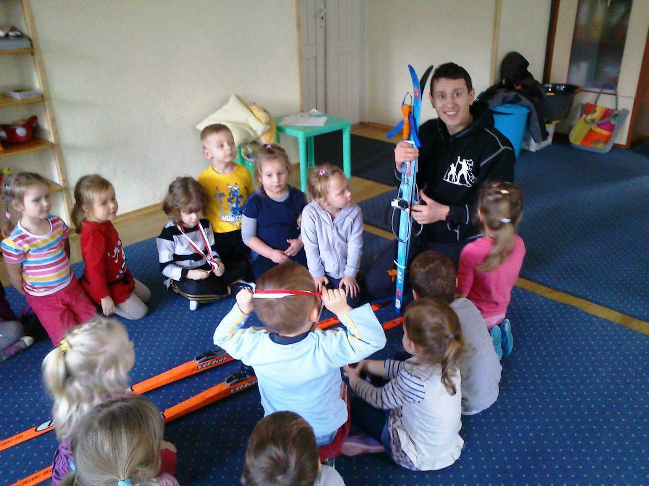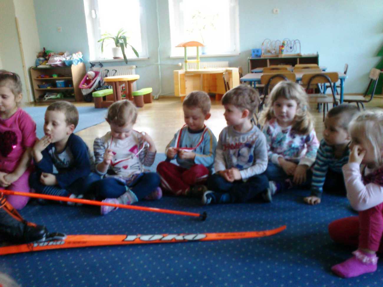 Gr. II miała okazję poznać pana Tomasza Kałużnego, wielokrotnego medalistę Uniwersjady i Mistrzostw Polski. Nasz Gość przyniósł ze sobą sprzęt do biegów narciarskich: narty, obuwie, kije. Pan Tomasz przyniósł również ze sobą narty i kijki w rozmiarze dziecięcym, oraz swoje najcenniejsze, złote medale. Te zrobiły prawdziwą furorę wśród przedszkolaków. Każde z dzieci mogło dotknąć sprzętu narciarskiego. Dowiedzieliśmy się wielu ciekawych informacji zarówno w kwestii uprawianego sportu, jak i olimpiady.
