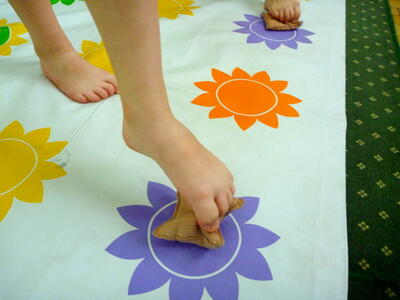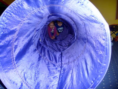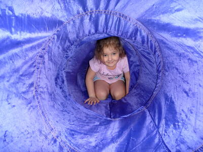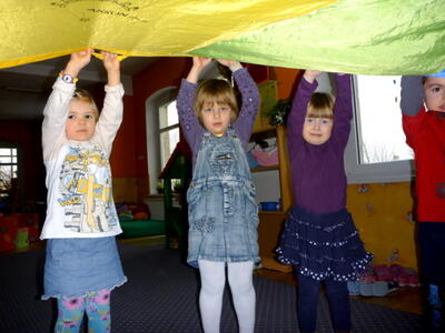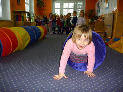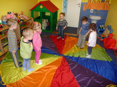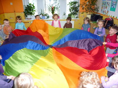 Podczas zajęć z gimnastyki wykorzystujemy wiele akcesoriów: woreczki, szarfy, małe i duże obręcze, liny, chustę animacyjną, tunele, plansze o wymiarach 3m x 3m.